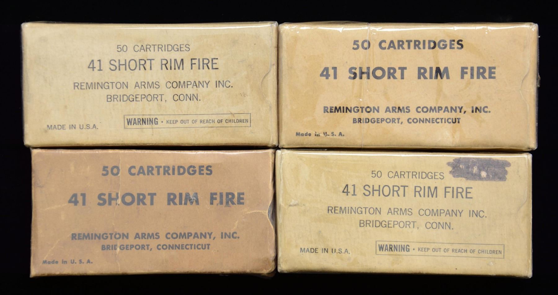 AMMUNITION. Lot of 4 boxes 50-rd. boxes of Remington Arms Company .41 Short Rimfire ammunition. 1 box is partially full, retaining 25-rds. Exterior of 2 boxes is marked with black sharpie. CONDITION: 3 boxes are very good overall, exhibiting light to mild wear and age related discoloration. Partial box exhibits wear and tearing, with tearing to the end flaps. Projectiles in opened boxes exhibit white oxidation, with cases exhibiting age related discoloration. (02-23284/MLW). $300-500.