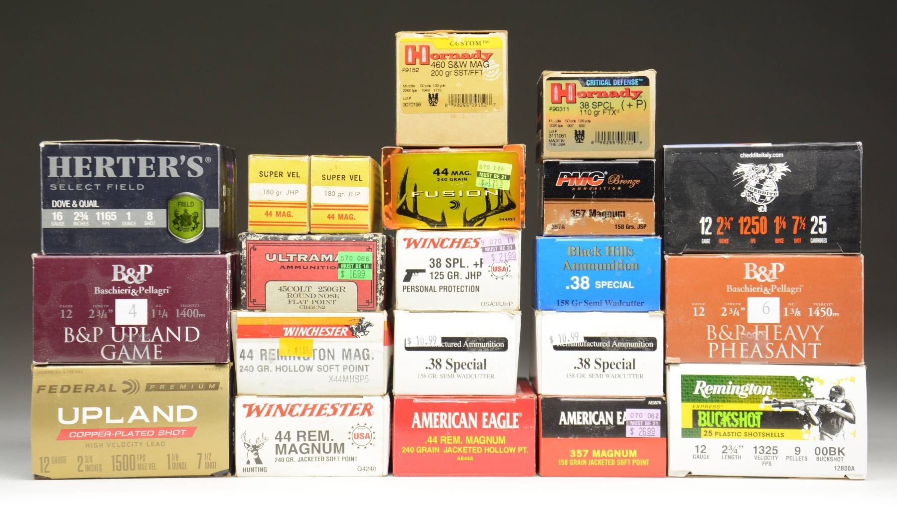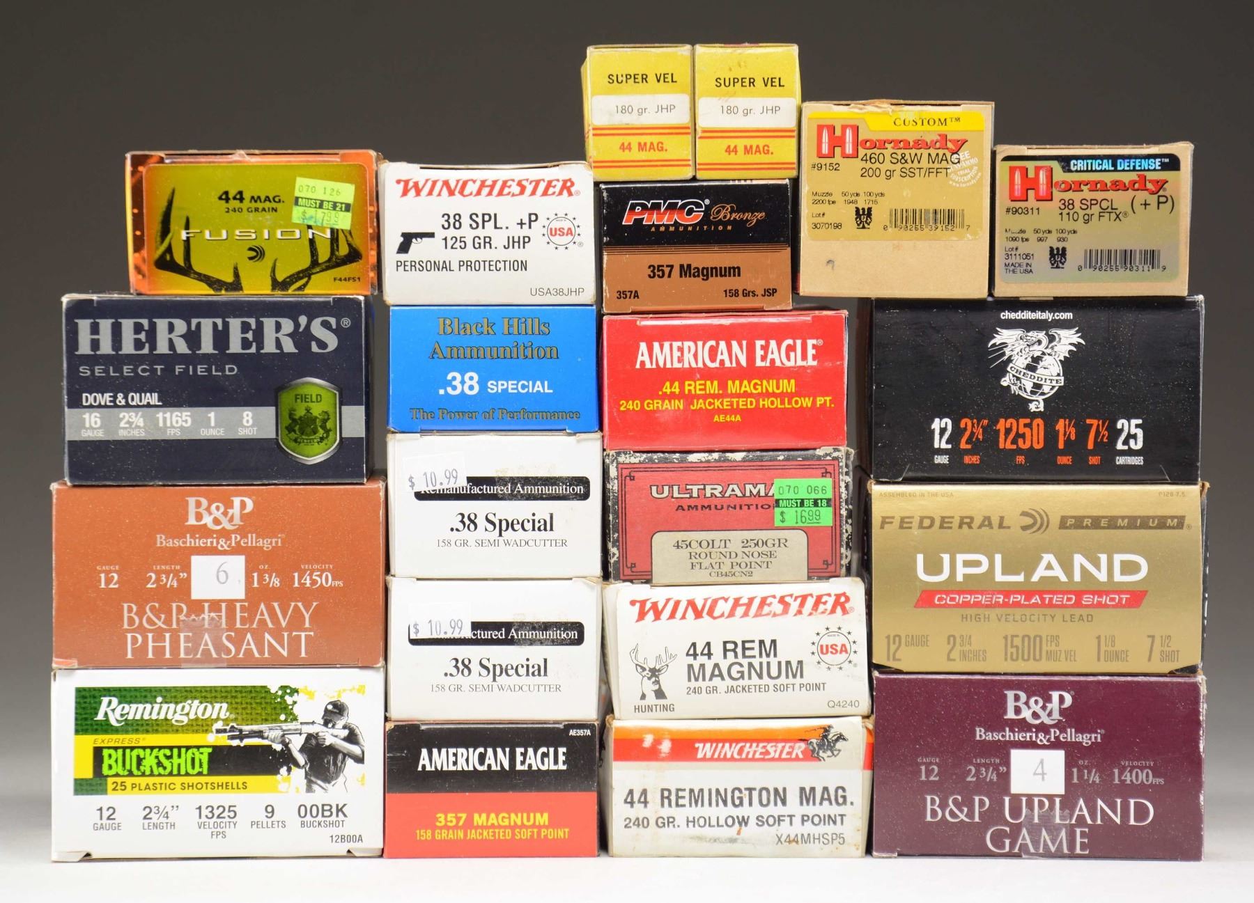 Lot of assorted revolver and shotgun ammunition, including: 1) 1 50-rd. box of Federal American Eagle .357 Magnum 158 grain Jacketed Soft Point ammunition. 2) 1 50-rd. box of PMC Bronze .357 Magnum 158 grain Jacketed Soft Point ammunition. 3) 3 50-rd. boxes (150-rds. total) of Black Hills .38 Special 158 grain Semi-Wadcutter ammunition. 4) 1 25-rd. box of Hornady Critical Defense .38 Special +P 110 grain FTX ammunition. 5) 1 50-rd. box (30-rds. remaining) of Winchester .38 Special +P 125 grain Jacketed Hollow Point ammunition. 6) 2 20-rd. boxes (40-rds. total) of Super Vel .44 Magnum 180 grain Jacketed Hollow Point ammunition. 7) 1 50-rd. box of Winchester .44 Remington Magnum 240 grain Jacketed Soft Point ammunition. 8) 1 50-rd. box of Winchester .44 Remington Magnum 240 grain Hollow Soft Point ammunition. 9) 1 50-rd. box of Federal American Eagle .44 Remington Magnum 240 grain Jacketed Hollow Point ammunition. 10) 1 20-rd. box of Federal Fusion .44 Magnum 240 grain ammunition. 11) 1 50-rd. box of UltraMax .45 Colt 250 grain Round Nose Flat Point ammunition. 12) 1 20-rd. box of Hornady Custom 460 S*W Magnum 200 grain SST/FFT ammunition. 13) 1 25-rd. Herter's Dove & Quail 16 GA, 2 3/4" 8 shot ammunition. 14) 1 25-rd. box of B&P Heavy Pheasant 12 GA, 2 3/4" ammunition. 15) 1 25-rd. box of B&P Upland Game 12 GA, 2 3/4" ammunition. 16) 1 25-rd. box of Federal Premium Upland 12 GA, 2 3/4" 7 1/2 shot ammunition. 17) 1 25-rd. box of Remington Express Buckshot 12 GA, 2 3/4" 00 Buck ammunition. 18) 1 25-rd. box of Cheddite Lead Shot Universal 12 GA, 2 3/4" 7 1/2 shot ammunition. CONDITION: ammunition all appears very good and serviceable, with some rds. exhibiting some spots of verdigris. Boxes show varying degrees of wear, but otherwise remain sturdy and serviceable. (02-22868-16/MLW). $300-500.