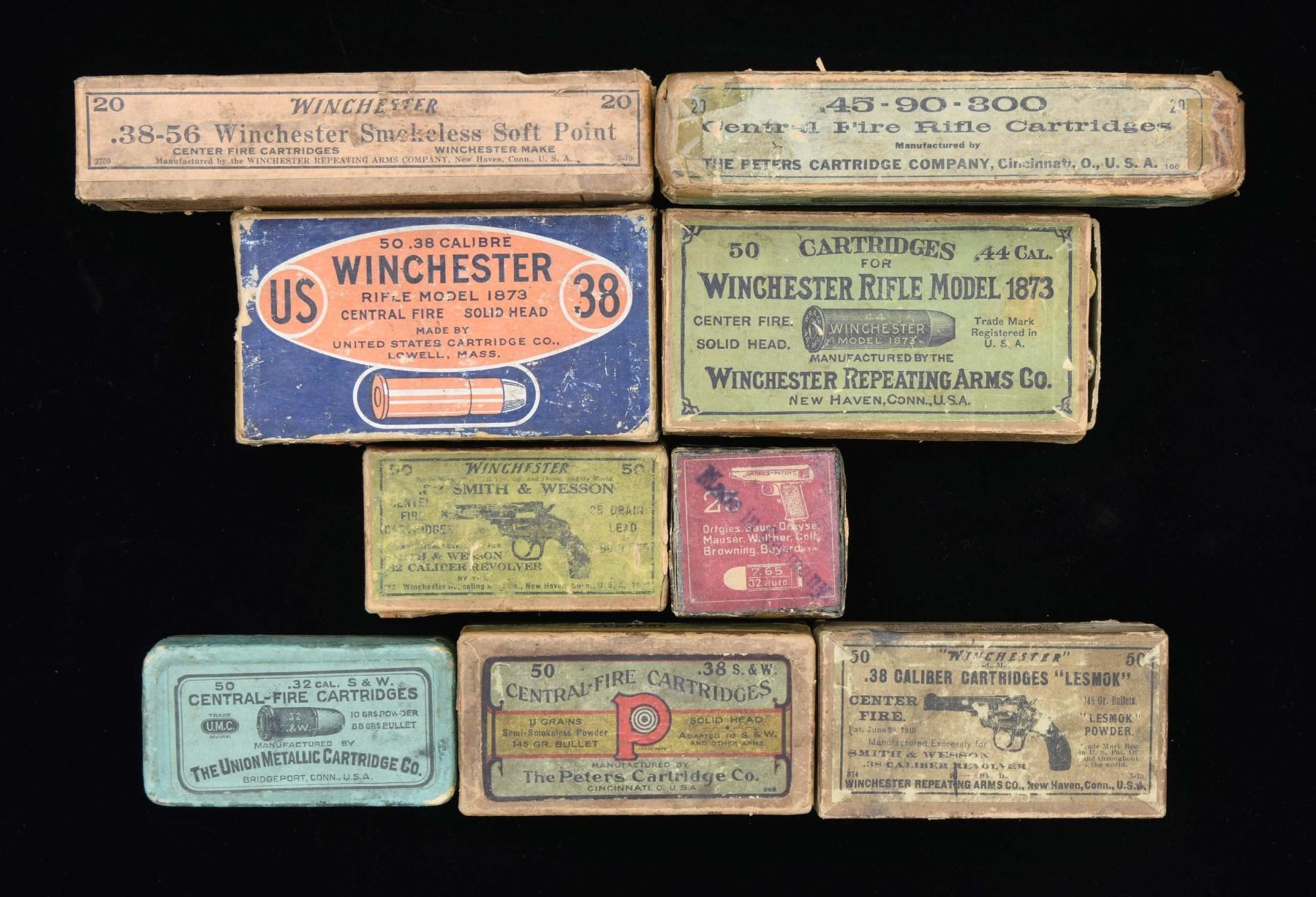 Lot of vintage rifle and shotgun ammunition, including: 1) 50-rd. box of United States Cartridge Co. Winchester Model 1873 .38 W.C.F. ammunition. 2) 1 20-rd. Winchester box containing assorted .38-56 Winchester ammunition. 2) 1 50-rd. box (mostly Winchester ammunition) of Winchester Model 1873 .44 Winchester ammunition. 3) 1 20-rd. box of Peters .45-90-300 Winchester & Marlin ammunition. 4) 1 25-rd. box of German .32 ACP ammunition. 5) 1 50-rd. box (23-rds, and 10 fired casings remaining) of Winchester .32 Smith & Wesson ammunition. 6) 1 50-rd. box of UMC .32 Smith & Wesson ammunition. 7) 1 50-rd. box of Winchester .38 Smith & Wesson "LESMOK" ammunition. 8) 1 50-rd. box (approx. 40-rds. remaining) of Peters .38 Smith & Wesson ammunition. CONDITION: boxes exhibit varying degrees of wear, with most exhibiting some separation at the lid edges, taped repairs, scattered losses to their graphic, and age-related discoloration overall. Ammunition exhibits age-related discoloration, with projectiles exhibiting varying degrees of oxidation. (02-23314/MLW). $500-1,000.