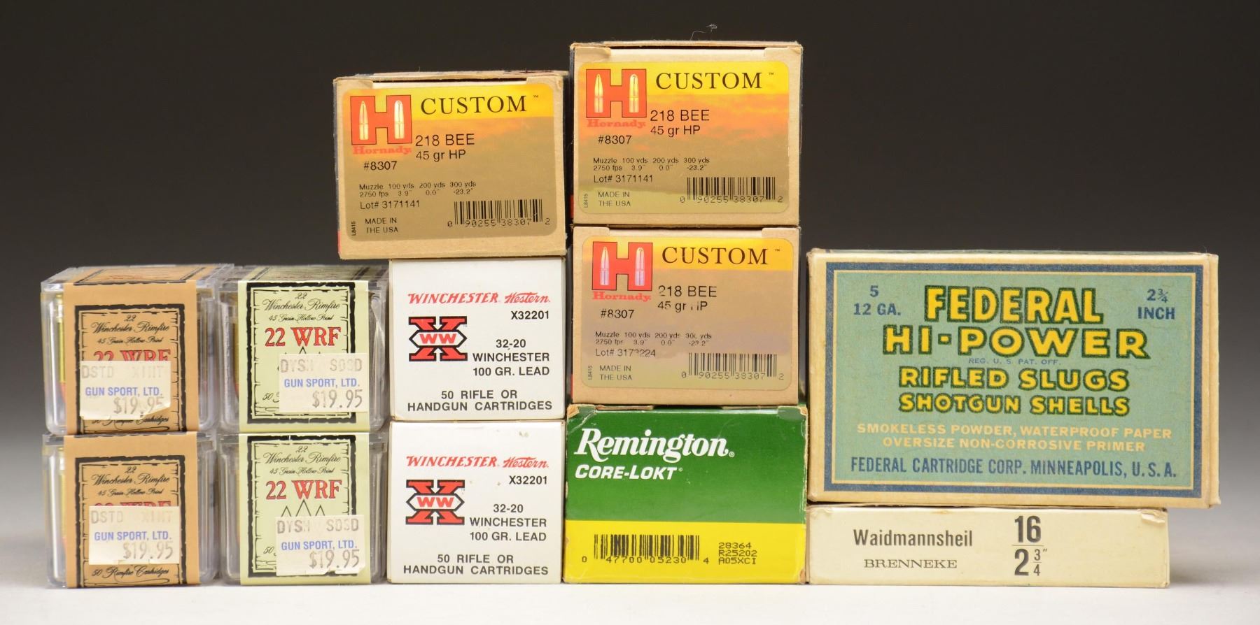 Lot of assorted ammunition including: 1) 3 25-rd. boxes (75-rds. total) of Hornady .218 Bee 45 grain Hollow Point ammunition. 2) 4 50-rd. boxes (200-rds. total) of CCI .22 WRF 45 grain Hollow Point ammunition. 3) 1 50-rd. box of Remington CORE-LOKT .25-20 Winchester 86 grain Soft Point ammunition. 4) 2 50-rd. boxes (100-rds. total) of Winchester/Western .32-20 100 grain Lead ammunition. 5) 1 vintage 5-rd. box of Federal Hi-Power 12 GA 2 3/4" rifled slugs. 6) 1 10-rd. box of Rottweil 16 GA Brenneke slugs. CONDITION: ammunition all appears excellent, with old rds. exhibiting some age related discoloration. Boxes are very good overall. PROVENANCE: The Collection of Gun Sport Ltd owned by Jon R. Thomas. (02-20602/MLW). $350-500.