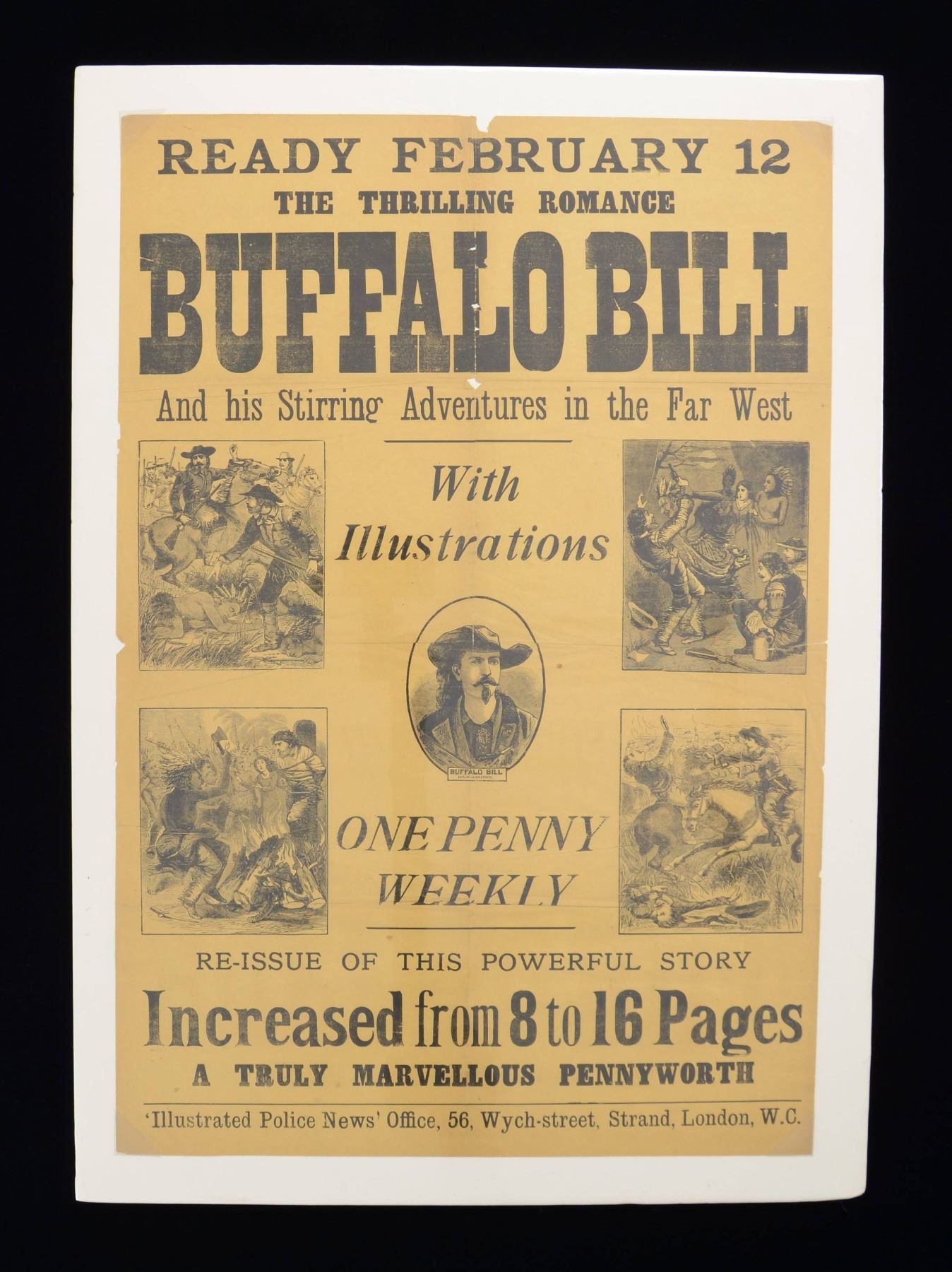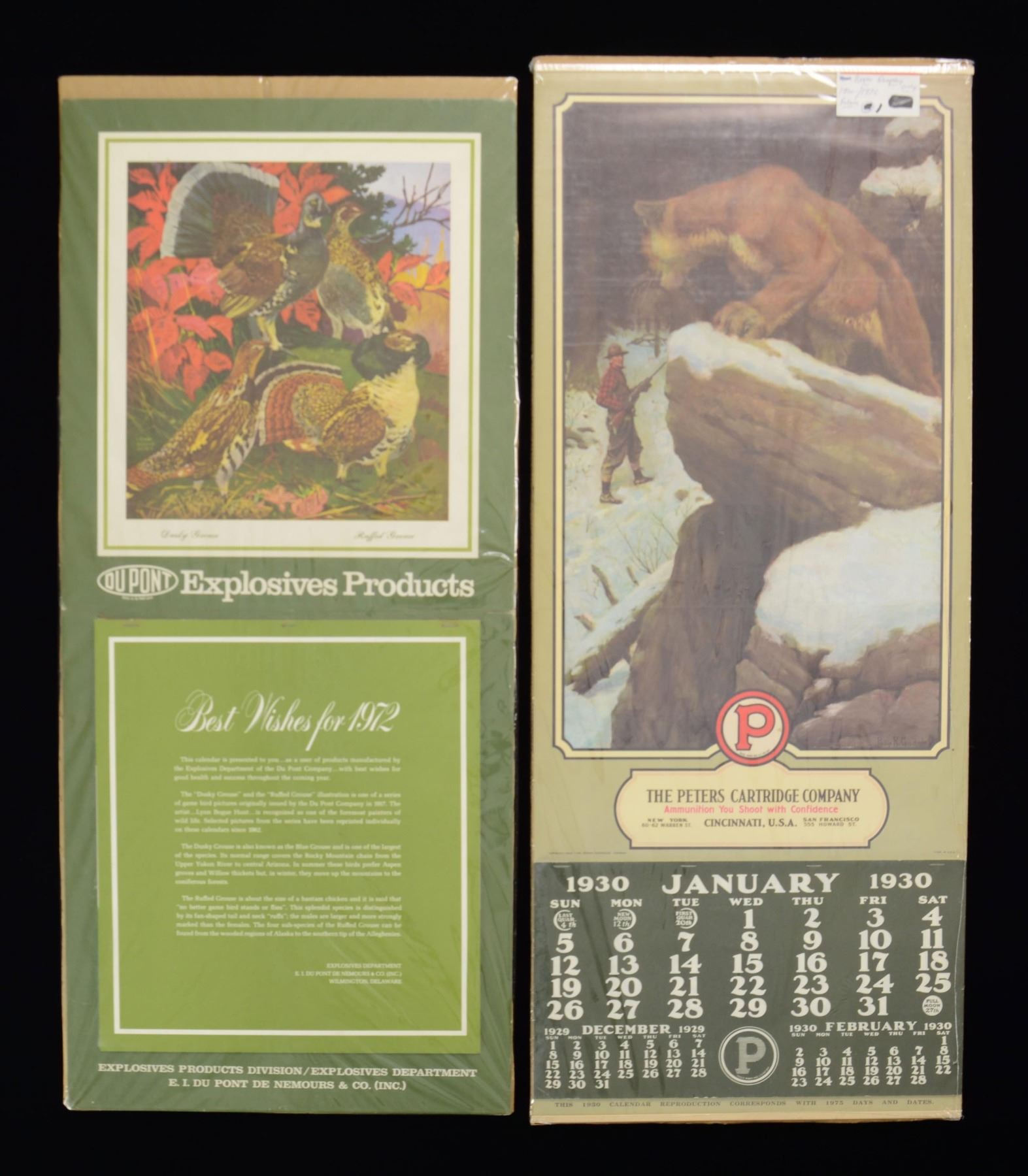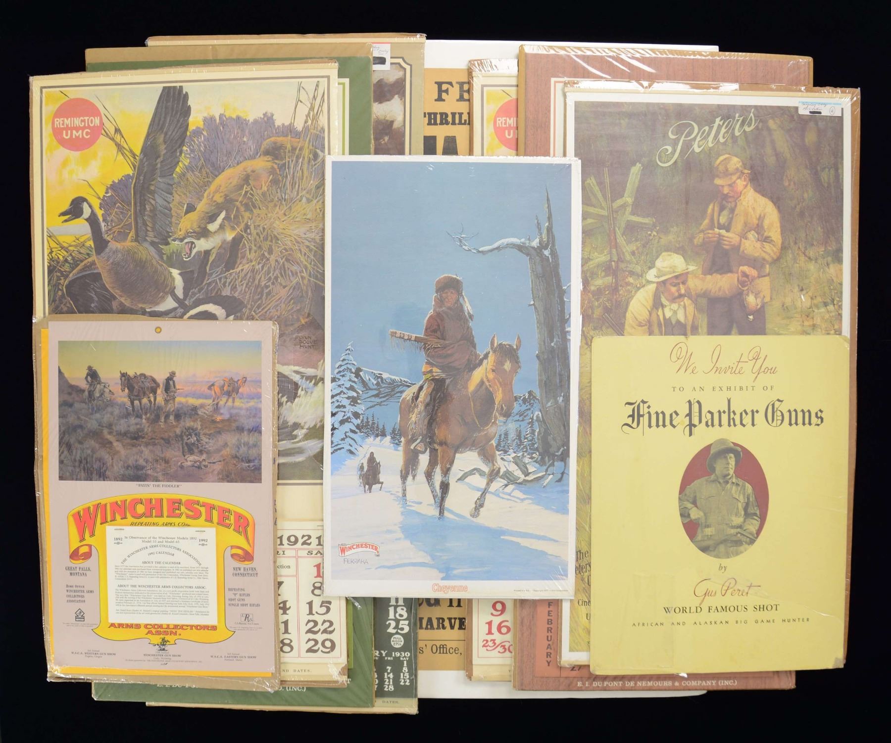1 Winchester Arms Collector 1992 calendar. 1 Dupont 1972 calendar. 1 Dupont 1966 calendar 1 Repro. Peters 1905 calendar. 2 Repro. Remington-UMC 1921 calendar. 1 Repro. Peters 1930 calendar. 1 Winchester "Cheyenne" print. CONDITION: all above are near excellent sealed in plastic. 1 Fine Parker Guns store fold out display. 1 Poster 20" x 30" for Buffalo Bill One Penny Weekly. CONDITION: Parker display in good condition with marks. Buffalo Bill poster in fair legible condition with holes and tears. (02-23056/MD). $400-800.
