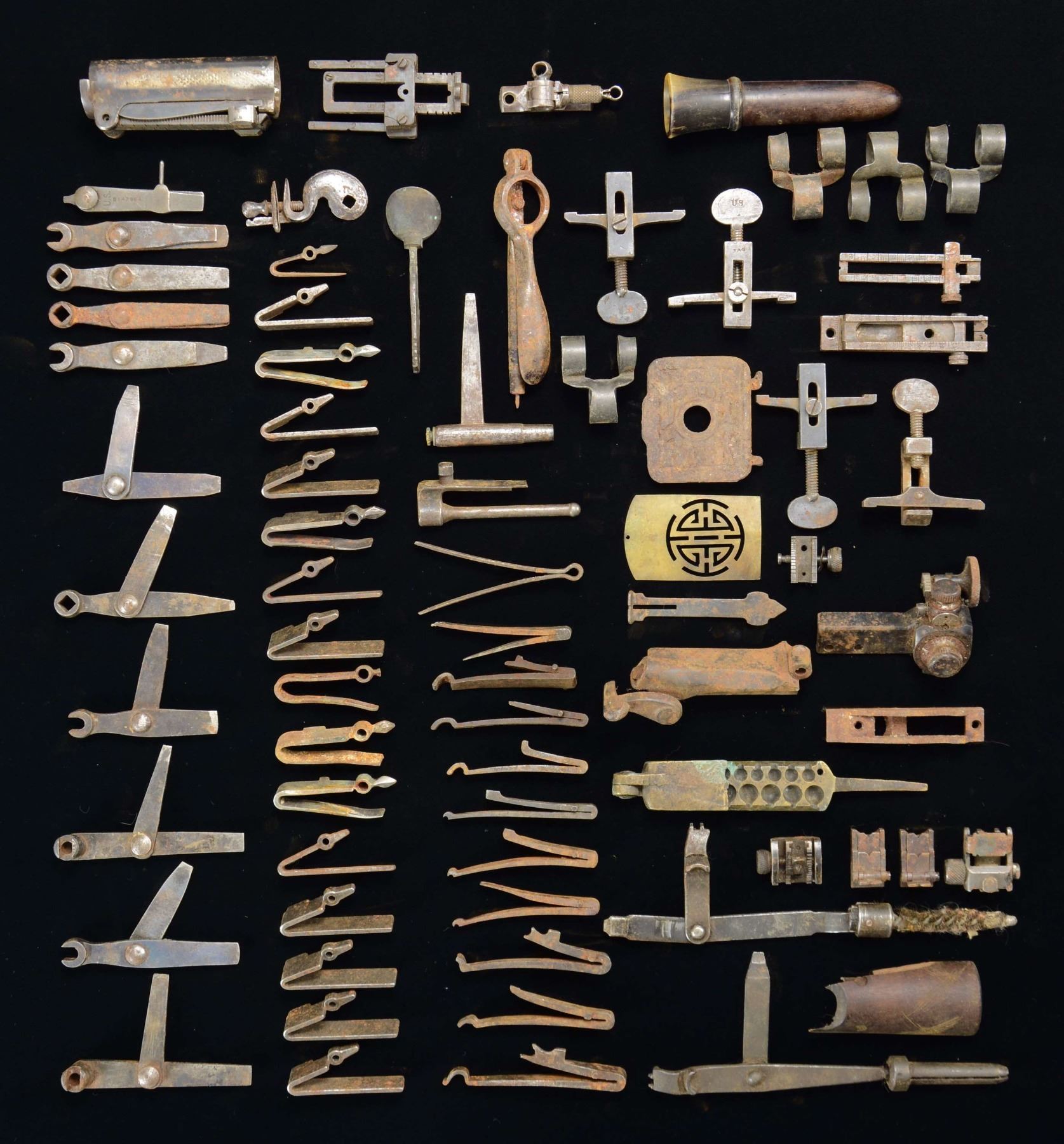 This varied group includes a large variety of gun parts from the Flintlock era through the early 1900s. Highlights include 4 main spring clamps, 11 nipple wrenches and other tools, several main springs, a flint cock, and a wide variety of other pieces and parts. There is even a carved horn duck call included. CONDITION: some parts have a portion of their original finish. Many show a rusted surface. Duck call appears functional. (02-22440-8/BF). $200-400.