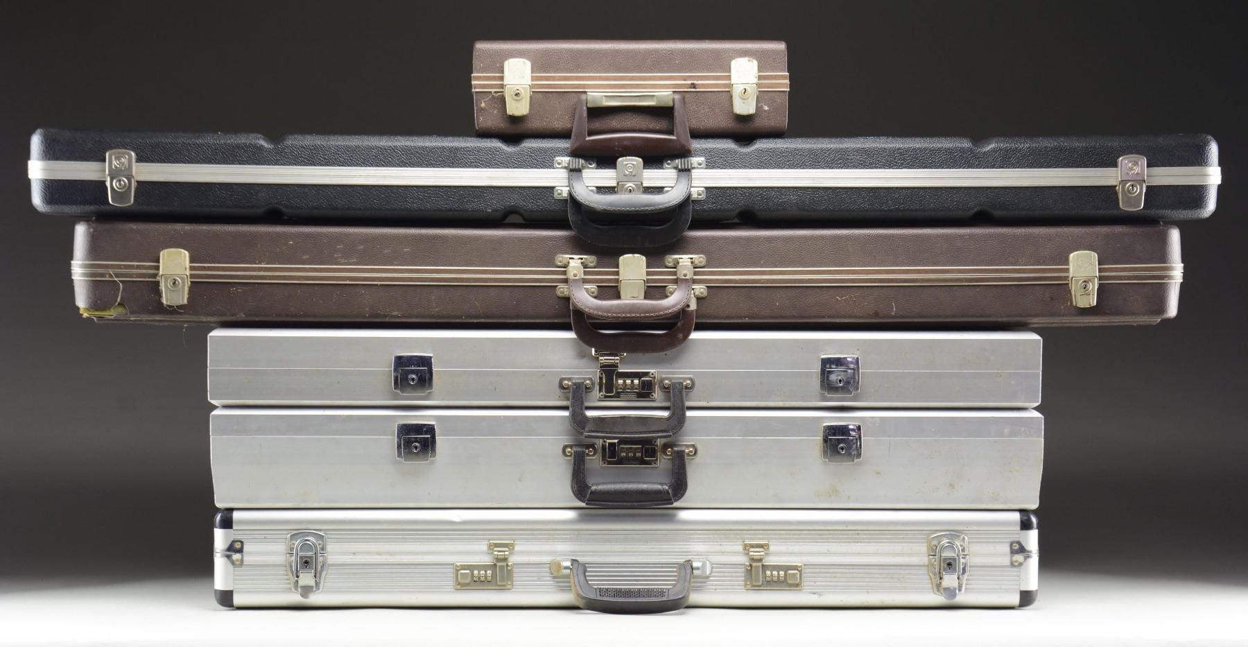 This lot consists of five long gun hardcases & one handgun hardcase. The long gun cases measure between 37" & 50" in length. Some have combination locks & two are set up for SXS shotguns. Handgun case measures 13 3/4" in length. CONDITION: one case is missing one foam insert & shows two large chunks missing from the lids. The other cases show varying degrees of oxidation, scuffing & handling wear. (02-23112/MJC). $100-200 for lot.
