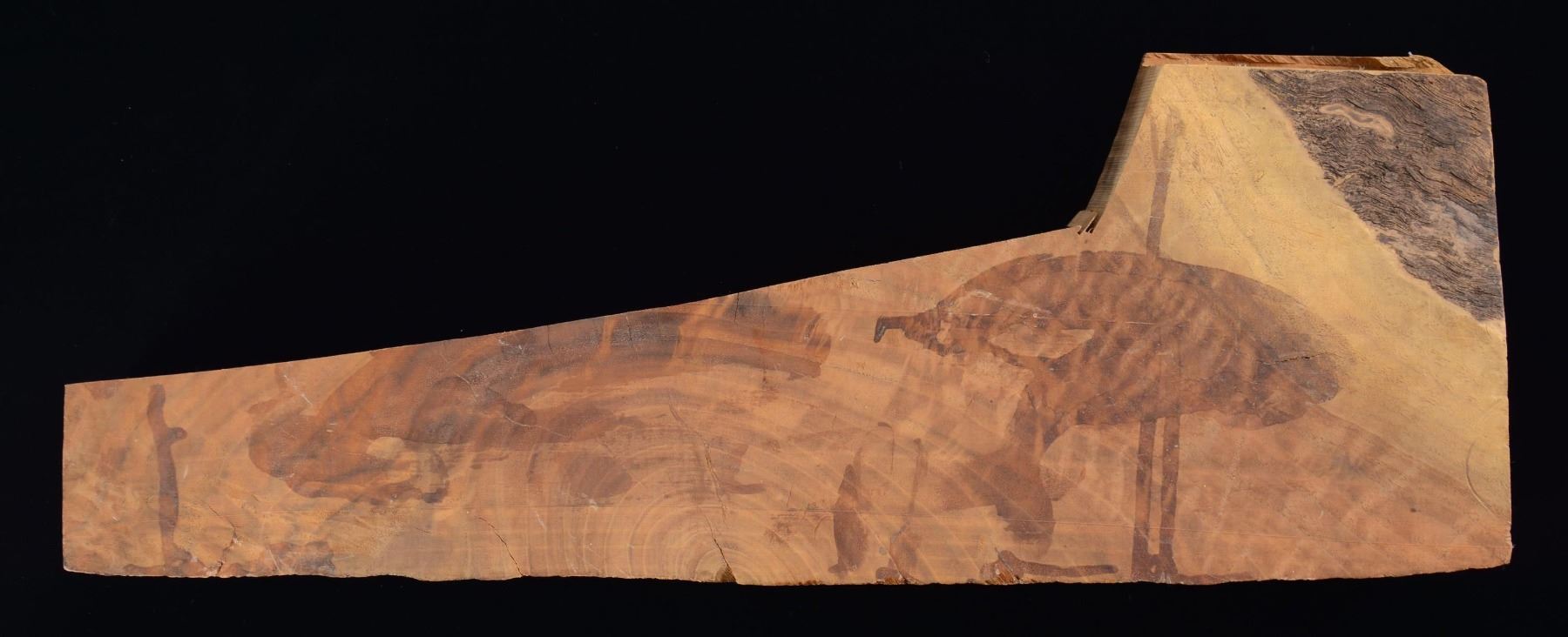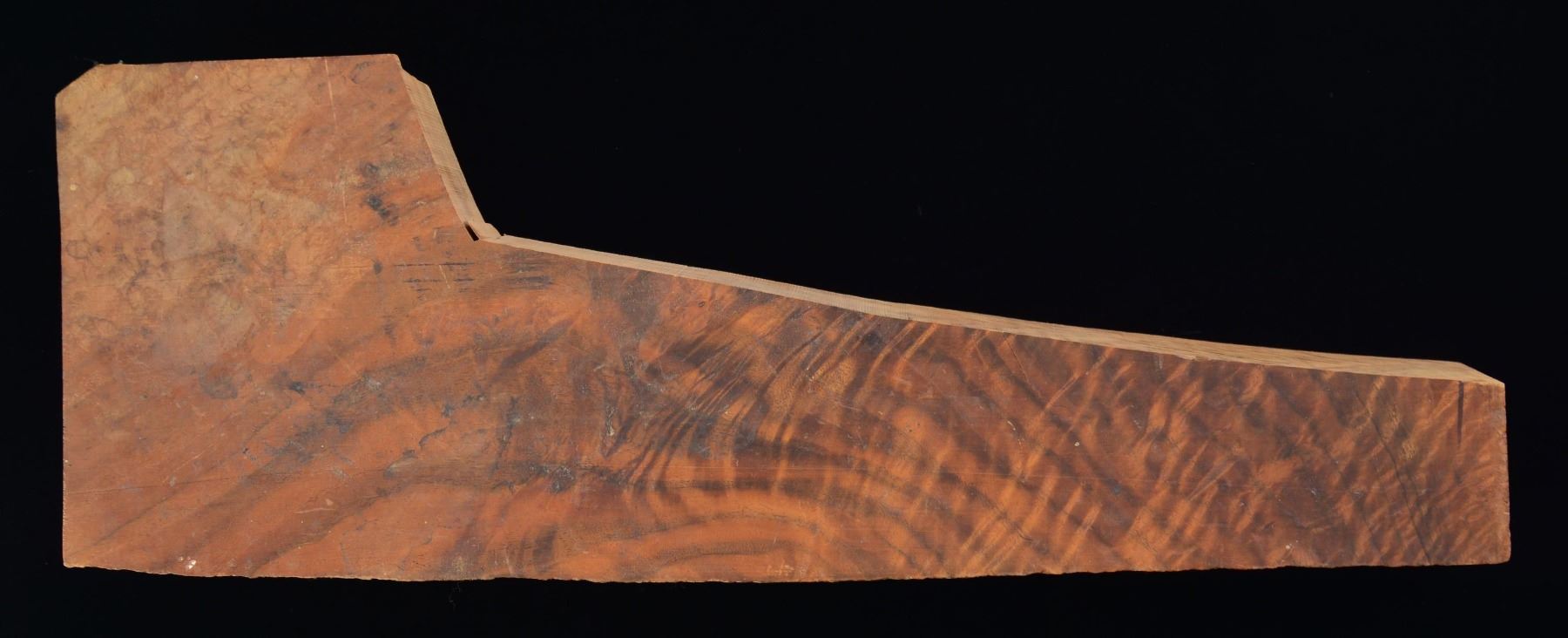 Walnut stock blank cut circa. 1935, with the blank having been planed circa. 1950s, per a prior auction description. Blank is finely figured and measures 21 3/4" in length and 3 3/8" in depth. Blank measures 2 7/8" in width at the narrowest point, and 7 3/4" at the widest point. CONDITION: very good overall. (02-23101/MLW). $75-150.