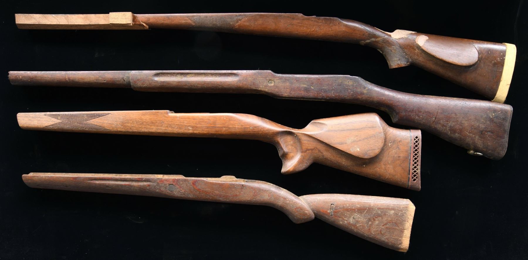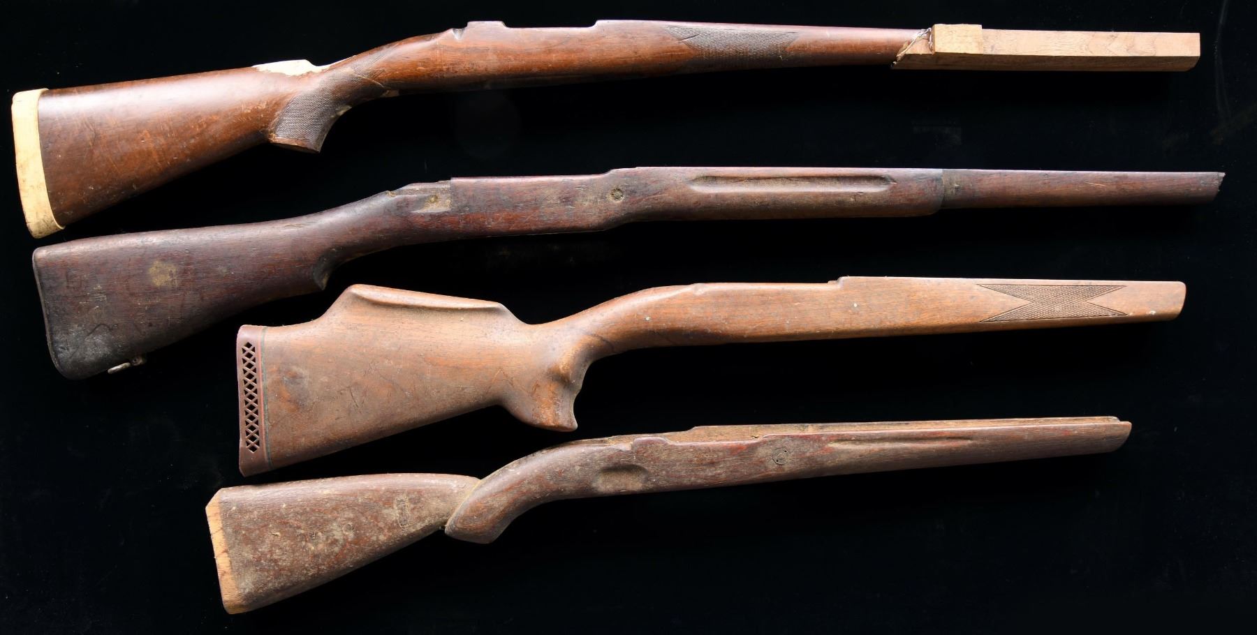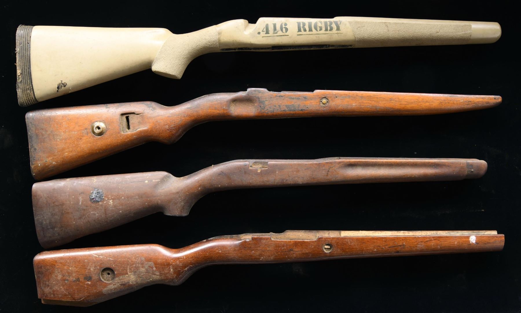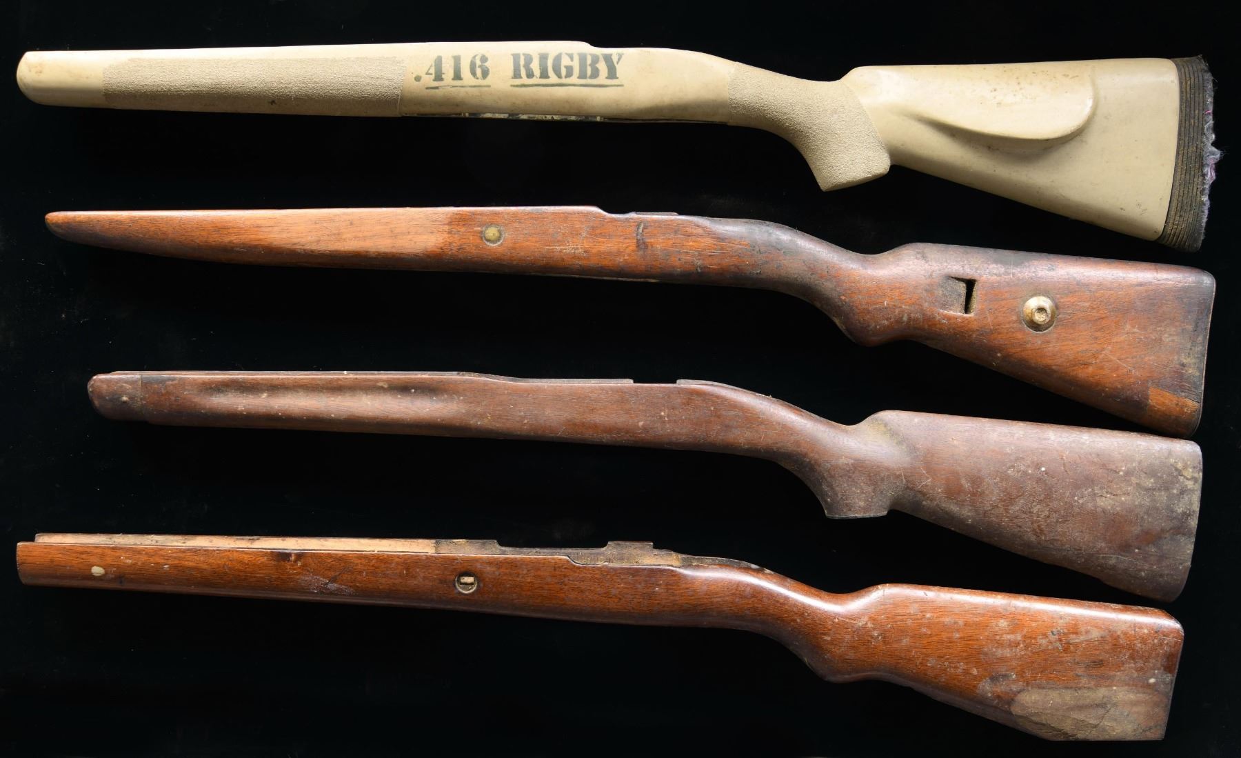 & RUGER MK-II. MAUSER: 1) Sporter configured stock with checkered forend, high comb cheekpiece, pad and unusual (but comfortable) pistol grip. 2, 3 & 4) cut down military stocks. 5) Commercial Sporter Mannlicher stock with duffle cut having added walnut to restore, repaired crack at wrist plus light hardwood added to butt that resembles recoil pad. 6) SPRINGFIELD M1922 175235cut for receiver sight & grip cap section started. 7) ENFIELD P17 with missing tip. 8) RUGER MARK-II aftermarket plastic stock with weighted butt, pronounced gripping surfaces, Remington recoil pad, pillar bedding and "416 RIGBY" painted on each side of magazine area. CONDITION: most useable ones are 1, 6 and 8. Possible usability for 5 & 7; balance not really useable other than for their wood. (02-23181/NW). $100-150.