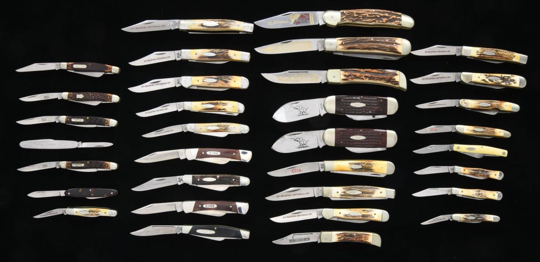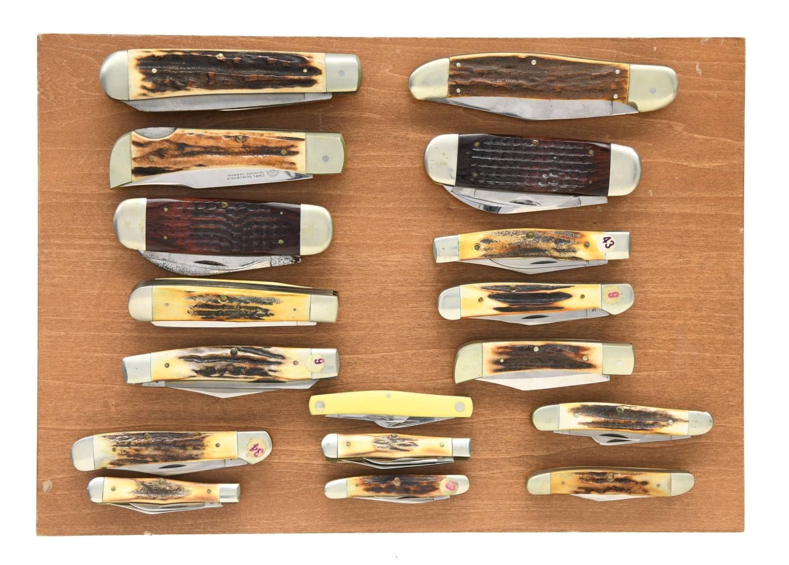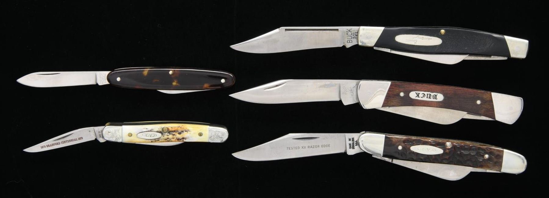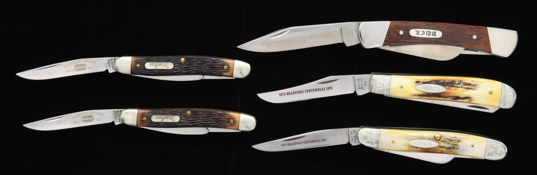 ASSORTED FOLDING KNIVES. 1) First case contains 1 Shrade Old Timer, 2 Buck Model 701s, 3 Shrade Model 855s, an Case XX "1879 BRADFORD CENTENNIAL 1979" marked 6-piece knife set, Buck Model 301, Case XX Model 6347 HP, 1 Victorinox 2-blade folder, 1 C-I-L Explosives 2-blade folder. 2) 1 Case XX Model 5524, 2 Case XX Model 5249s, 1 Case XX Model 5292, 1 Case XX Model 52087, 1 Case XX Model 52027, 2 Case XX Model 6250s, 1 Case XX Bradford Centennial Model 5275SP, 2 Case XX Model 5225 1/2s, 1 Carl Schlieper Native American engraved folder, 1 Carl Schlieper 2-blade folder, 1 Carl Schlieper game scene engraved folder, 1 unbranded German folder, 1 Case XX Bradford Centennial Model 5318 HP, and 1 Case XX Model 33044. CONDITION: knives are good overall, exhibiting varying degrees of wear, age related discoloration, and spots of oxidation overall. PROVENANCE: the Collection of Gun Sport Ltd owned by Jon R. Thomas. (02-20778/MLW). $750-1,500.