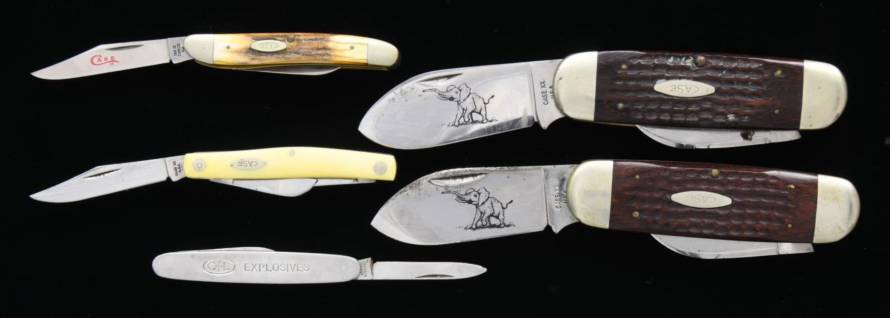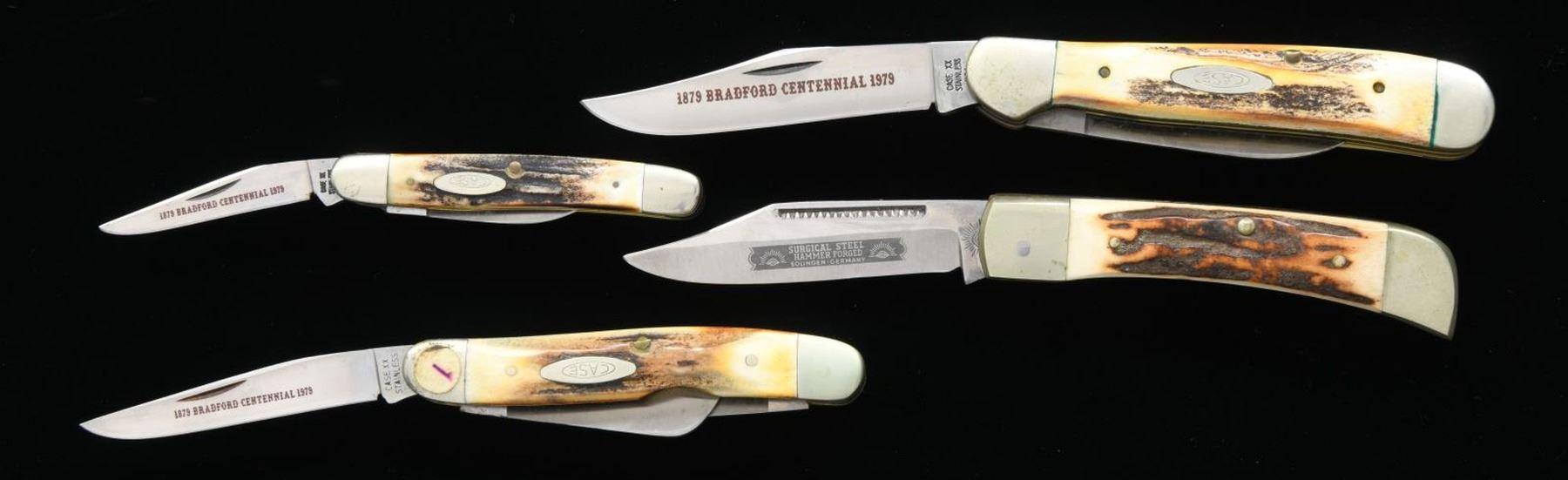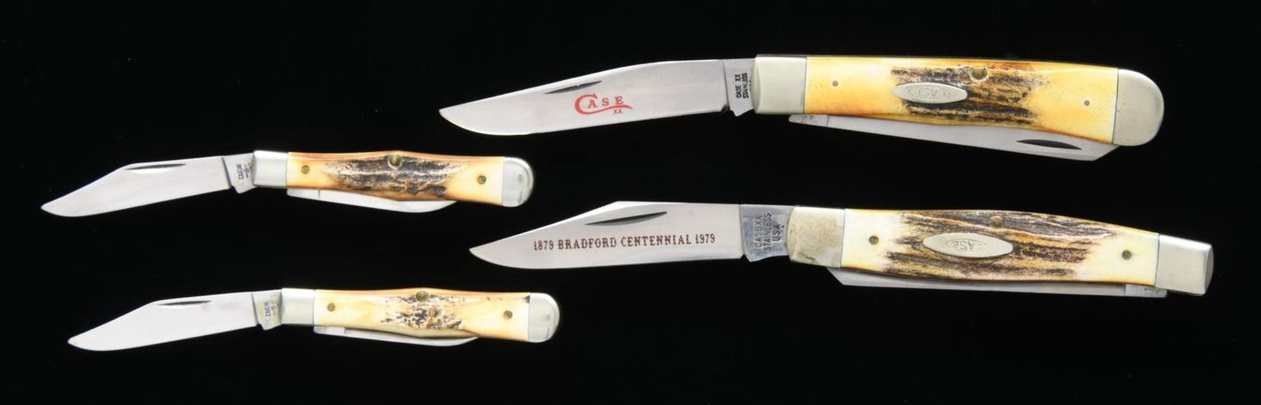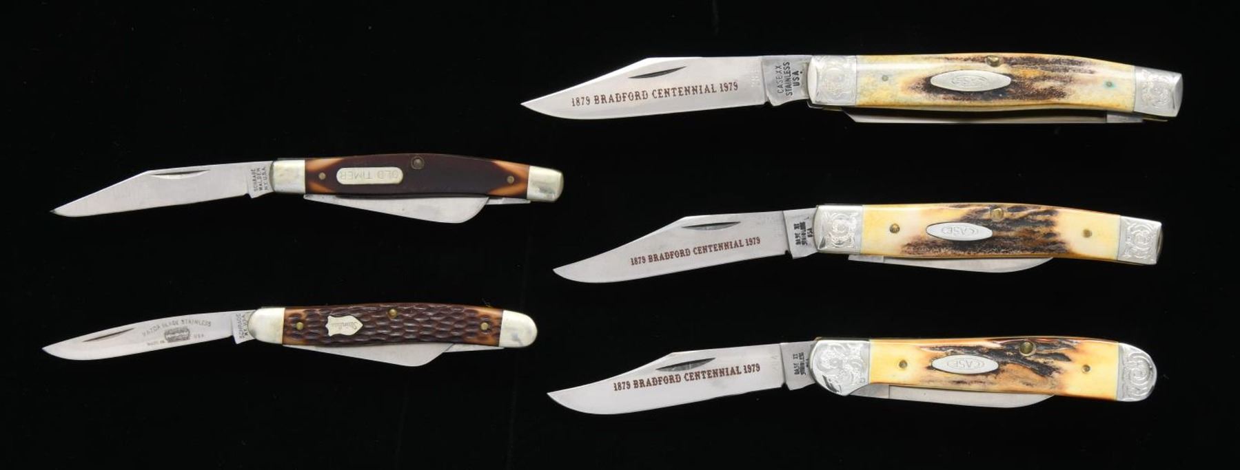 ASSORTED FOLDING KNIVES. 1) First case contains 1 Shrade Old Timer, 2 Buck Model 701s, 3 Shrade Model 855s, an Case XX "1879 BRADFORD CENTENNIAL 1979" marked 6-piece knife set, Buck Model 301, Case XX Model 6347 HP, 1 Victorinox 2-blade folder, 1 C-I-L Explosives 2-blade folder. 2) 1 Case XX Model 5524, 2 Case XX Model 5249s, 1 Case XX Model 5292, 1 Case XX Model 52087, 1 Case XX Model 52027, 2 Case XX Model 6250s, 1 Case XX Bradford Centennial Model 5275SP, 2 Case XX Model 5225 1/2s, 1 Carl Schlieper Native American engraved folder, 1 Carl Schlieper 2-blade folder, 1 Carl Schlieper game scene engraved folder, 1 unbranded German folder, 1 Case XX Bradford Centennial Model 5318 HP, and 1 Case XX Model 33044. CONDITION: knives are good overall, exhibiting varying degrees of wear, age related discoloration, and spots of oxidation overall. PROVENANCE: the Collection of Gun Sport Ltd owned by Jon R. Thomas. (02-20778/MLW). $750-1,500.