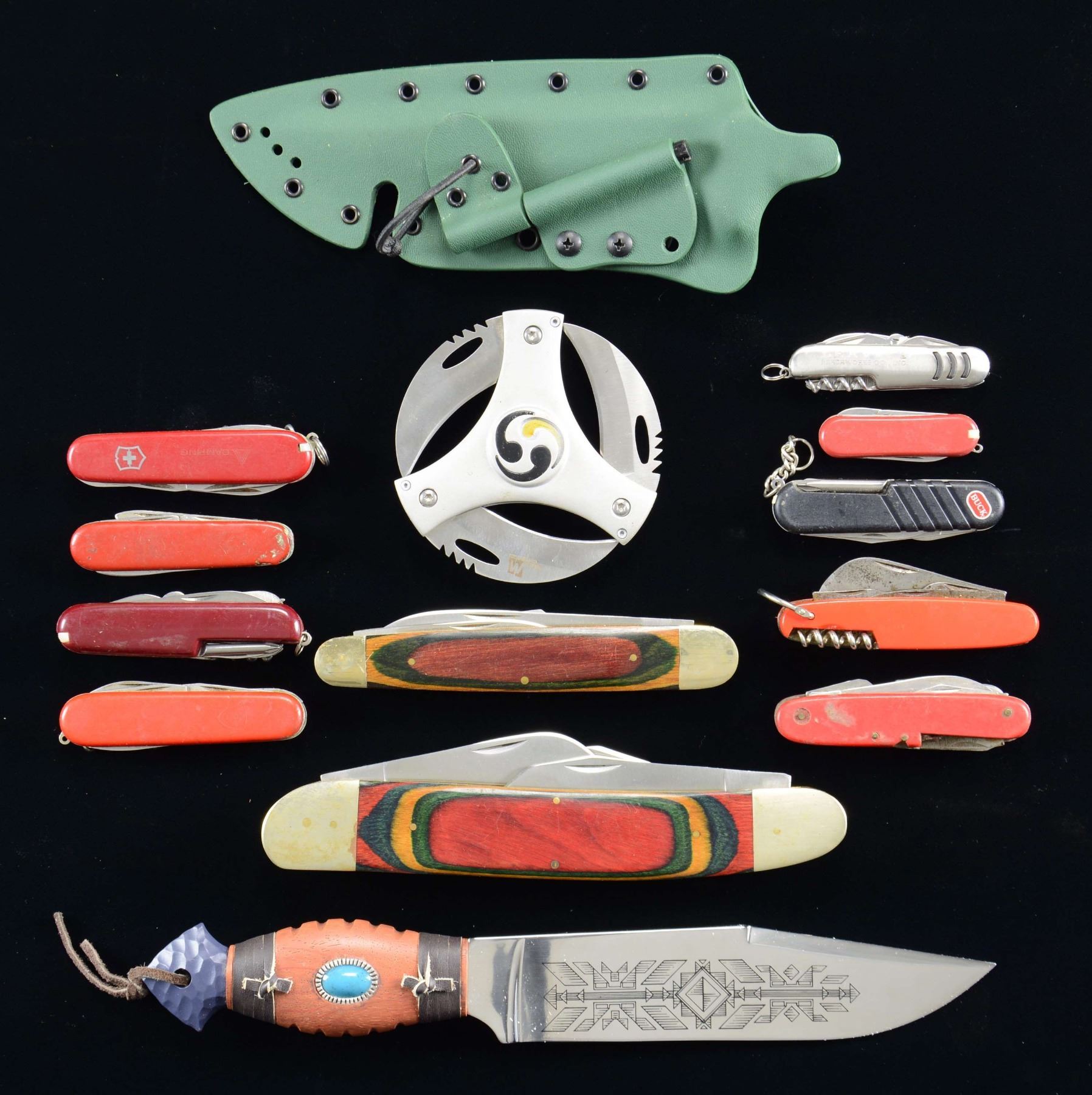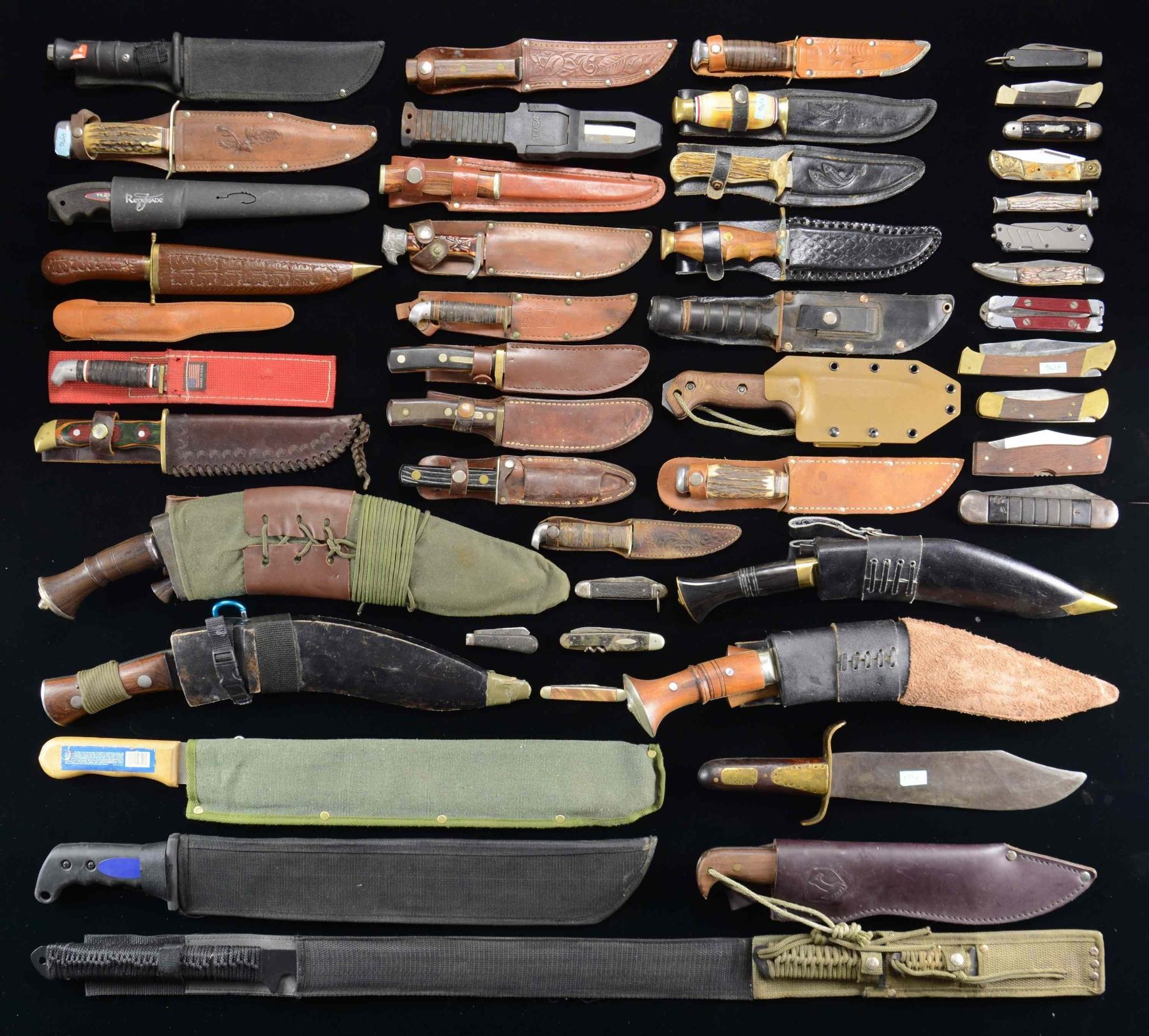 Large lot of assorted knives and edged weapons, including kukris, machetes, folding pocket knives, fixed knives, etc. Knives are from a wide variety of vintages and mfgs. with many including a pouch or sheath. CONDITION: knives show varying degrees of wear, with many exhibiting varying degrees of oxidation and/or wear from use. Pouches/sheaths exhibit varying degrees of wear from handling and storage, with most remaining sturdy and serviceable. (02-23108/MLW). $500-700.