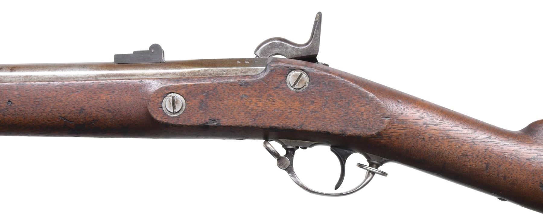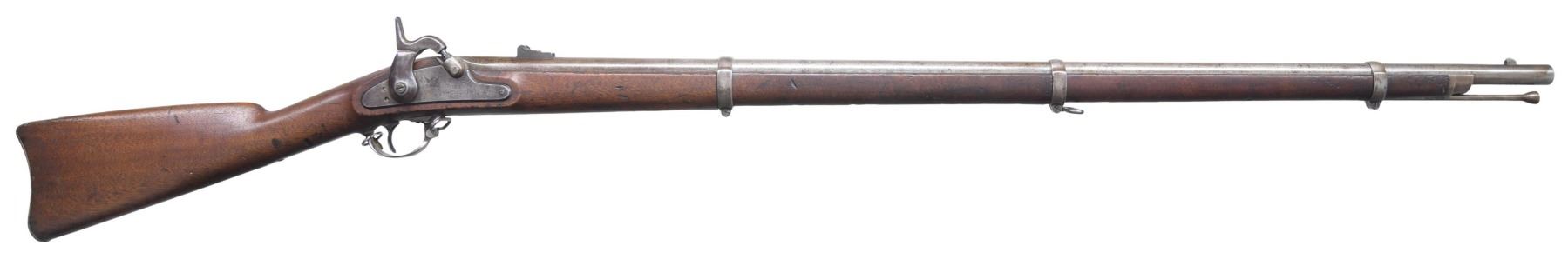 Cal. 58. NSN. Bbl. 40". Blade front sight. Dual leaf rear sight. Rear of lock has 1863 date. Center of lock has US eagle and "US BRIDESBURG" markings. Top rear of bbl. has an 1863 date. Rear left of bbl. has "VP" proof marking. Buttplate tang marked "U.S." Walnut stock with bottom-mounted sling swivels. Left side of stock has two faint inspector's cartouches. Tulip head ramrod present. CONDITION: stock appears to have an old cleaning with some chips, most notably in the ramrod channel, scattered dings, and handling wear. Metal is a gray patina with scattered dings, oxidation, and pitting. Action appears to function when hand-cycled. Bore shows scattered pitting and oxidation but evident rifling. (01-25593/MJC). ANTIQUE. $800-1,300.