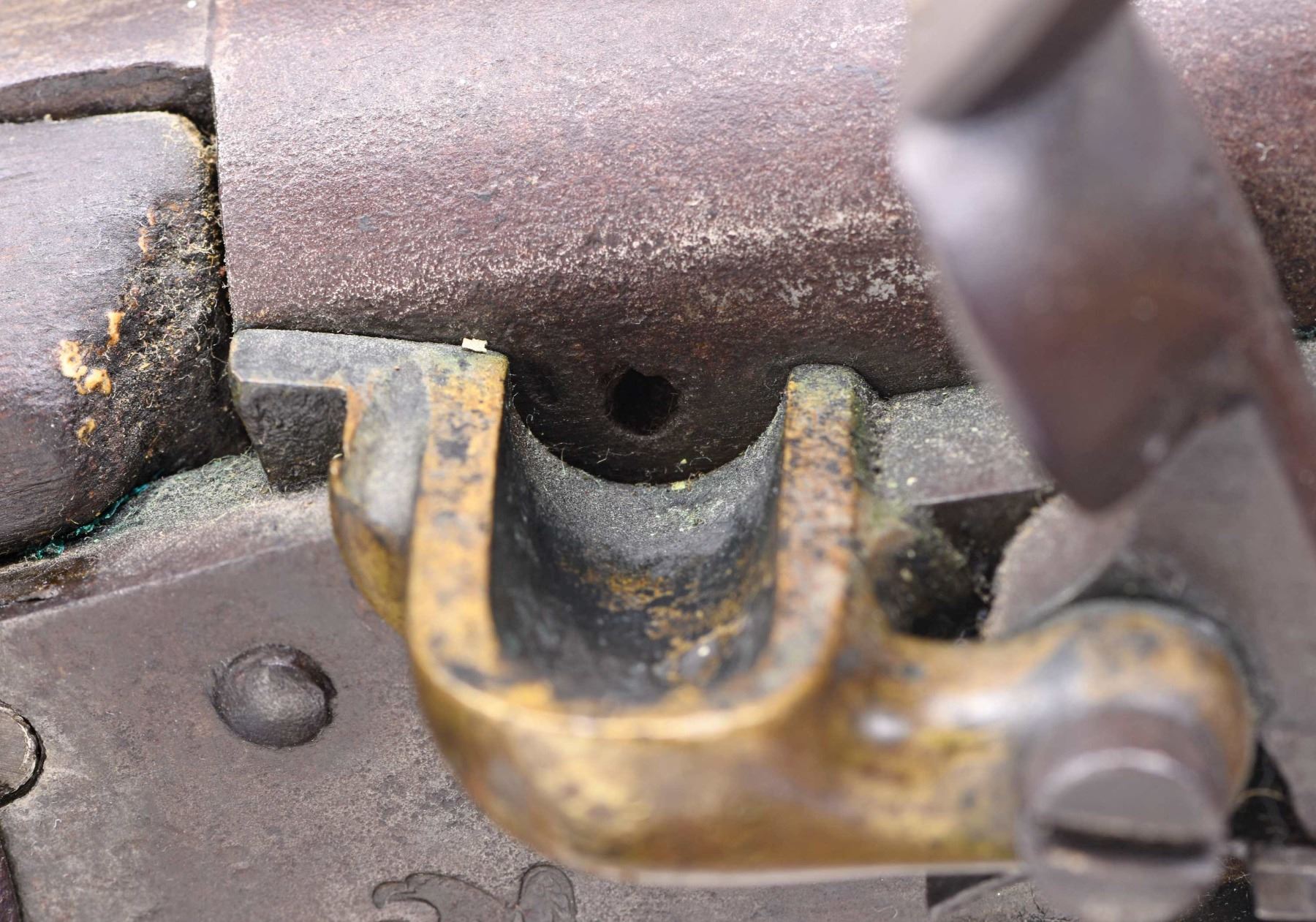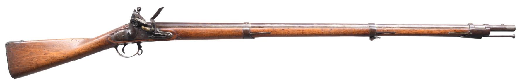 Cal. 69. S# NSN. The 42" barrel with bayonet lug on top is marked "V" "P" & eagle head at rear. Flint lock with beveled flat plate has rounded tail. Lock features rounded cock, inset brass pan, frizzen with straight toe and feather spring with bulbous finial. A heraldic eagle over "US" is at center and tail is marked "HARPERS" "FERRY" "1828" at rear. Walnut stock attaches to barrel with three spring retained bands and is iron mounted. Buttplate screws are stamped "16" with no number found on the plate itself (matching number on inside of lock on pan). Trigger guard with sling loop on bow is stamped "6" which also appears on rear and mid bands. Stock has typical low comb and is stamped with "AB" inspector's mark along with "V" & "PH" on left side panel. Left side of stock near muzzle is deeply stamped with conjoined "HL" & "AL". CONDITION: good original flint. Metal parts exhibit dark brown patina with some cleaning over some fairly deep pitting on side plate. Wood has old oil refinish over many marks and bumps. Inspector's marks difficult to read. Stock shows cracks in front of lockplate and missing wood at top rear. Bore is lightly pitted. Lock is mechanically good. (01-25588/MGM). ANTIQUE. $1,300-2,000.