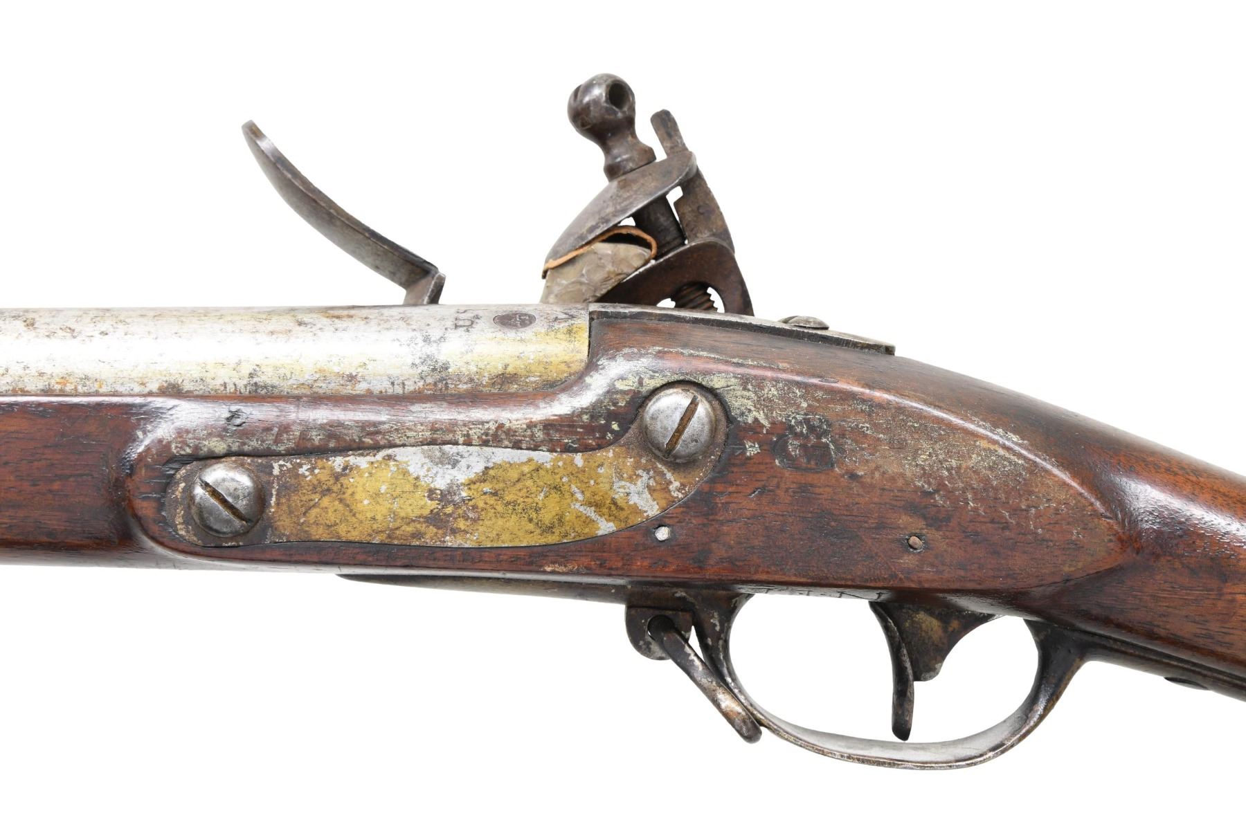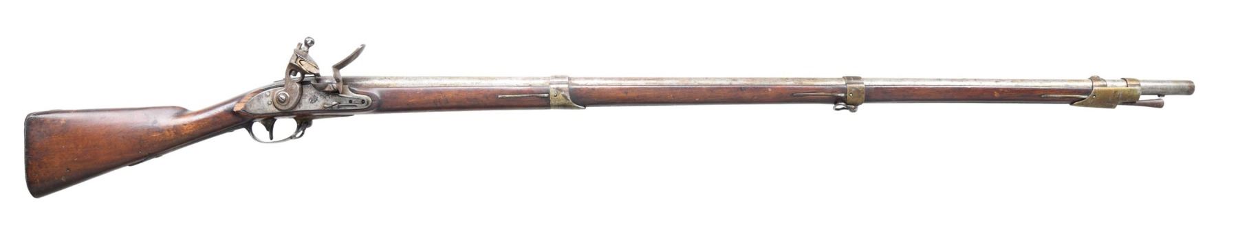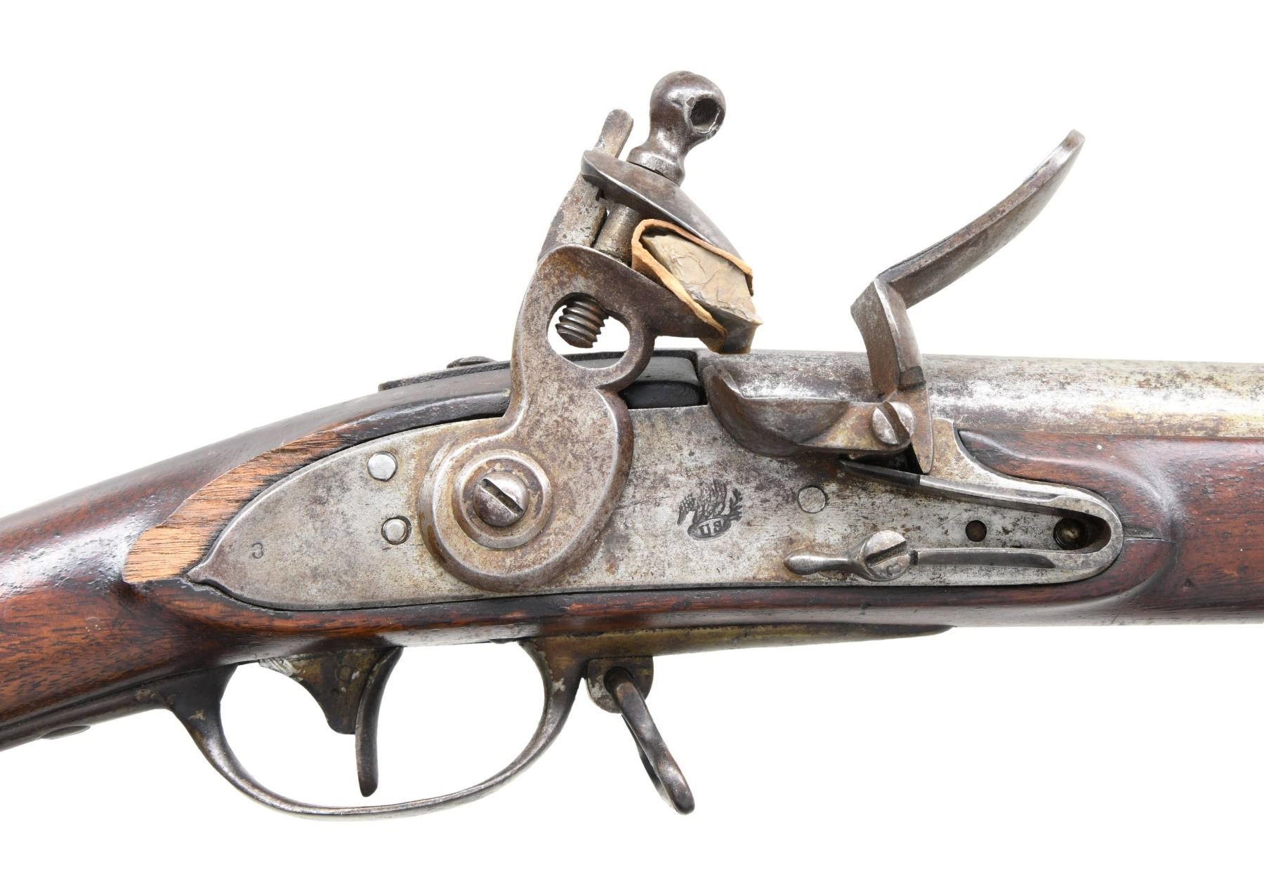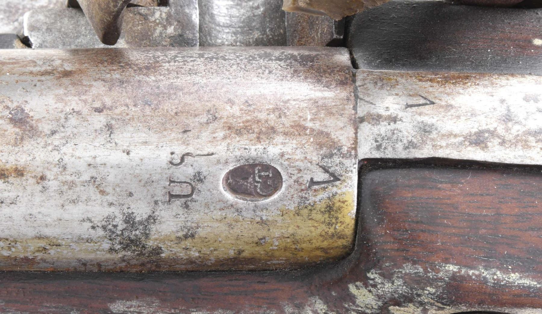 Cal. 69. S# NSN. The 44-3/4" barrel with bayonet lug on bottom 2" back from muzzle is marked "US" "CT" (contract) under eagle in deep oval cartouche "V" at rear. "V" stamp is also visible on breech plug tang. Flint lock with flat slightly chamfered plate has teat at rear and has an integral rounded pan. Center of lock is stamped with a small eagle over "US" in an oval. Assembly number "3" is on all internal parts except springs and is also found at rear of lockplate and on flat faced cock, but not found on frizzen (frizzen has been re-steeled and barrel revented during period of use). Top jaw is also stamped "3". Walnut stock has "V" over "CW" inspector's mark (Charles Williams) in cartouche on left side panel. Stock is iron mounted with unmarked buttplate and sideplate. Trigger guard has spear finials and sling loop. Barrel is affixed with three spring retained bands. Ramrod with tapered head is present. CONDITION: very good to fine. Metal parts cleaned to pewter gray over considerable dark lightly pitted surfaces. Stock has coating of newer varnish with scuffs and marks. Inspector's marking clogged with this varnish, but appears strong. Stock is sound except for 1-1/2" area missing at top rear of lockplate. Dark relatively smooth bore. Original flint configuration lock is mechanically good. Cock screw replaced (?) with small head screw and washer. This could be a very good 1808 musket with judicious restoration. (01-25579/MGM). ANTIQUE. $1,500-2,500.