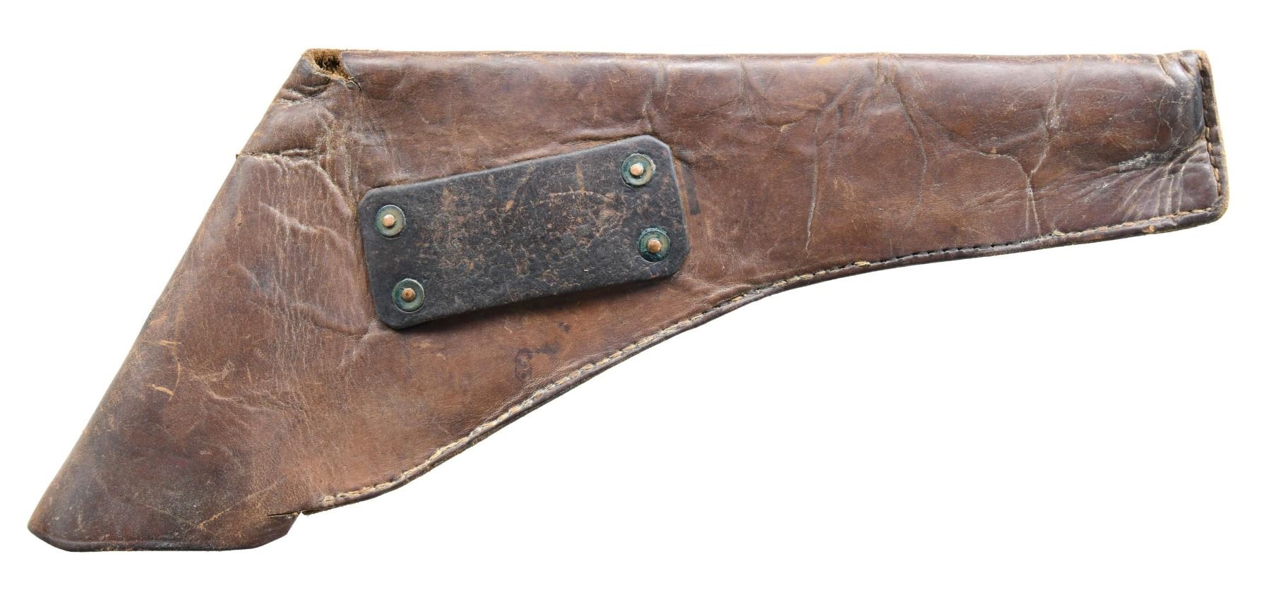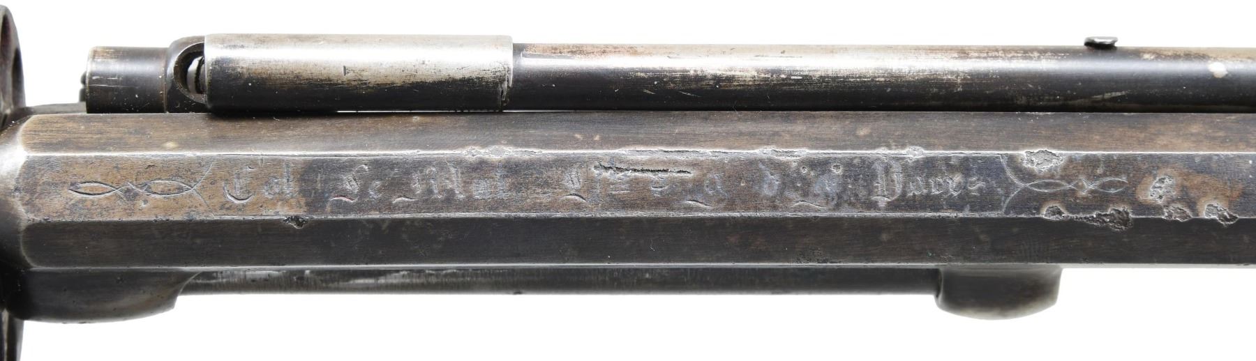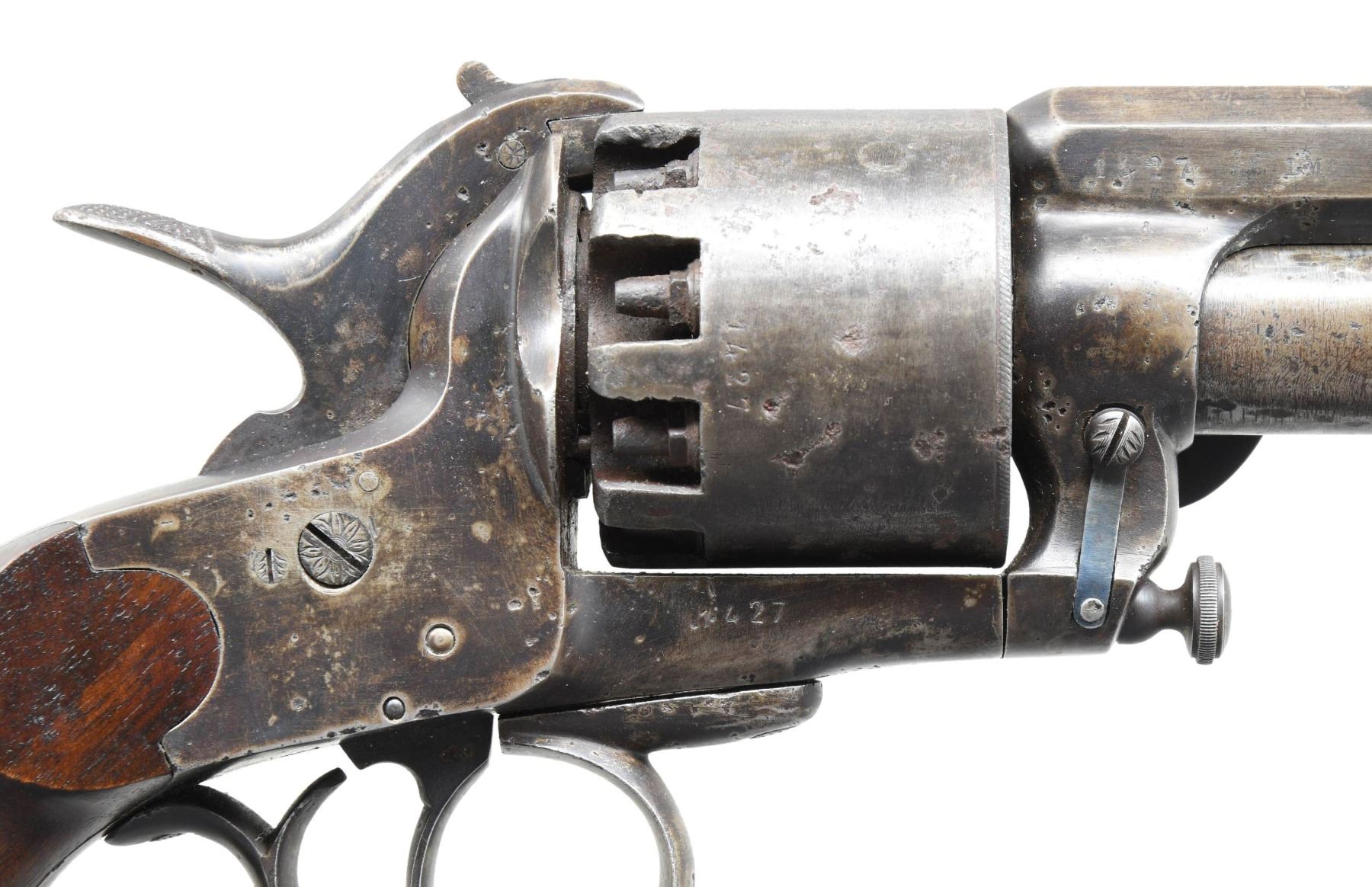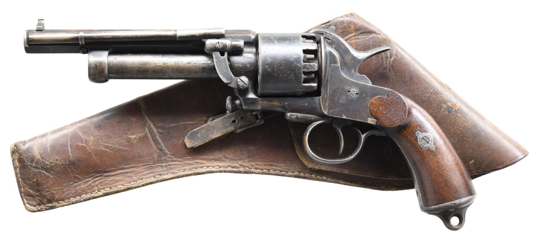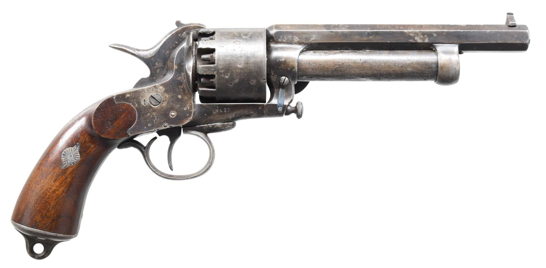 Cal. 42/18ga. S# 1427. Late 1863 made 2nd model LeMat grapeshot revolver. Barrel address: "Systeme LeMat Bte sgdc Paris". Standard configuration, 9-shot cylinder, underlying shotgun barrel, reciprocating pin cylinder rotation system, hinged selector on hammer face for choice of shotgun or cylinder. Smooth wood grips, loading assembly attached to frame on left side. Accompanied by leather holster with sewn roller, buckle closure. CONDITION: good overall as loading assembly professionally restored and refinished. All matching S#s. Barrel address mostly discerned, metal gray with pitting. Mechanics are very good, discernible rifled barrel & smooth clean shotgun bore. Holster fits revolver tightly. PROVENANCE: ex-Bill Myers collection, Perryville, OH, 2014. (01-26028/JS). ANTIQUE. $7,000-9,000.