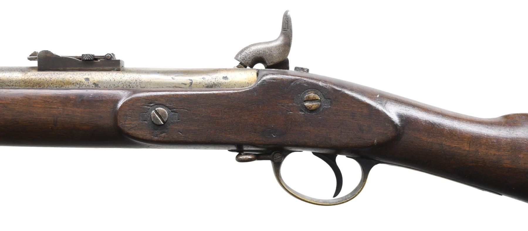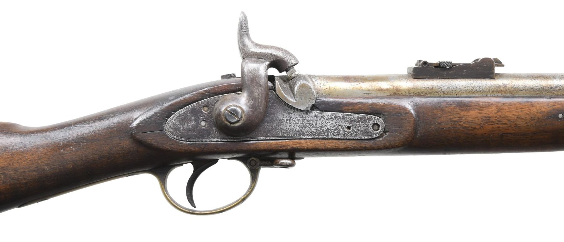 Cal. .577. S# NSN. The 23-1/4" barrel with British proofs at rear is rifled with 3 grooves. Barrel is fitted with ladder type long range rear and tall blade front sights. Front spring percussion lock is marked "BARNETT" "LONDON". Walnut stock is brass mounted. Tang of buttplate is marked "I". Trigger guard has sling loop. Stock has brass cap and attaches to barrel with two iron bands. CONDITION: iron parts show considerable cleaning over deep pitting. Stock has oil refinish with areas on forend filled. Barrel and stock appear to have been shortened. Bore is very good with light pitting. Lock is good. (01-25576/MGM). ANTIQUE. $600-900.