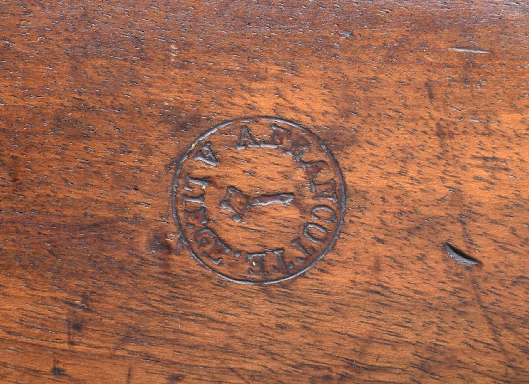 Cal. 69. S# NSN. The 41" barrel has Belgian black powder proofs on octagonal breech section. A "U" notch rear sight is attached to breech plug. Flat lockplate of flintlock type is originally made for percussion use. Crowned initials "AF" are at top. Walnut stock is iron mounted and right side of butt is stamped "A. FRANCOTTE" "A LIEGE" in a circle. Other inspector's marks are present on most parts. Stock attaches to barrels with three spring retained bands. A tapered head ramrod is present. CONDITION: fine with light refinish of wood. Metal parts cleaned to pewter gray with brown overtones. Stock has added oil over numerous marks. Four notches are on right side under lockplate and the letter "J" is hand carved at front of lock. Five groove bore is shiny with light pitting. Lock is good. A high quality musket by this esteemed maker. (01-25586/MGM). ANTIQUE. $600-1,000.