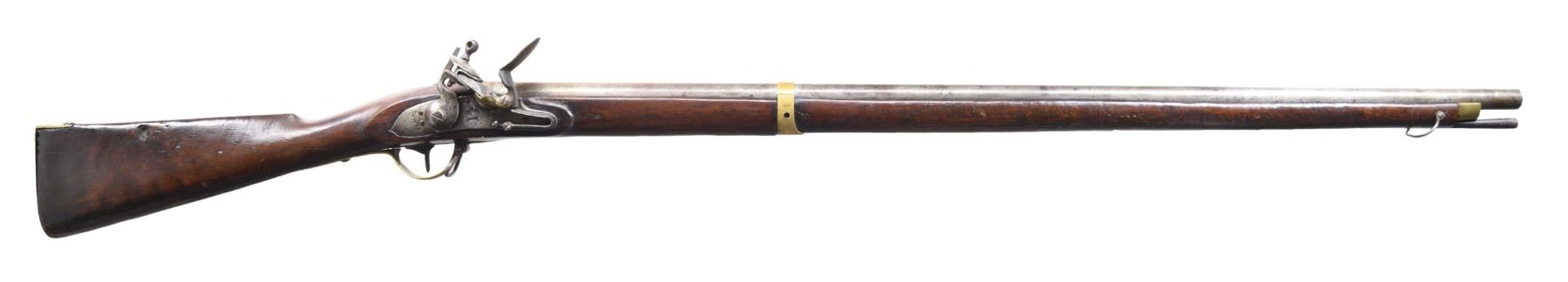 Cal. 70. S# NSN. The unmarked 40" barrel has faceted breech section and has bushed touch hole. "TOWER" marked flint lock is of later style with rounded tail and inset brass pan. Stock appears to be made of elm and is brass mounted. Buttplate is stamped with the number "7732" on toe. Stock extends to within 2" of muzzle and is held by one driven on brass band at rear. A brass cap is present along with tapered head ramrod and homemade sling loop with old military sling loop on brass trigger guard. CONDITION: good. Iron parts show cleaning to silver gray over considerable pitting. Wood has new oil rubbed into old surfaces. Brass is lightly toned. Bore is pitted. Lock operable but soft. (01-25573/MGM). ANTIQUE. $800-1,200.