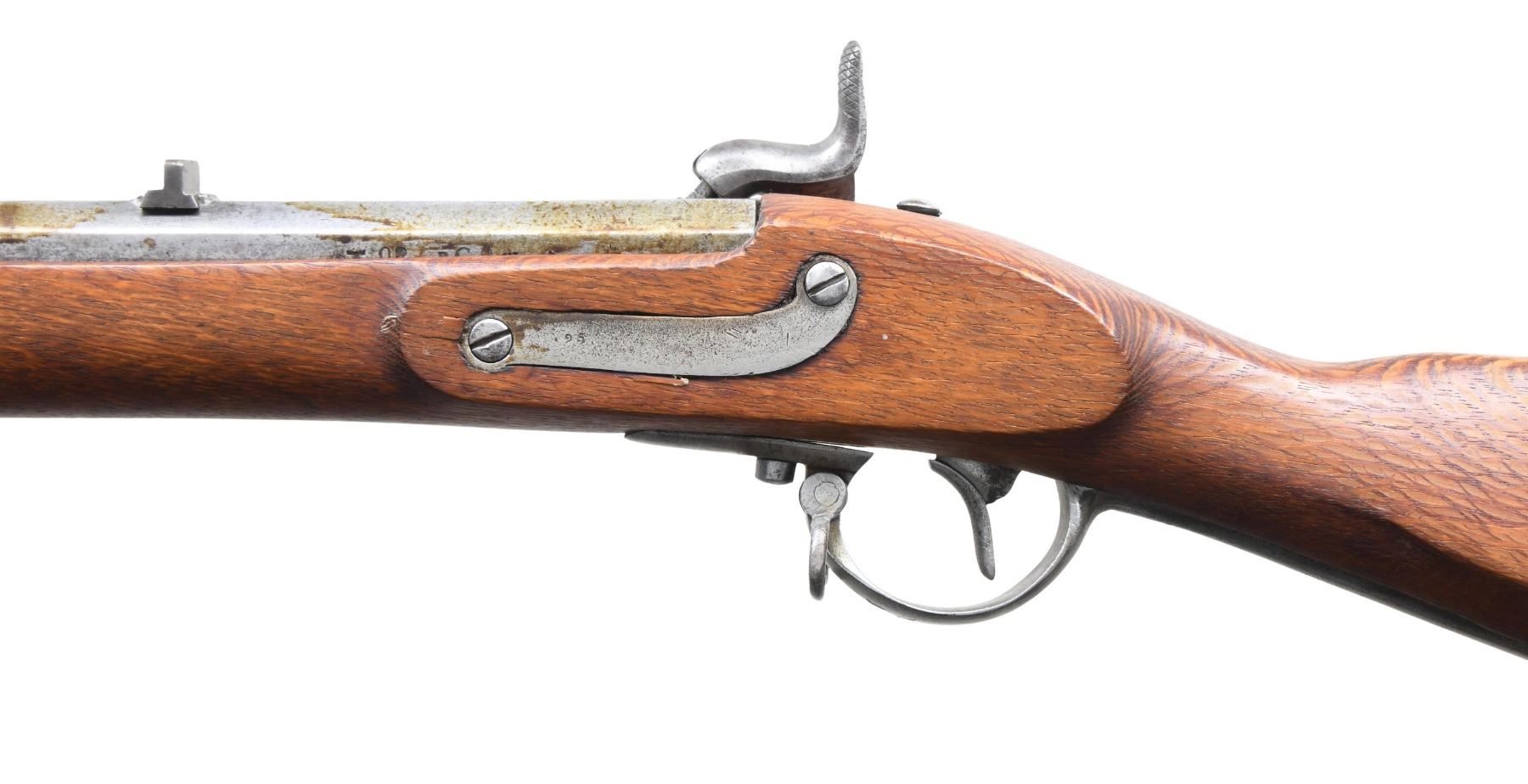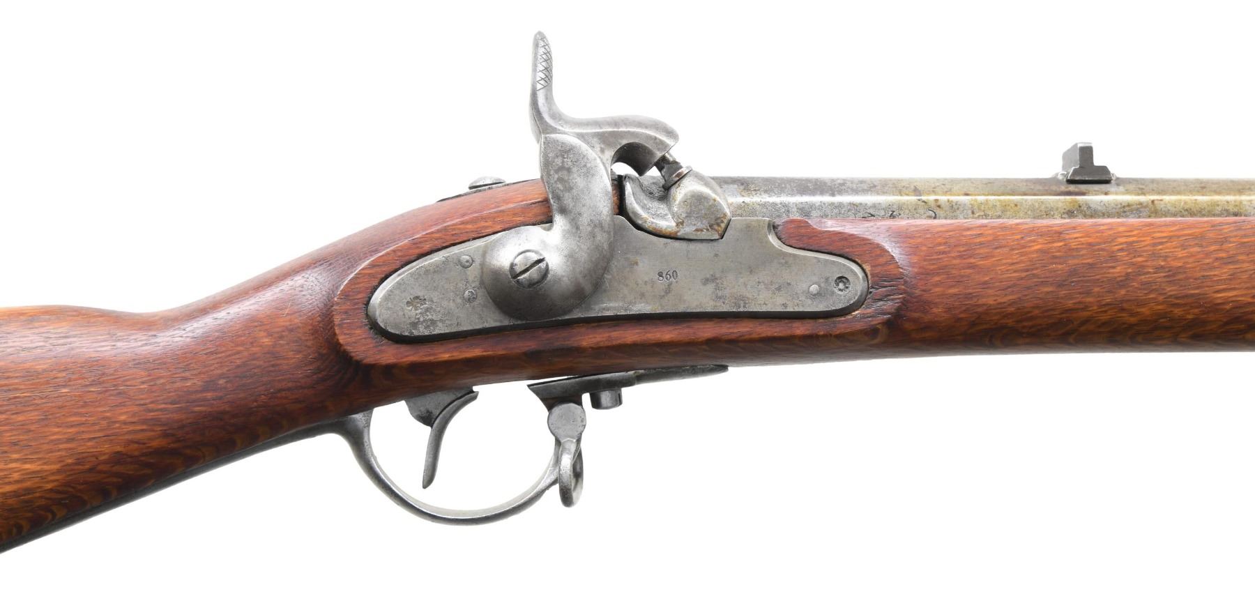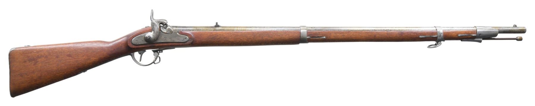 STOCK. Cal. 58. S# NSN. The 37" barrel with octagonal breech section has proof marks on left flat. Barrel is fitted with "U" notch rear and blade front sights. Percussion lock is marked "860" at center and has double eagle proof at rear. Stock appears to be of sycamore and is iron mounted. Buttplate and sideplate are stamped with various numbers. No marks are found on wood. Barrel attaches to stock with three spring retained bands that also have number stamps. A tulip head steel ramrod is present. CONDITION: good. Metal parts cleaned to pewter gray with some scattered light pitting. Stock appears to be of newer manufacture and retains most of its original oil finish. Five groove rifle bore is good; lightly pitted throughout. Lock is good. (01-25591/MGM). ANTIQUE. $500-800.