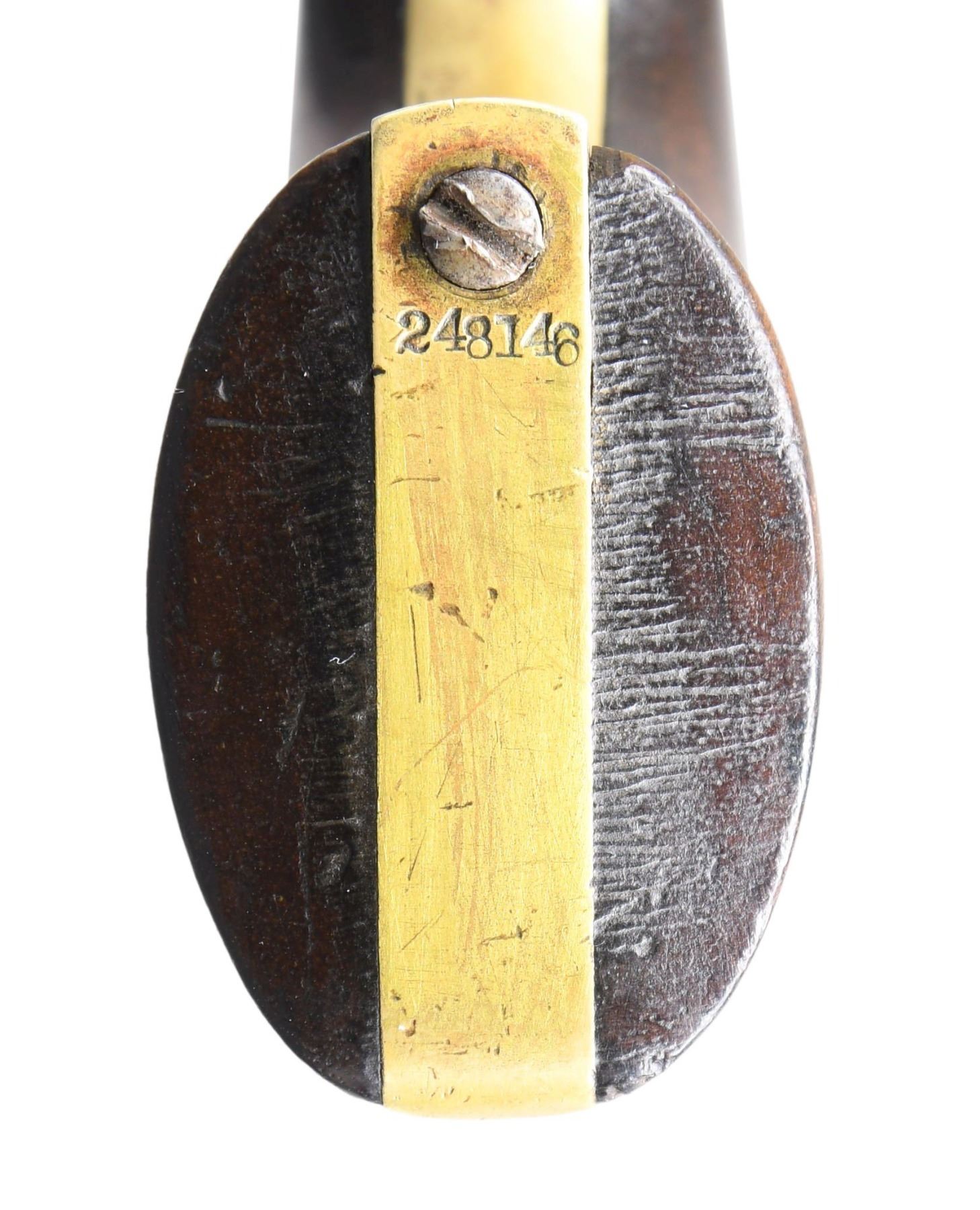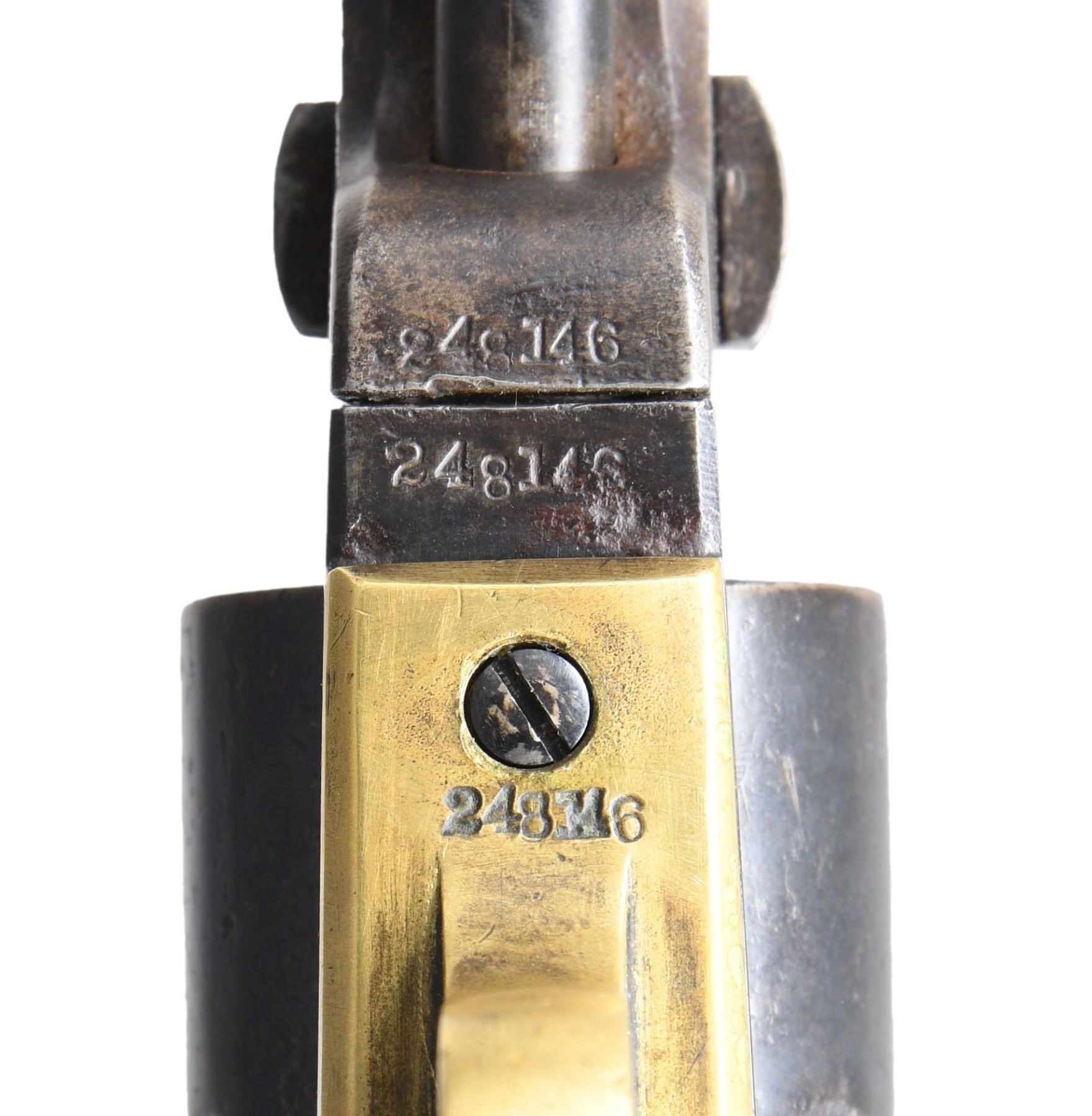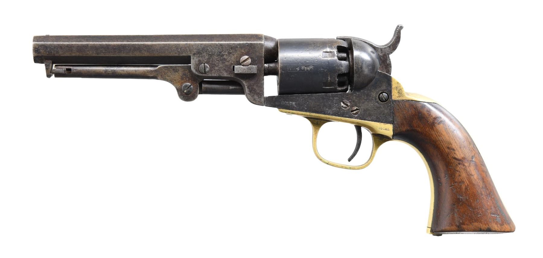REVOLVER. Cal. 31. S# 248146. Bbl. 5". Model 1849 Pocket single-action percussion revolver mfg. by Colt in 1863. Top flat of the octagonal bbl. is marked with Colt's mfg. information. Left side of the frame is faintly marked "COLTS/ PATENT." Iron components exhibit a reapplied blue finish. Brass trigger guard and backstrap, with a one-piece smooth wood grip. Grip appears to have been lightly sanded and revarnished at one time. Brass front sight has been flattened. All serialized parts are matching and include the frame, trigger guard, backstrap, cyl., cyl. base pin, bbl., bbl. wedge, as well as the loading lever. CONDITION: iron components retain fair amounts of their reapplied blue finish, with the balance exhibiting a mixture of brown and gray patinas, with varying degrees of pitting present overall. Brass trigger guard and backstrap appear to have been cleaned at one time, with some areas of age-related discoloration. Dark, pitted bore, retaining strong rifling throughout. Grip exhibits some scattered marks and minor impressions from handling and storage but otherwise remains sturdy and serviceable. PROVENANCE: from the collection of a Tennessee gentleman. (01-25672/MLW). ANTIQUE. $800-1,200.
