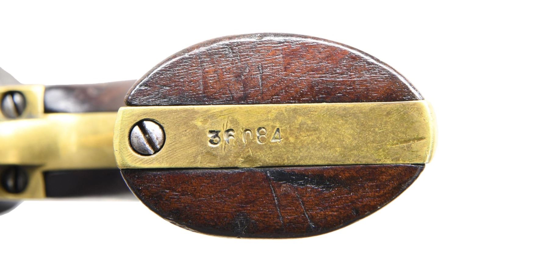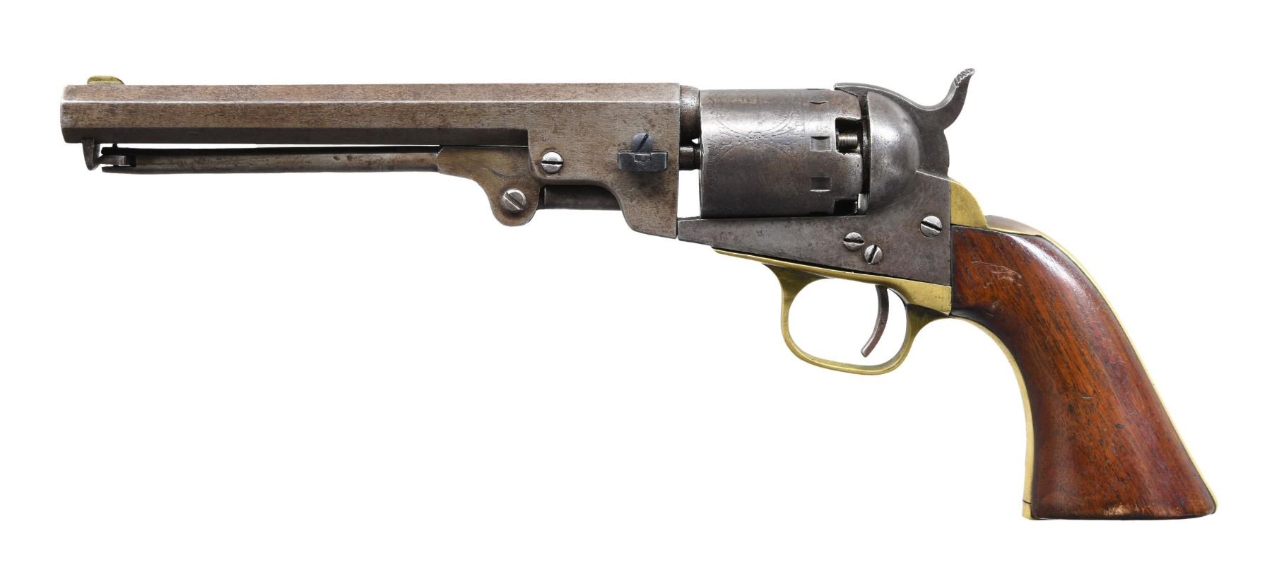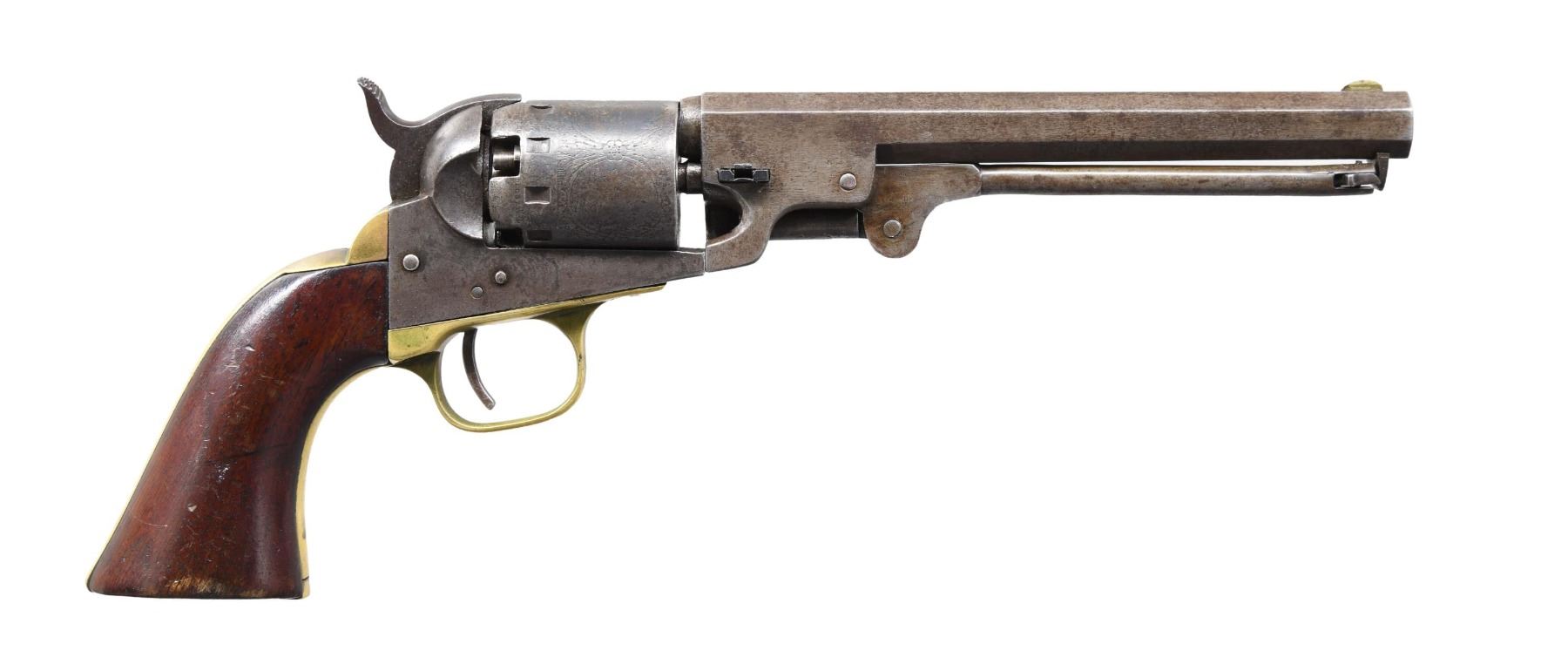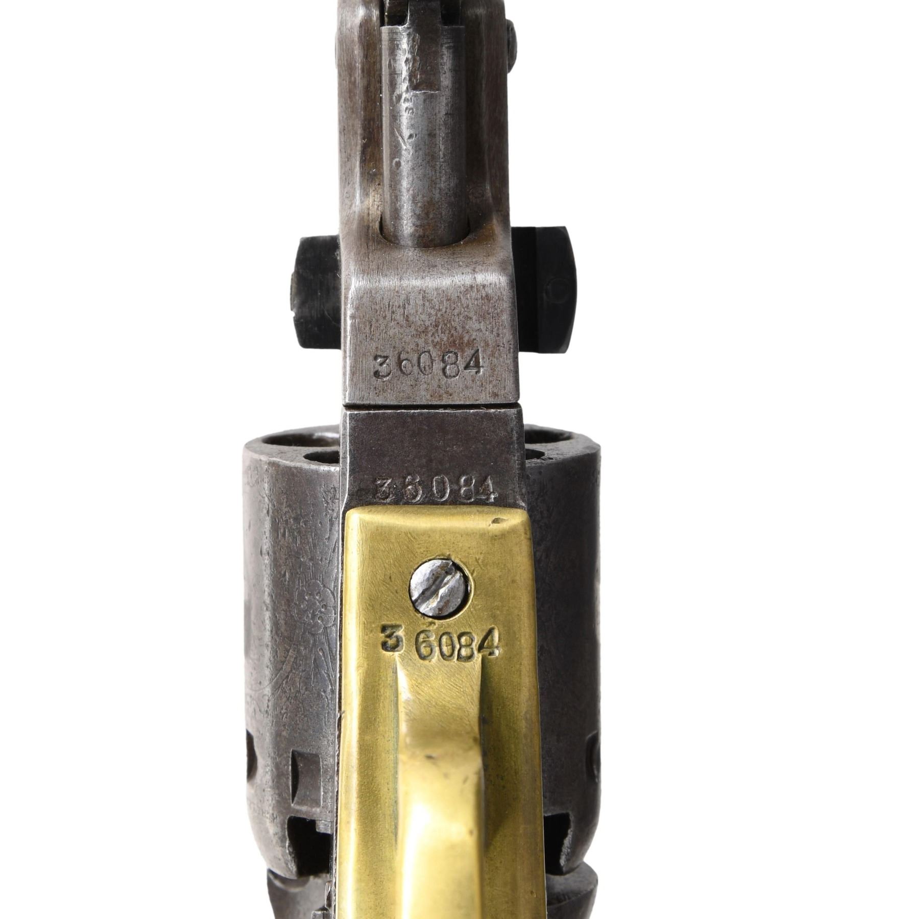 Cal. 36. S# 36084. Bbl. 6 1/2", octagonal, with German silver blade front sight. Five-shot round roll engraved cyl. Original finish is blue and case colored with silver-finished grip straps. One-piece walnut grip. Bbl., frame, and grip straps have matching serial numbers. Replacement wedge. Estimated production of 78,000 mfg. 1859-1868. CONDITION: metal finish has faded to gray, showing some very light pitting. Cyl. retains 70% scene. Grip straps show faint traces of silver. Action screws show screwdriver distortion. Sanded and refinished grips are undersized, showing scratches and marks. Timing of cyl. is slow when action is cycled. Lightly pitted bore retains worn rifling. (01-25599/DS). ANTIQUE. $700-1,000.