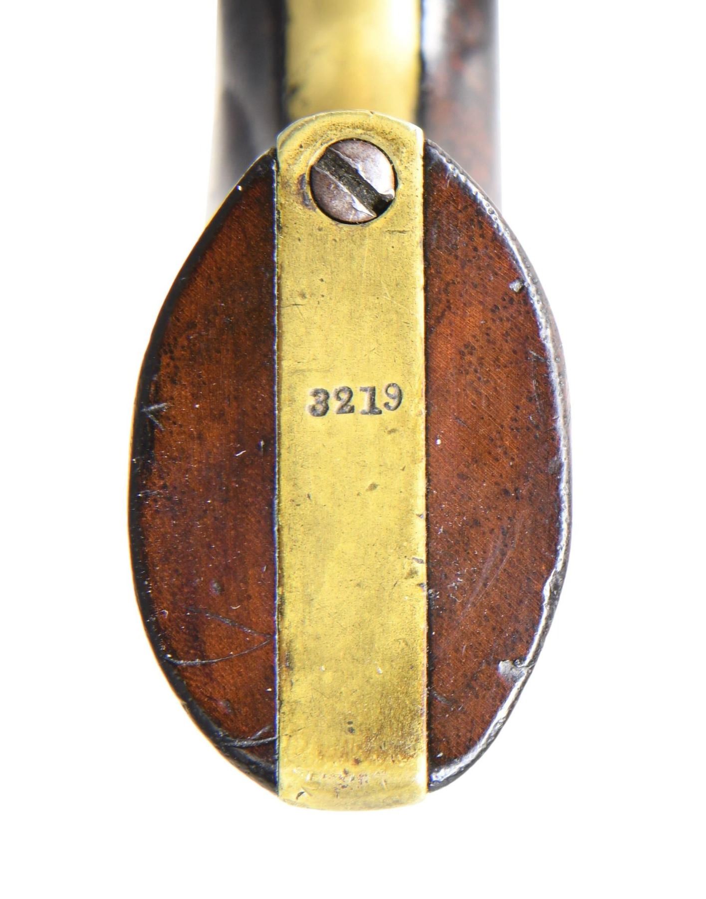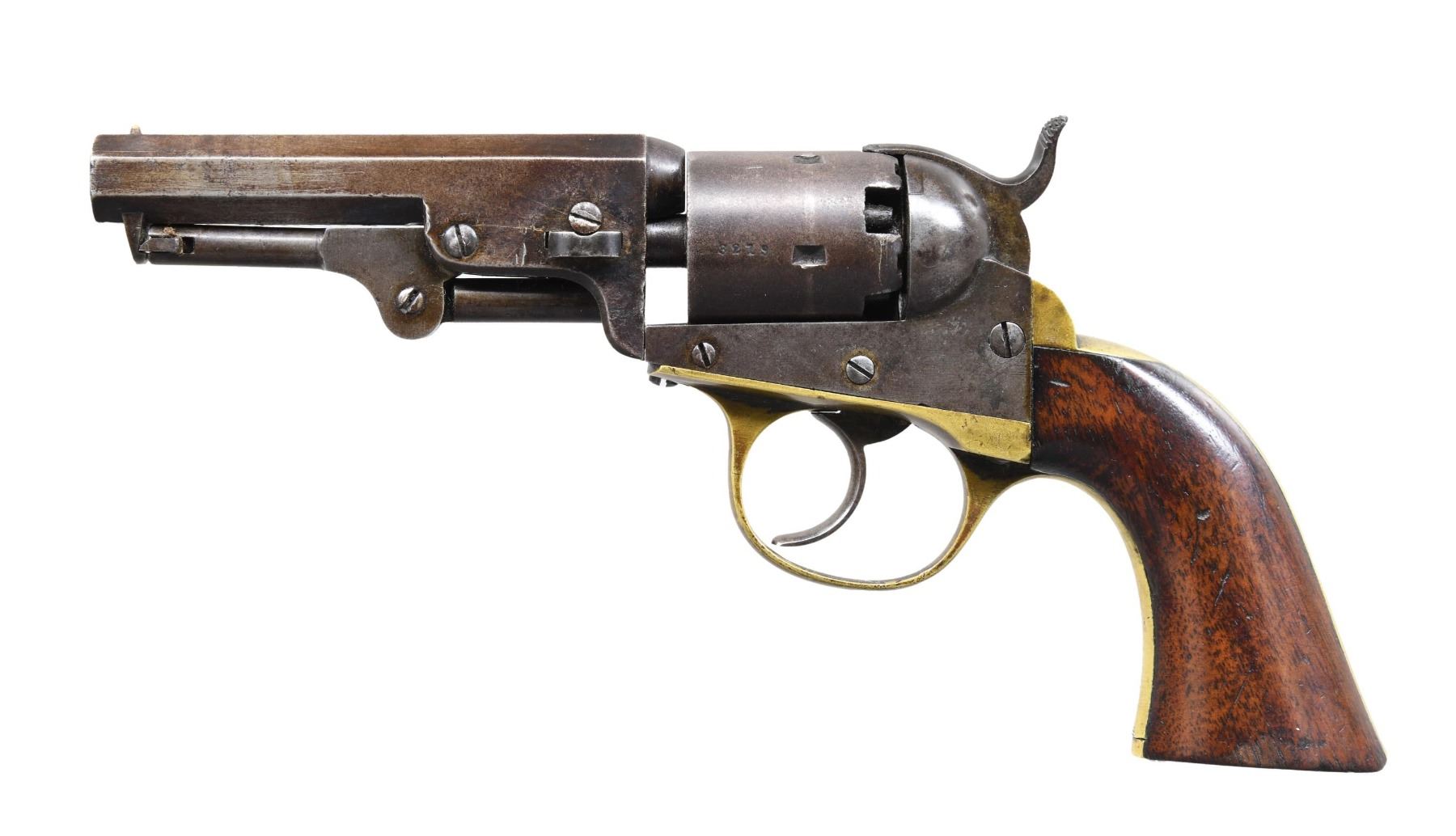 Cal. 31. S# 3219. Bbl. 4", octagonal. Five-shot round cyl. Original finish was blue and case-colored with silver-finished brass grip straps. One-piece walnut grips. CONDITION: metal has faded to brown, showing handling marks and some very light pitting. Grip straps have faint traces of silver finish. Grips show wear and handling marks with small chips around the butt. Functioning action. Lightly pitted bore has sound rifling. (01-25601/DS). ANTIQUE. $700-1,000.