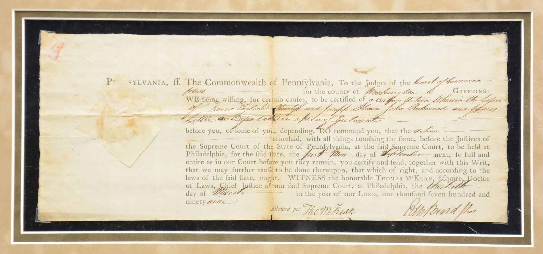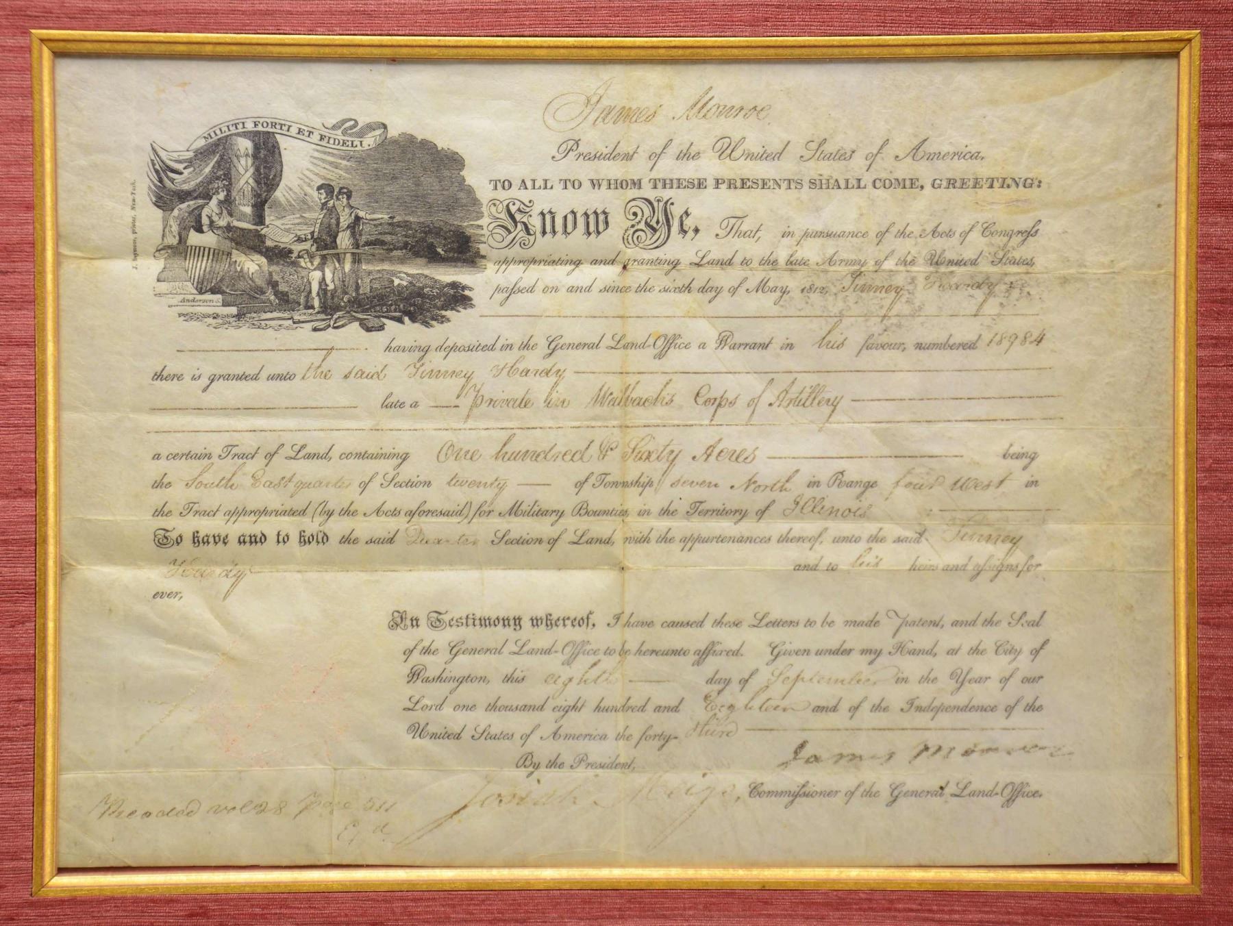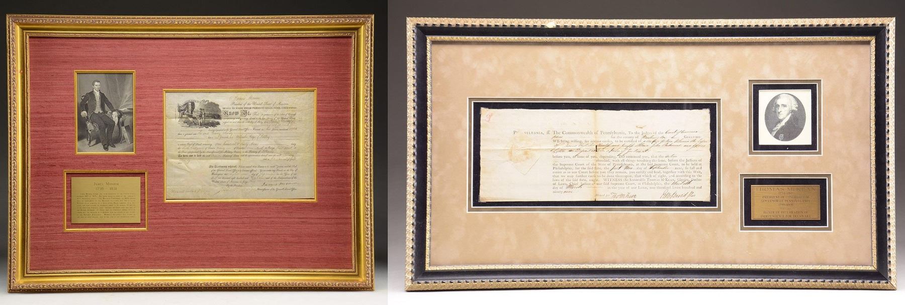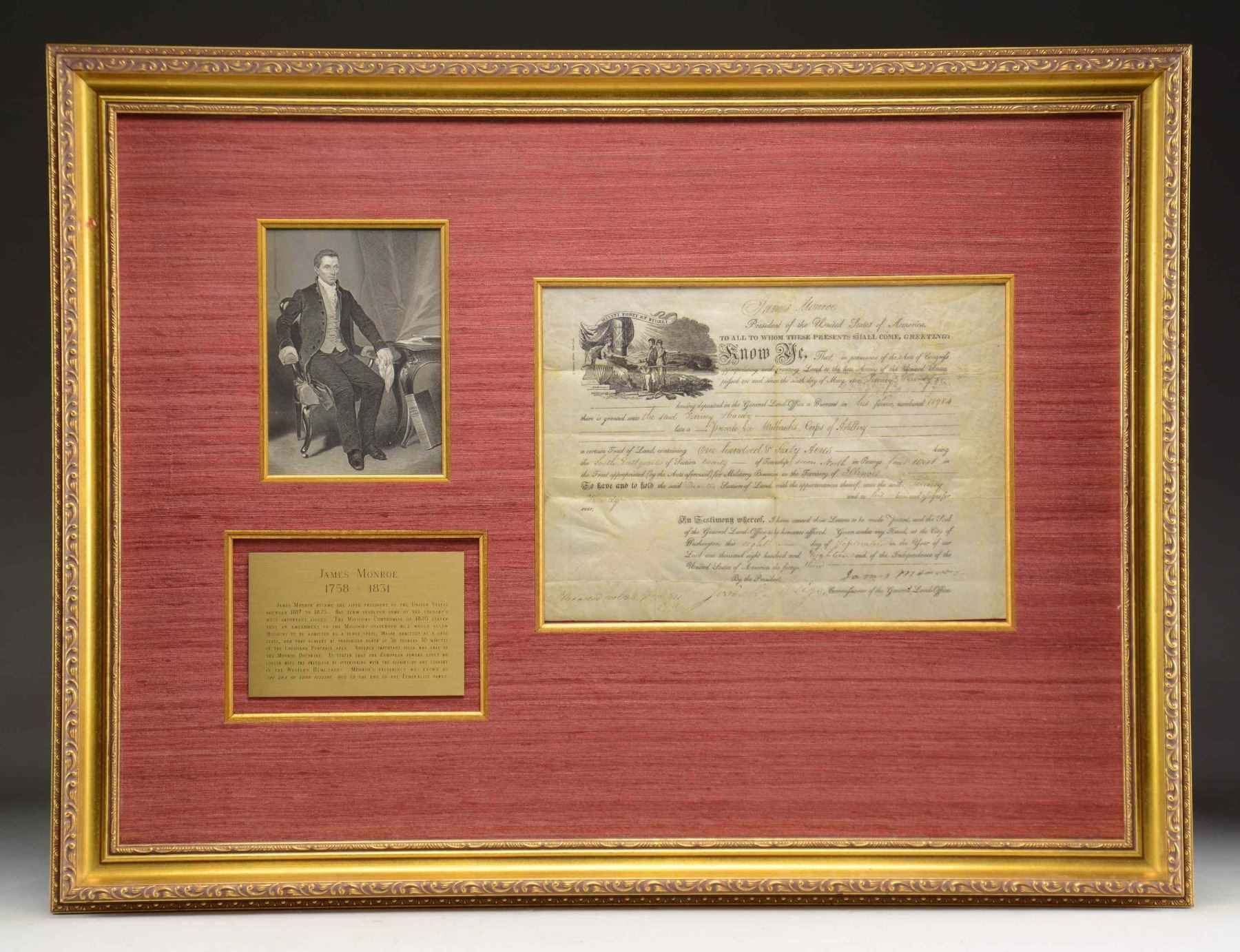 MONROE & THOMAS McKEAN. 1) JAMES MONROE. A signed presidential land grant from James Monroe, dated "8 September 1818". The grant gives 160 acres of land, in the territory of Illinois, to Tinney Hardy, who was a Private in Walbach’s Corps of Artillery during the War of 1812. The land grant is pre-printed and filled in with a dip pen and ink. The document is signed "James Monroe" and also bears the signature of Josiah Meigs. The grant has a sight size of nearly 13" x 9 1/2" and is attractively framed with an engraving of James Monroe and a 6" x 4" engraved plaque with a short biography of James Monroe. The entire frame measures 32" x 24". CONDITION: the document has not been examined out of the frame. It shows evidence of being folded but no noticeable separations. There is minor discoloration, but the document remains clear and perfectly legible. 2) THOMAS McKEAN. A signed document from Chief Justice of the Pennsylvania Supreme Court, Thomas McKean, referencing a plea of ejectment. Thomas McKean was born in 1734 and died in 1817. He was President of the Continental Congress in 1781 and Governor of Pennsylvania from 1799 to 1808. He also has the distinction of being one of the signers of the Declaration of Independence while a member of the Delaware Delegation. The document has a sight size of nearly 13 1/4" x 5 1/2" and is attractively framed with an engraving of James Monroe and a 4" x 2" engraved plaque with a short biography of Thomas McKean. The entire frame measures 28" x 15 3/4". CONDITION: the document has not been examined out of the frame, but it appears quite solid with fold marks and very slight separations at the center fold. The frame is quite solid, with one minor chip to the edge at the top. (02-23058-1/BF). $1,200-1,800.
