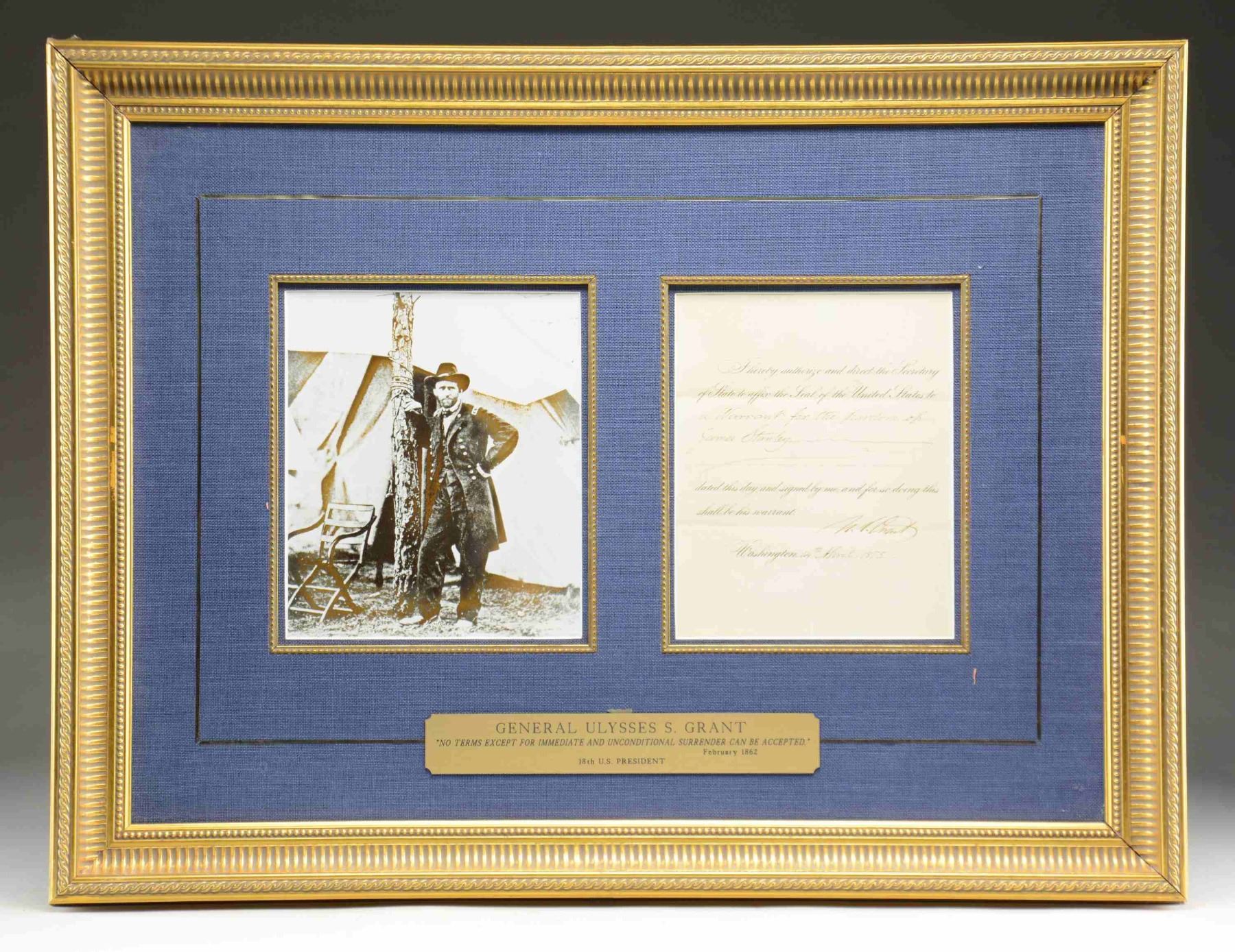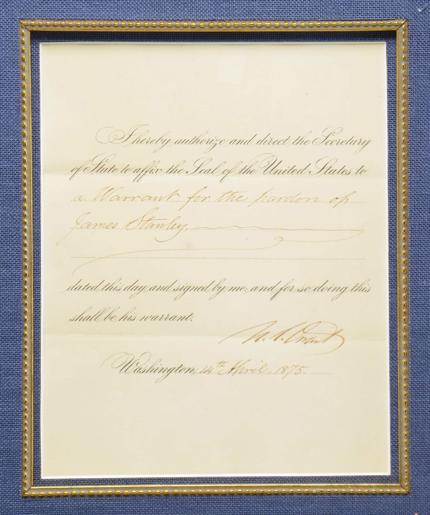 1875. This is a printed pardon document that has been filled in with the name "James Stanley" and signed boldly "U.S. Grant". The document is dated "14th April 1875" and was issued at Washington, DC. The sight size of the document is 9" x 7", and it is framed with a similarly sized copy of a photograph of General Ulysses S. Grant. The outer frame measures approx. 22" x 28 1/2". CONDITION: the document has not been examined out of the frame, but it appears to be quite crisp and sharp with no folds or damage of any kind. The frame shows handling wear only. (02-23058-2/BF). $800-1,100.