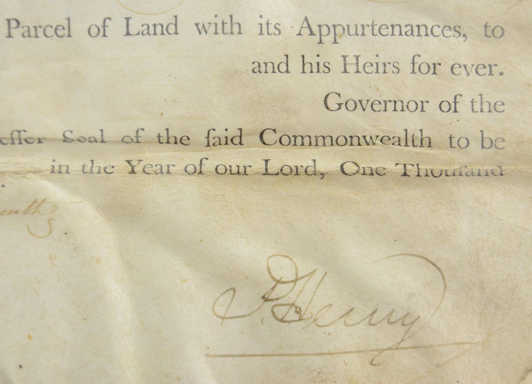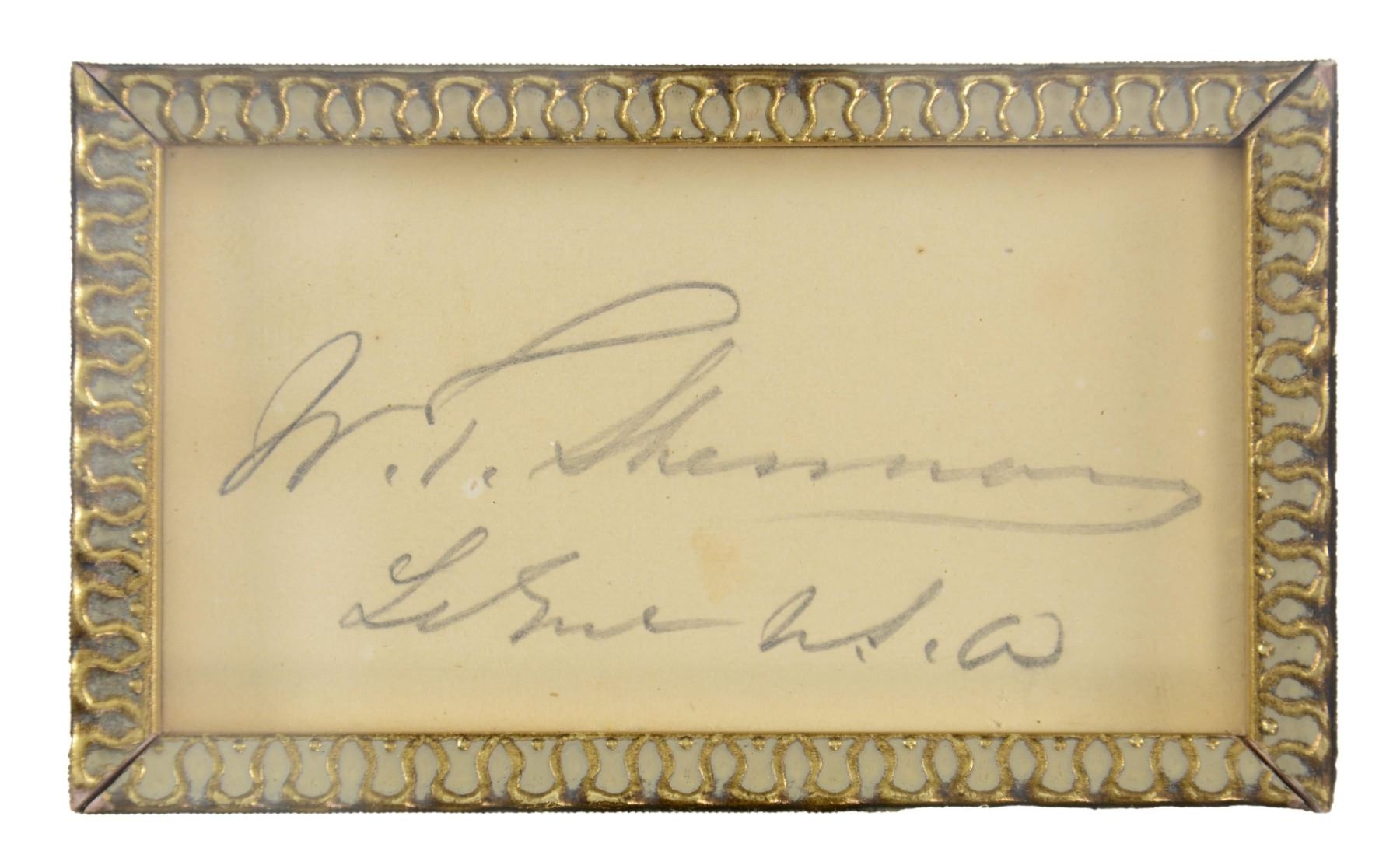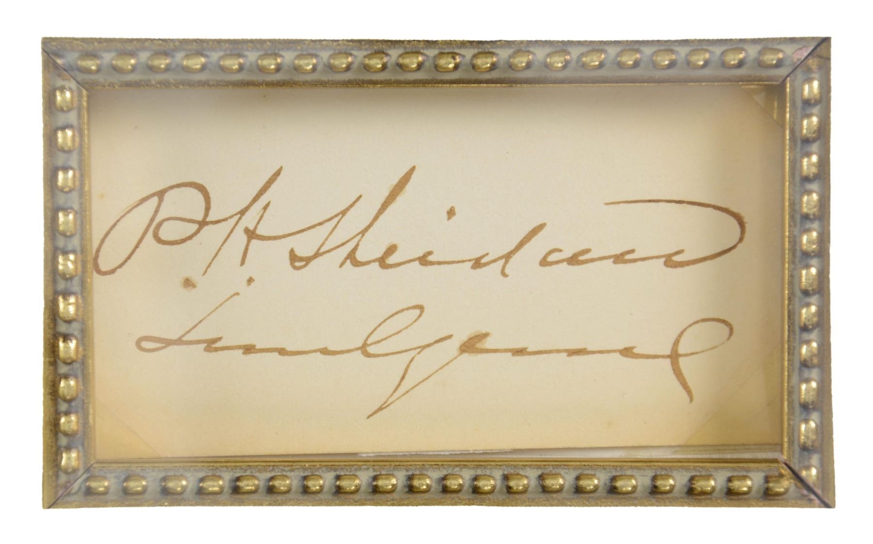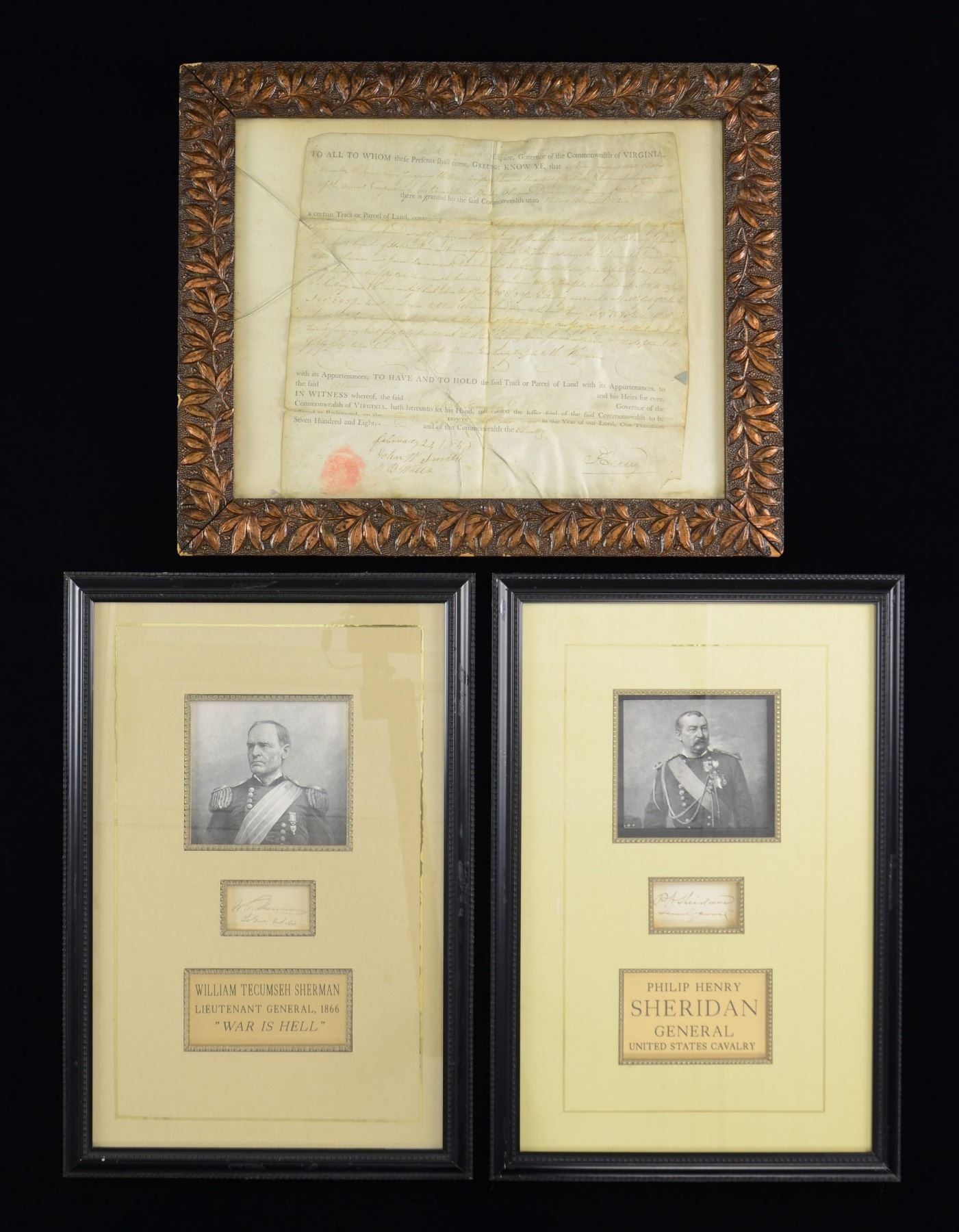 SHERMAN, & PHILLIP SHERIDAN. 1) State of Virginia Land Grant, Oct. 10, 1786, signed "P. Henry" governor of Virginia. Patrick Henry is scarce Revolutionary War founding father signature. He is most famous for his 1775 speech "give me liberty, or give me death". Vellum document is soiled, cracked at one fold, light faded, bottom corner torn, signature panel is fair. Frame is poor with broken glass. 2) William Tecumseh Sherman signed framed calling card "WT Sherman / Lt. Gen USA". Framed with engraving of Sherman, has COA Mounted on back of frame, signature is very good in pencil. 3) Phillip Sheridan framed clipped signature "PH Sheridan / Lieut General". Framed with engraving of Sheridan, has COA & receipt from Recollections Gallery, Red Bank, NJ, 1996. Signature is very good with light fading. (02-23219/JS). NON-GUN. $700-900.