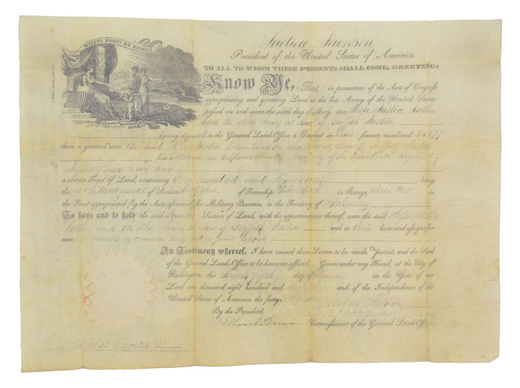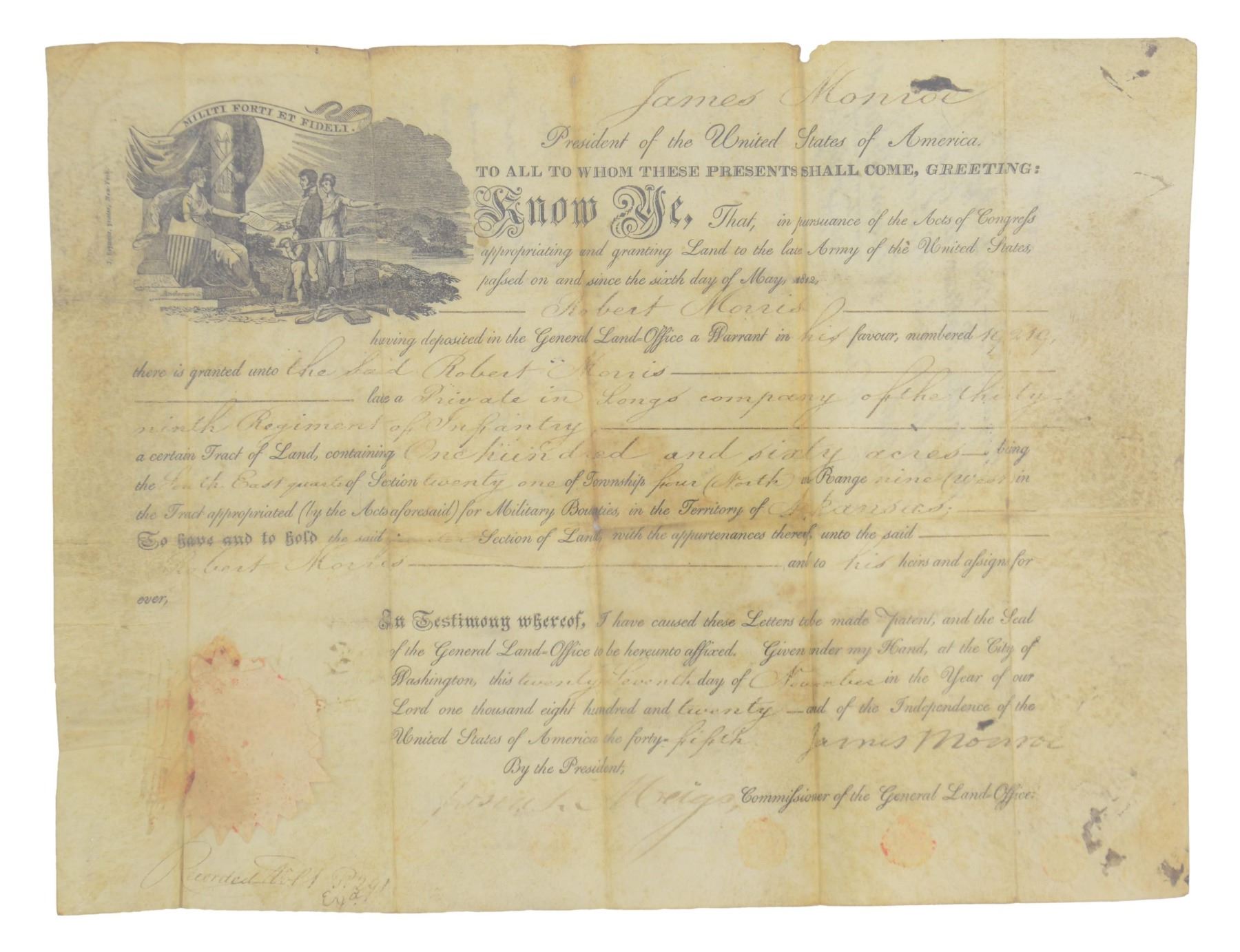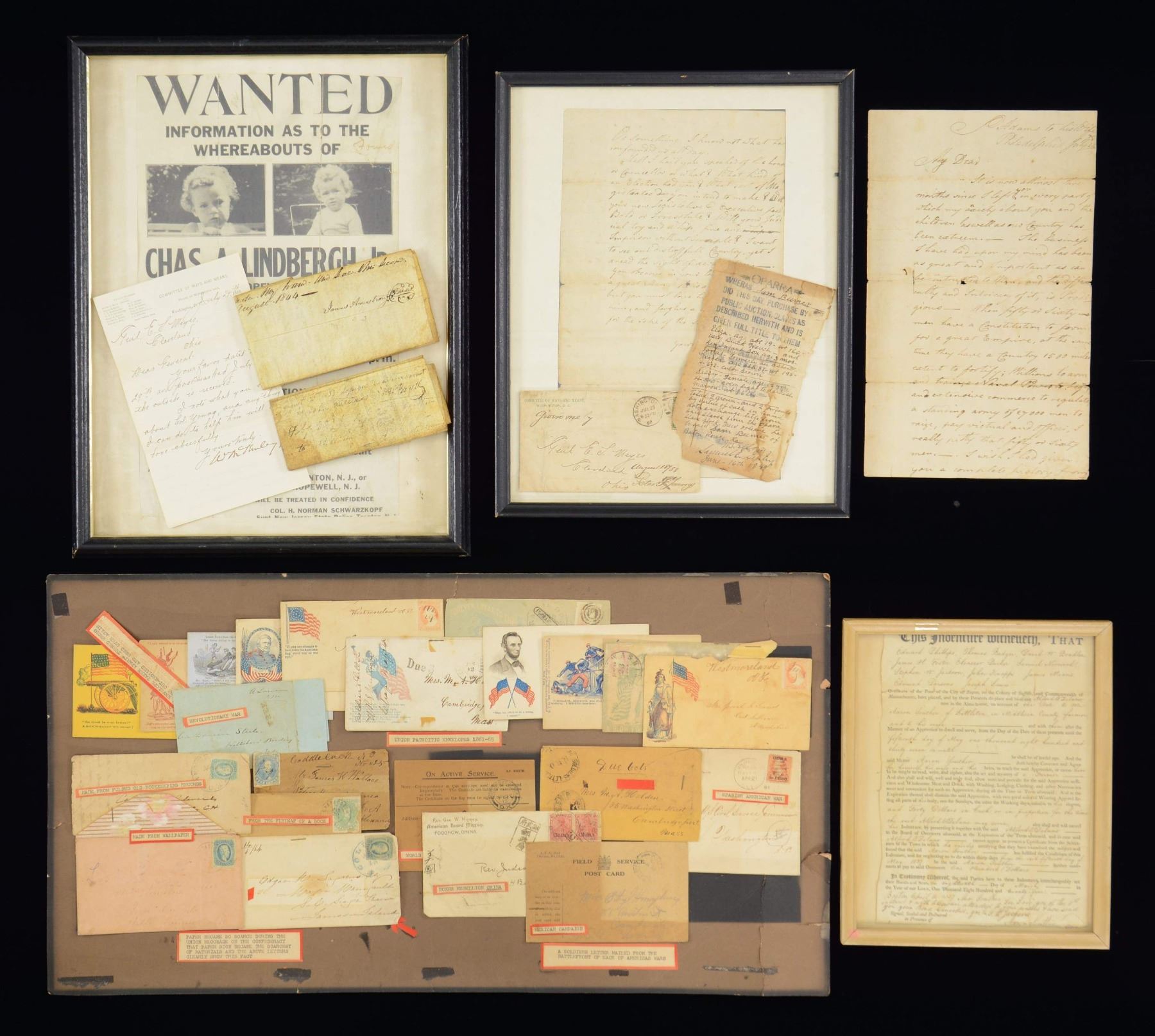 1) Two 1775 Samuel Adams, copied manuscript letters, fabulous patriotic content, both 2 pages, one framed so both sides can be read. Good overall, cracked at folds, light fading, light staining & soiling. 2) 22 military postal covers mounted on large piece of cardboard with pasted captions, 5 are Confederate, 12 are US Civil War patriotic, others from Boxer rebellion, & Span-Am War. Fair as mounted on board with glued labels, light fading. 3) William McKinley letter signed as congressman on "Committee of Ways and Means" stationery July 24, 1888 with envelope. Letter is fine, cover soiled, folded. 4) James Monroe, signed land grant as president, 1820, for military bounty of land in Arkansas. Vellum document is fair, folds, stains, all discernible. 5) Andrew Jackson, secretarial signed land grant, 1836 for military bounty of land in Arkansas. Vellum document is good overall, folded, soiled exterior. 6) 17" x 13" framed "Wanted Poster" concerning abduction of "CHAS. A. LINBERGH, JR", two images of the Lindbergh baby. Not removed from frame, fair overall, cracks and folds, paper mat covers portions of edges, but text appears complete. And few other miscellaneous pieces. (02-23243/JS). $700-900.