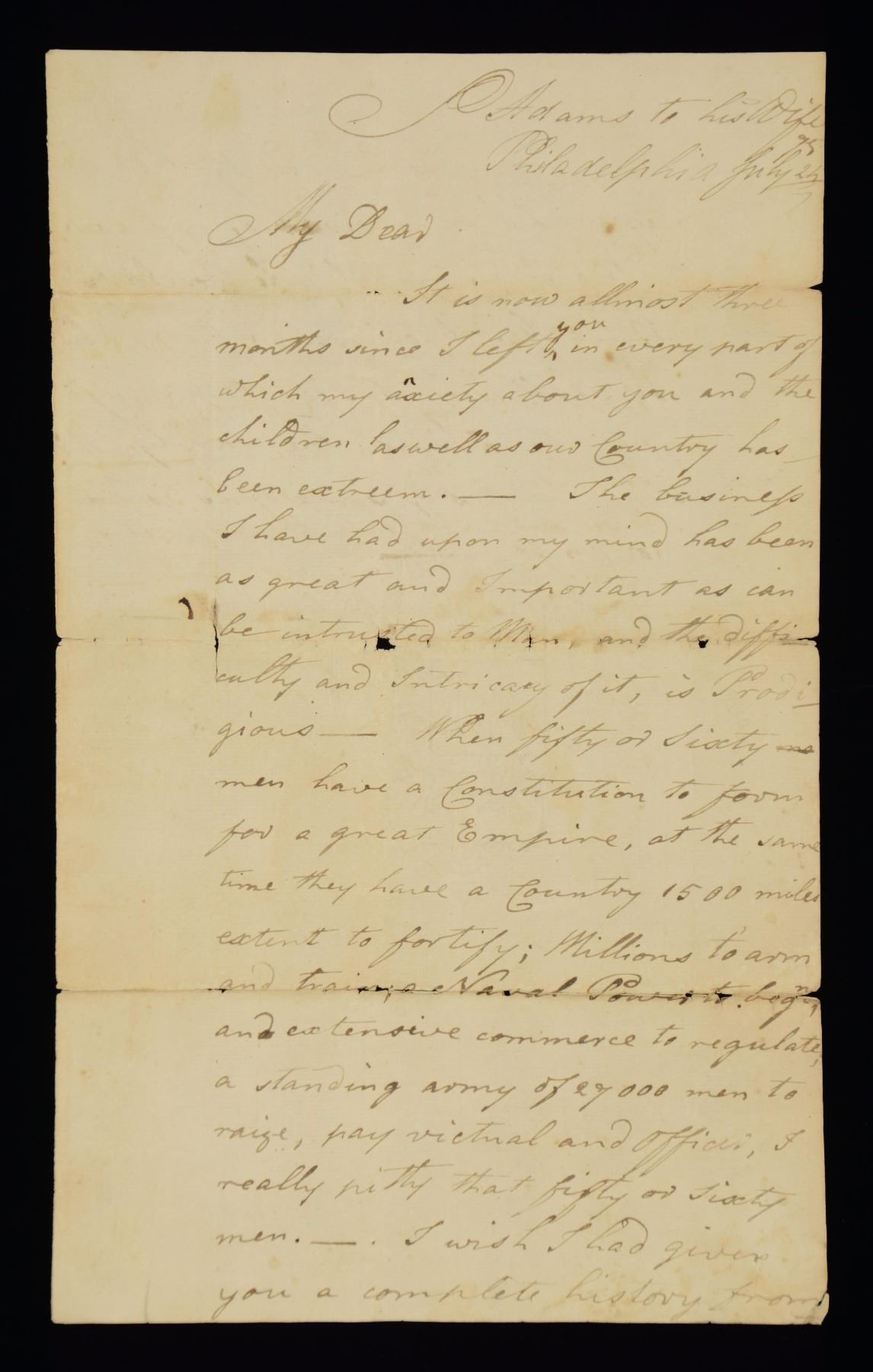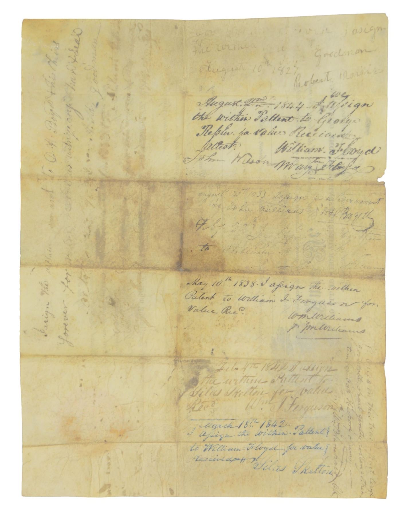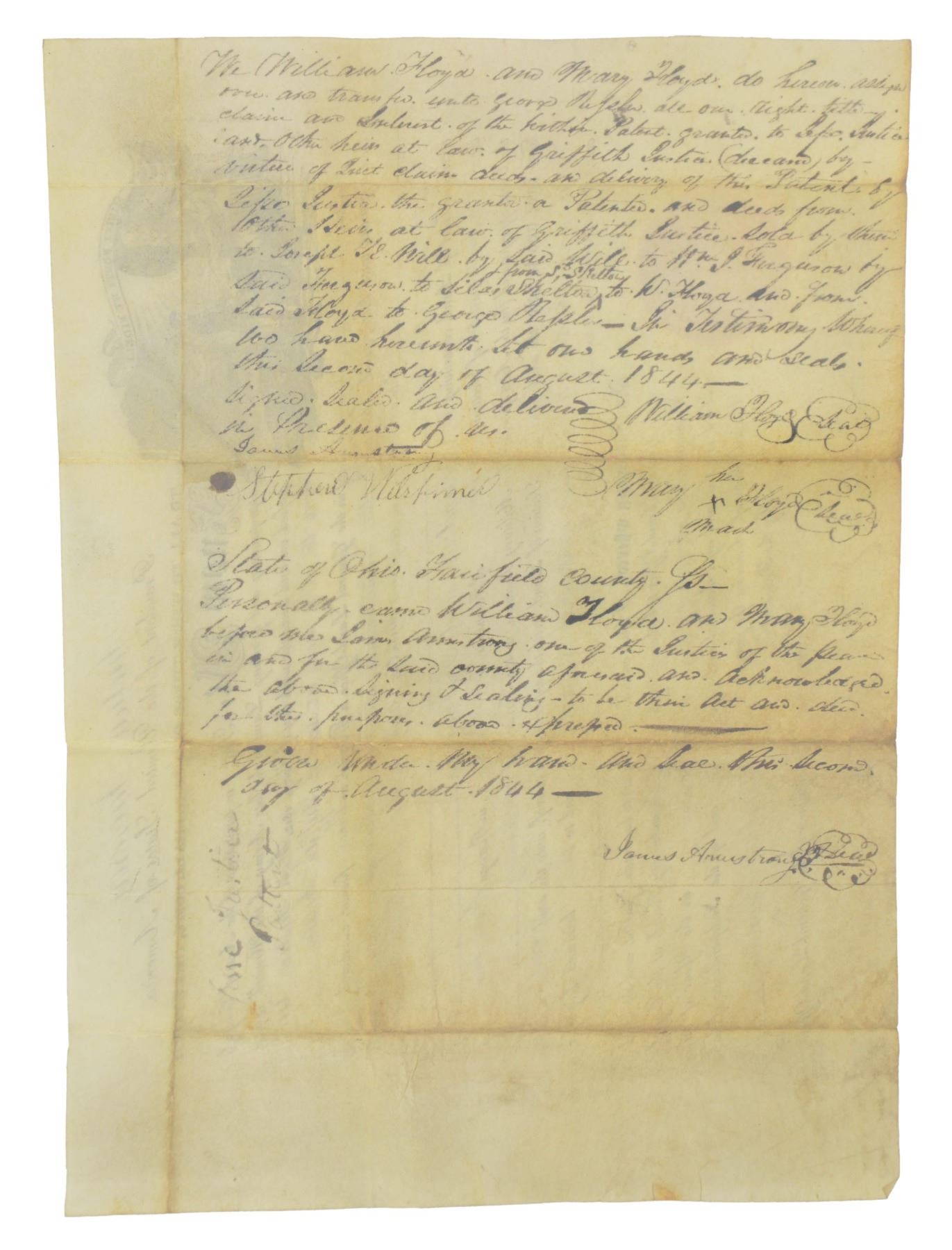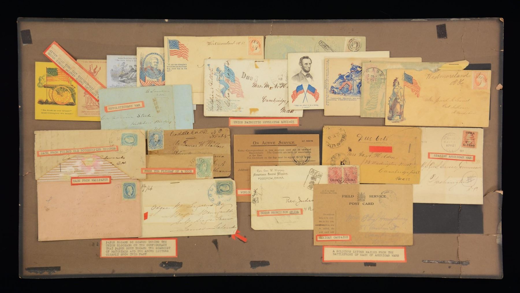 1) Two 1775 Samuel Adams, copied manuscript letters, fabulous patriotic content, both 2 pages, one framed so both sides can be read. Good overall, cracked at folds, light fading, light staining & soiling. 2) 22 military postal covers mounted on large piece of cardboard with pasted captions, 5 are Confederate, 12 are US Civil War patriotic, others from Boxer rebellion, & Span-Am War. Fair as mounted on board with glued labels, light fading. 3) William McKinley letter signed as congressman on "Committee of Ways and Means" stationery July 24, 1888 with envelope. Letter is fine, cover soiled, folded. 4) James Monroe, signed land grant as president, 1820, for military bounty of land in Arkansas. Vellum document is fair, folds, stains, all discernible. 5) Andrew Jackson, secretarial signed land grant, 1836 for military bounty of land in Arkansas. Vellum document is good overall, folded, soiled exterior. 6) 17" x 13" framed "Wanted Poster" concerning abduction of "CHAS. A. LINBERGH, JR", two images of the Lindbergh baby. Not removed from frame, fair overall, cracks and folds, paper mat covers portions of edges, but text appears complete. And few other miscellaneous pieces. (02-23243/JS). $700-900.