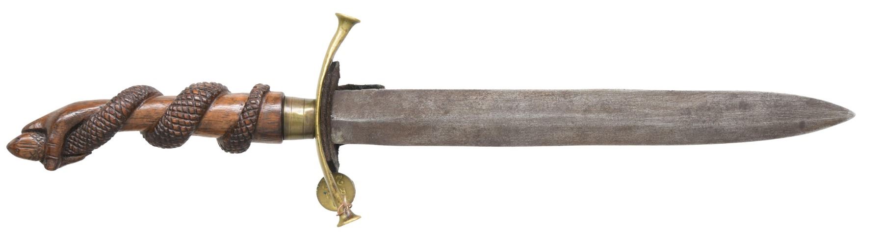 DAGGER. Dagger from the renowned Richard McCauley collection; 13.5" overall, 8.5" very sharp dagger point blade, curved down 3.5" sculpted brass crossguard, finely carved handle depicting raised relief rattlesnake wrapped around arm and fingers folding snake's head. UNATTACHED ACCESSORIES: 2005 bill of sale stating provenance. CONDITION: very good overall, accompanying scabbard fits very loosely not original to the knife. (02-23366-8/JS). NON-GUN. $700-1,900.