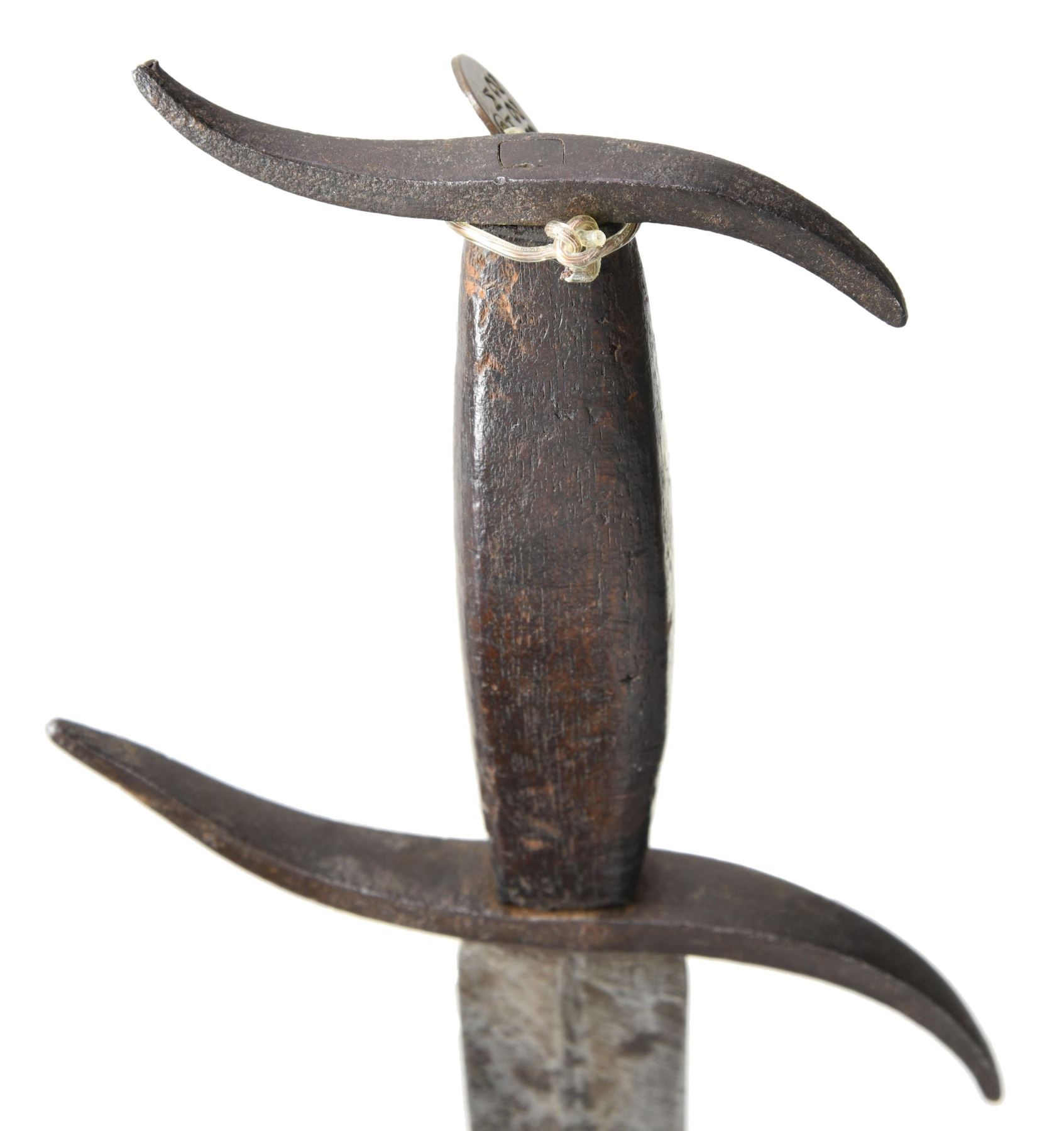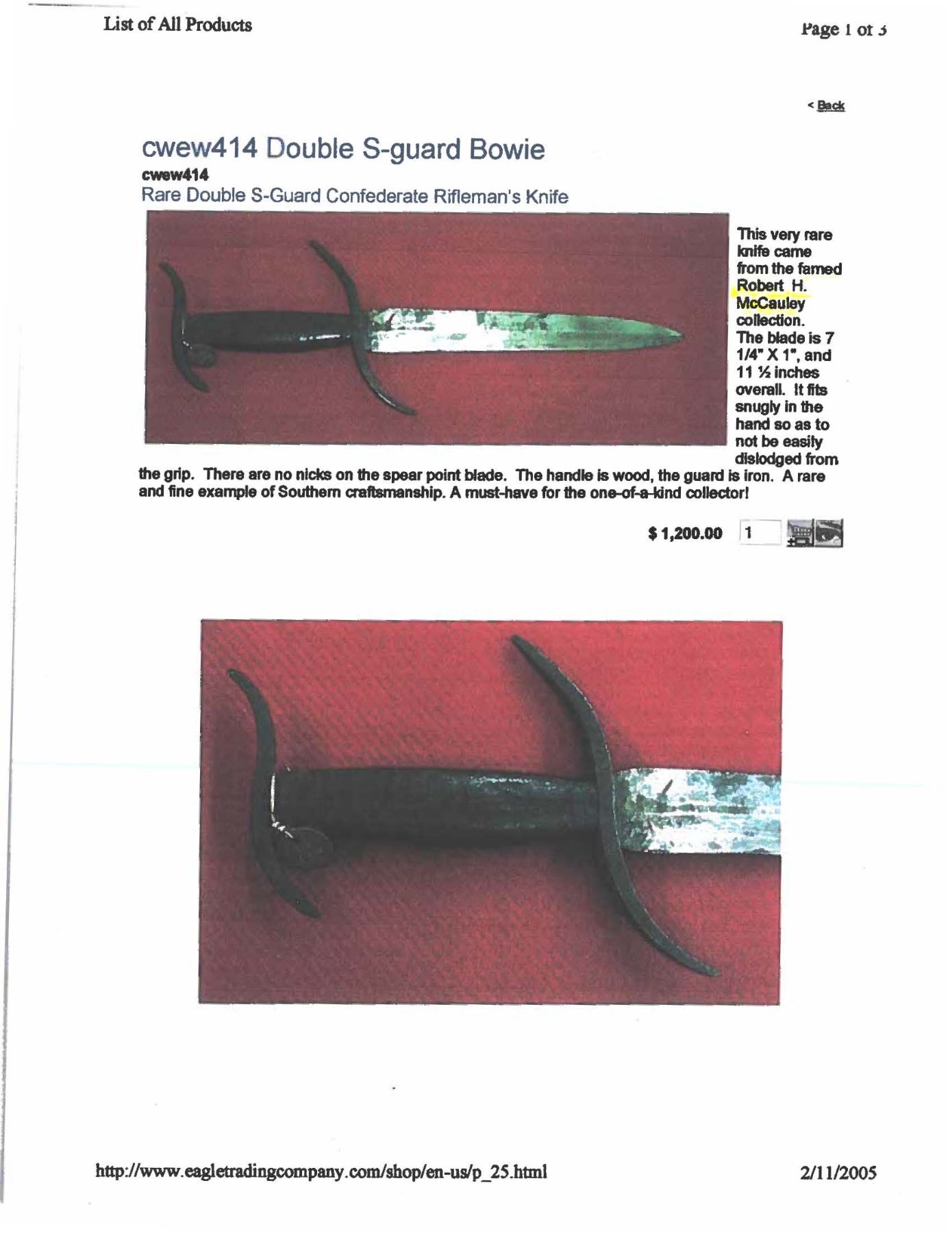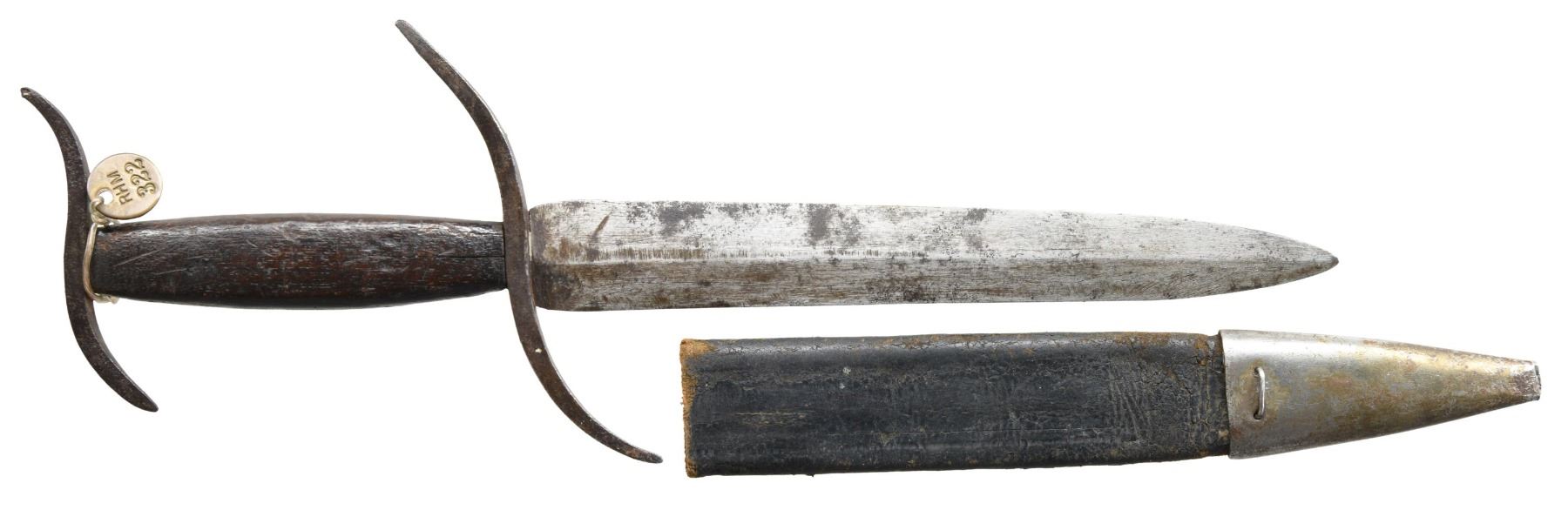 WITH DOUBLE "S" GUARDS. From the Robert H. McCauley, Jr (1913-1979) collection. 11.25" overall, 7.5" dagger point blade, unique 5.5" and 3.5" forged "S" shaped narrow tapering hand guards. UNATTACHED ACCESSORIES: 2005 bill of sale stating provenance, knife still retains Dr. McCauley’s initialed collection tag. CONDITION: very good overall, accompanying scabbard fits poorly and is added and not original to knife, made from cut-down bayonet scabbard. (02-23366-7/JS). NON-GUN. $500-1800.