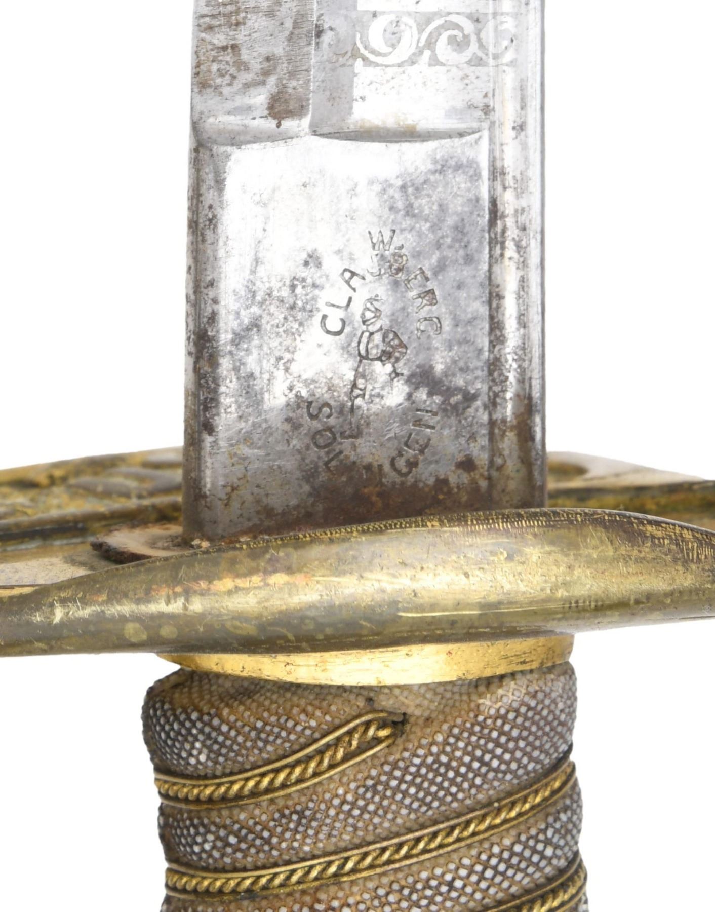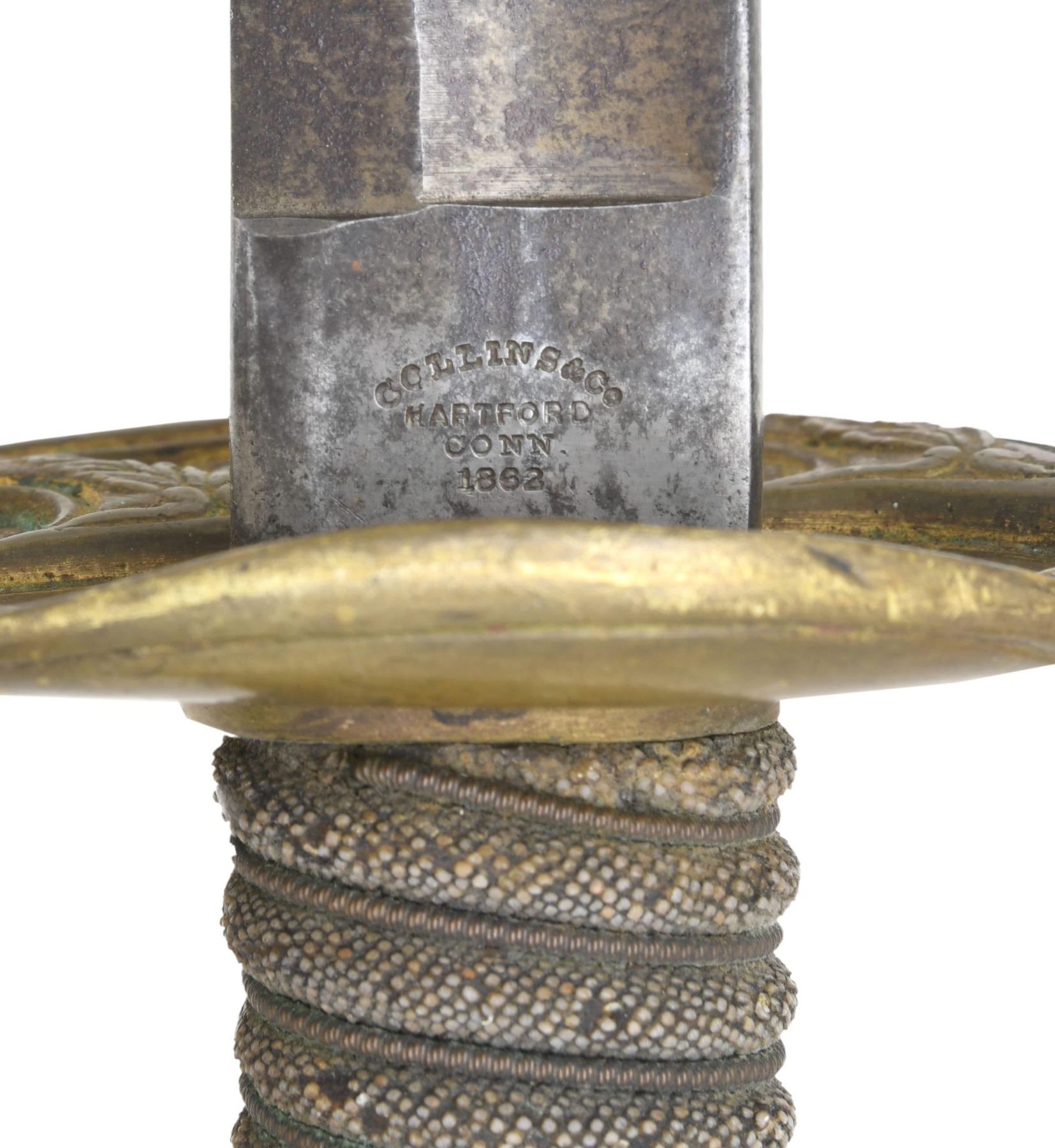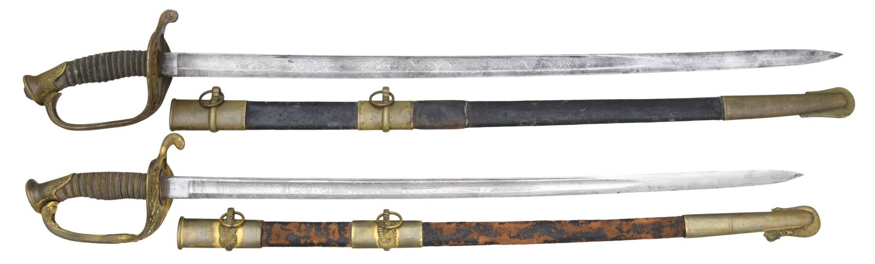 1) This is an M1850 foot officer’s sword measuring 37 1/4" overall with a 31" etched blade. Etching includes foliate and scrollwork along with patriotic and military motifs. The blade is also etched near the ricasso "W.H. HORSTMANN & SONS PHILADA". Gilded brass hilt with pierced guard showing a foliate motif. Standard pommel with wire-wrapped sharkskin grip. Gilded brass-mounted leather scabbard. CONDITION: blade has a light gray patina with clear etching. Hilt retains traces of its original gilded finish. Grip and wire are complete. Scabbard mounts show traces of the original gilded finish. Leather body has a repair at about the midpoint and does show epoxy near the tip. 2) A good example of a presentation M1852 naval officer’s sword measuring 34 3/4" overall with a 28 1/2" blade. The blade has a single wide fuller with a secondary fuller near the spine. Blade is etched with various military, nautical, and foliate motifs. The ricasso is stamped "W. CLAUBERG (knight) SOLINGEN". Gilded brass hilt with pierced guard that includes "USN". Dolphin head knuckle bow and quillon. Oak leaf decorated pommel with an eagle and stars at the top. White sharkskin grip with wire wrap. Gilded brass-mounted leather scabbard. The top mount of the scabbard is engraved "Presented TO Charles E. Tucker From His Friends of West Troy Jan. 8th 1863". CONDITION: the blade has been severely sharpened. The hilt shows light to moderate wear. The grip and wire are complete. Scabbard remains solid; however, most of the black finish of the leather has flaked away. (02-22950-1/BF). $1,200-1,500.
