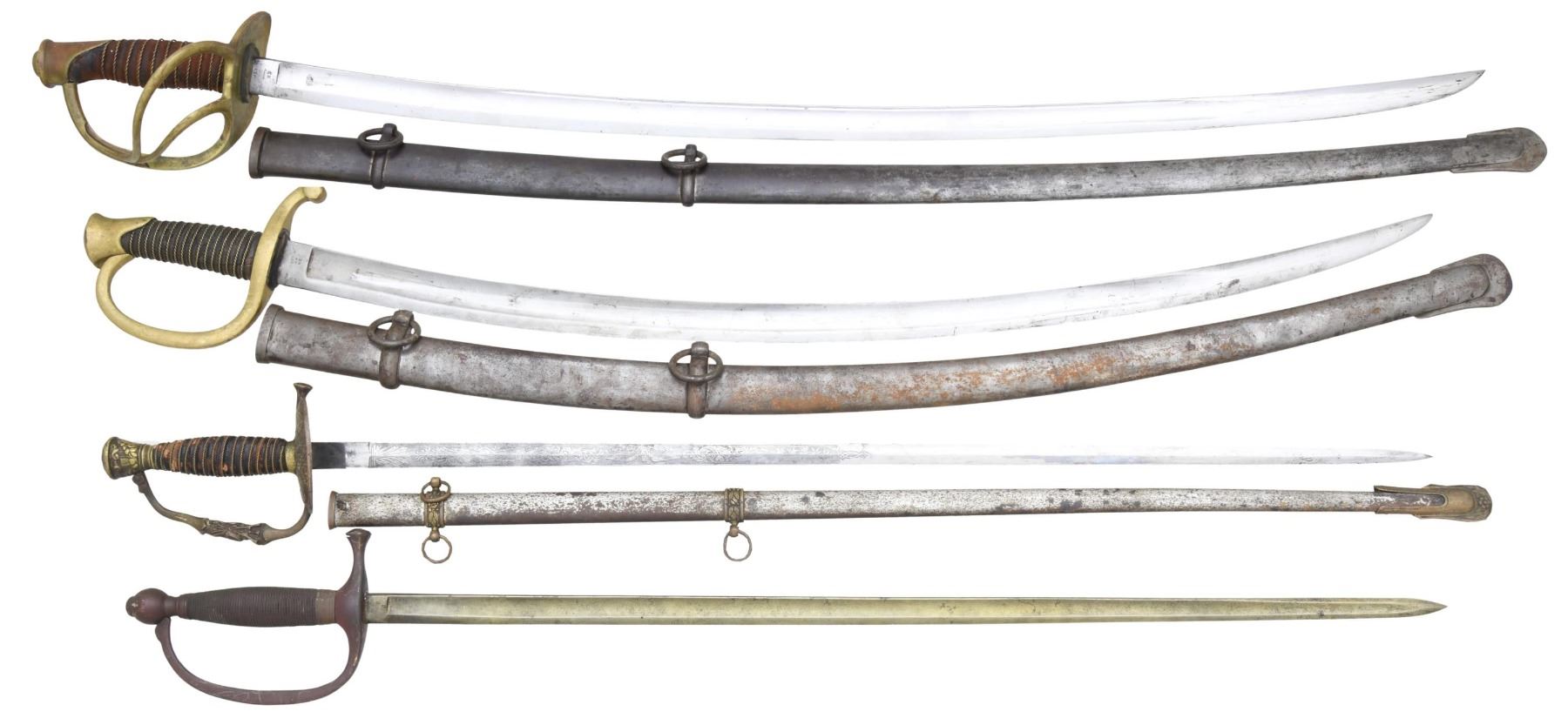 1) M1860. A fine M1860 cavalry saber with an overall length of 43" and a blade length of 34 3/4". Plain blade featuring a single large fuller with a secondary fuller near the spine. The ricasso is stamped "U.S A.D.K 1863" and "AMES MFG CO CHICOPEE MASS." Solid brass hilt with two-branch, semi-basket guard. Leather grip with wire wrap. Iron scabbard. CONDITION: blade shows substantial original factory polish. Hilt has a pleasing patina. Grip shows some loss of finish but is complete, as is the wire. Scabbard is undamaged and shows a mottled, gray/brown patina. 2) M1840. A fine example of an M1840 light artillery saber measuring 40" overall with a 32" blade. The plain blade has a single wide fuller and is stamped at the ricasso "U.S W.C 1862." Solid brass hilt with standard pommel. Leather grip with brass wire wrap. Iron scabbard. CONDITION: blade shows traces of original factory polish. Hilt is undamaged. Leather shows wear but retains the original leather in protected areas. Wire is 100%. Scabbard has a few shallow dents but remains solid. 3) M1840. An example of a US M1840 musician’s sword measuring 34 1/2" overall with a 28 1/4" blade. Plain blade with a single medium fuller stamped at the ricasso "Made by AMES MFG CO CHICOPEE. MASS" and "US H.D.H. 1864." Solid brass hilt. No scabbard. CONDITION: blade has a mottled, gray patina. Hilt shows a pleasing deep mustard patina. 4) M1860. A post-Civil War period M1860 staff and field officer’s sword measuring 36 1/2" overall with a 30" blade. The blade has a raised medial ridge and is etched with military, patriotic, and foliate motifs. There is no maker’s mark on the blade. Gilded brass hilt with a single eagle-decorated guard. Knuckle bow is embellished with a spray of arms, and the pommel has an American eagle on one side. Wire-wrapped leather grip. Gilded brass-mounted iron scabbard. CONDITION: blade shows areas of original factory polish. Hilt is a bit loose, slightly misshaped, and shows only traces of original gilding. Leather grip is 85%, and the wire is complete. Scabbard mounts show only traces of original gilding, and the body retains 40% of original plating. (02-22950-2/BF). $1,000-1,400.