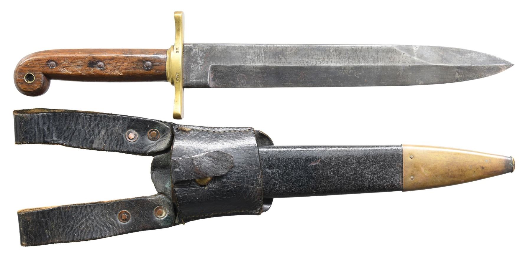 SHEATH. 17.75" overall, 12" blade stamped on ricasso "AMES MFG CO / CABOTSVILLE 1849" and inspection marks on opposite ricasso and on brass crossguard. It takes a little scrutiny to tell this knife is not original. According to accompanying note this was commissioned by author Stephen Dorsey. Like the knife, the brass mounted sheath and frog are excellent facsimiles also. UNATTACHED ACCESSORIES: note stating purported provenance. CONDITION: very good define overall. (02-23126/JS). NON-GUN. $500-700.