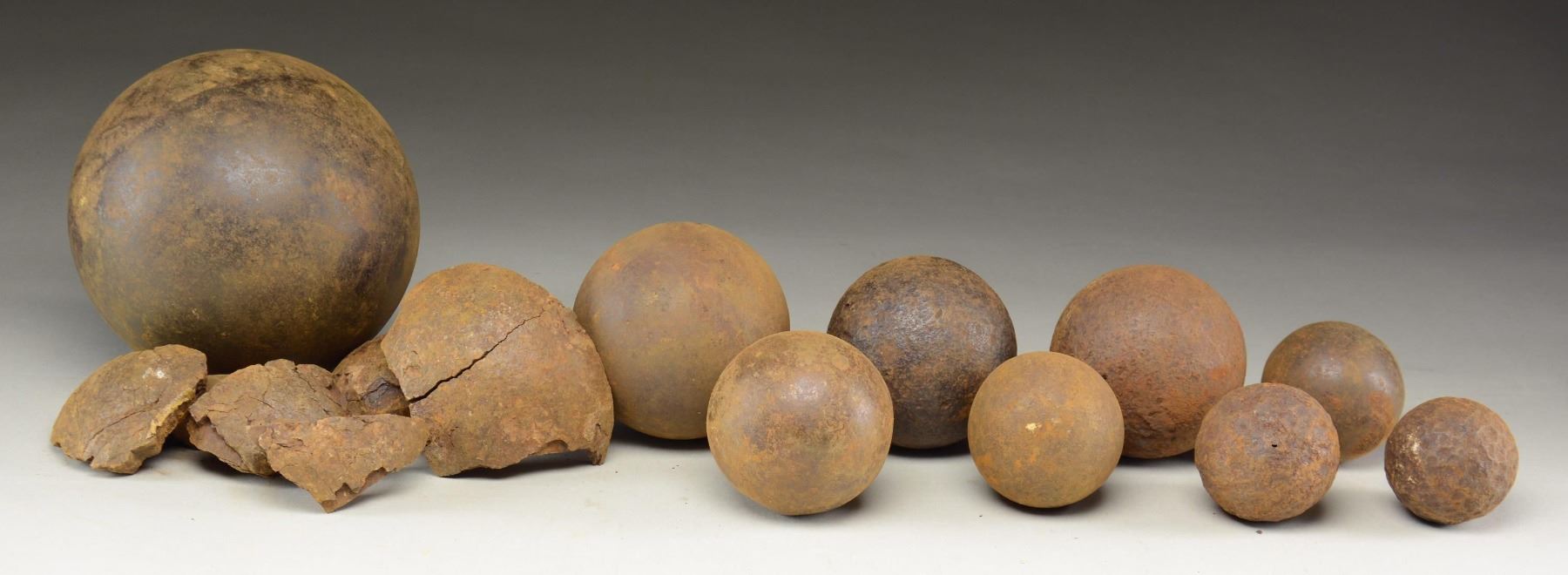 Group of 9 solid iron/steel balls ranging from about 3" to 6.5" in diameter. Several appear to be large naval grapeshot and rest unknown. Also accompanying lot are several large excavated Civil War shell fragments. CONDITION: rusted & pitted, but all sound. (02-23225/JS). NON-GUN. $200-400.