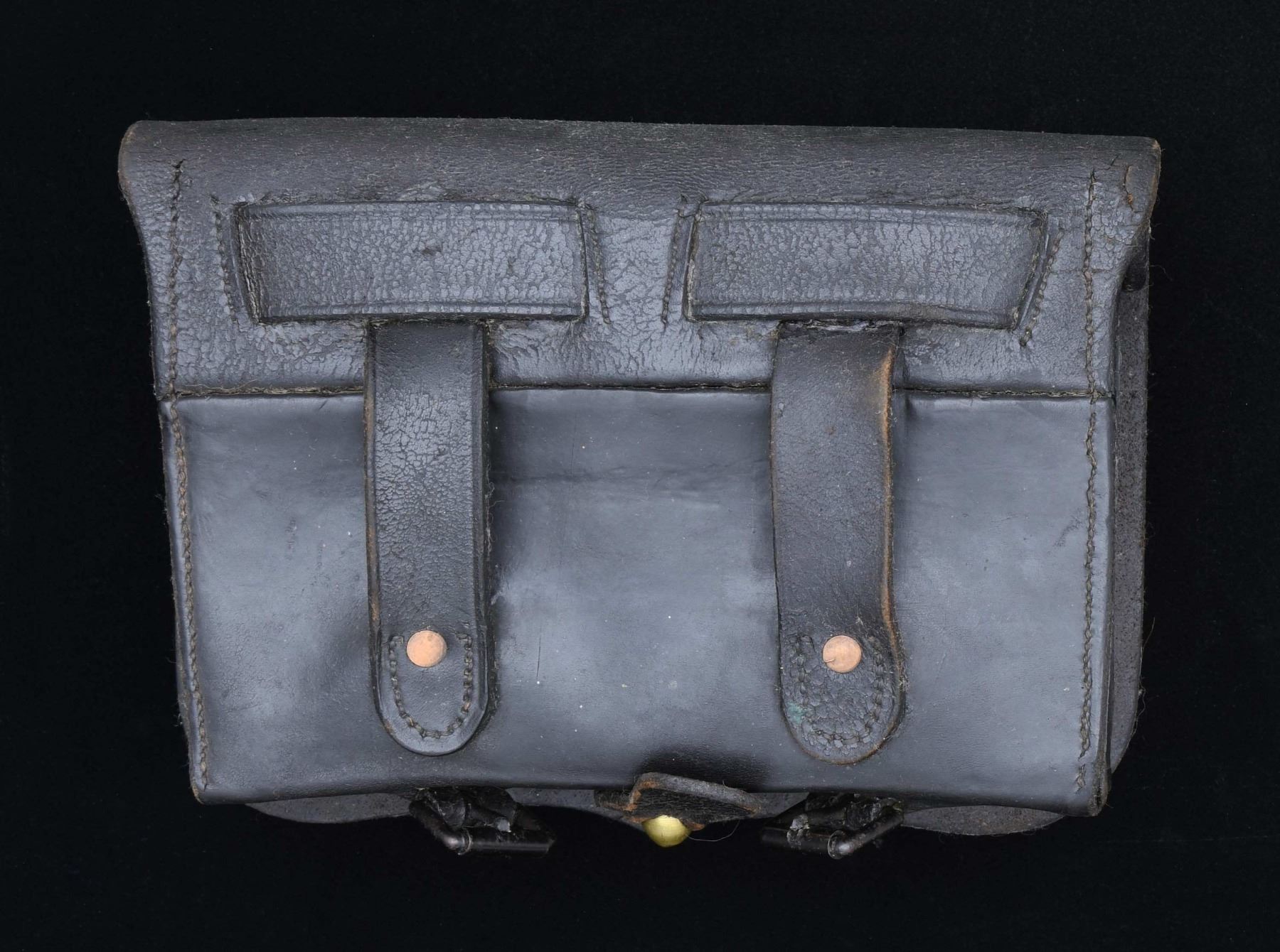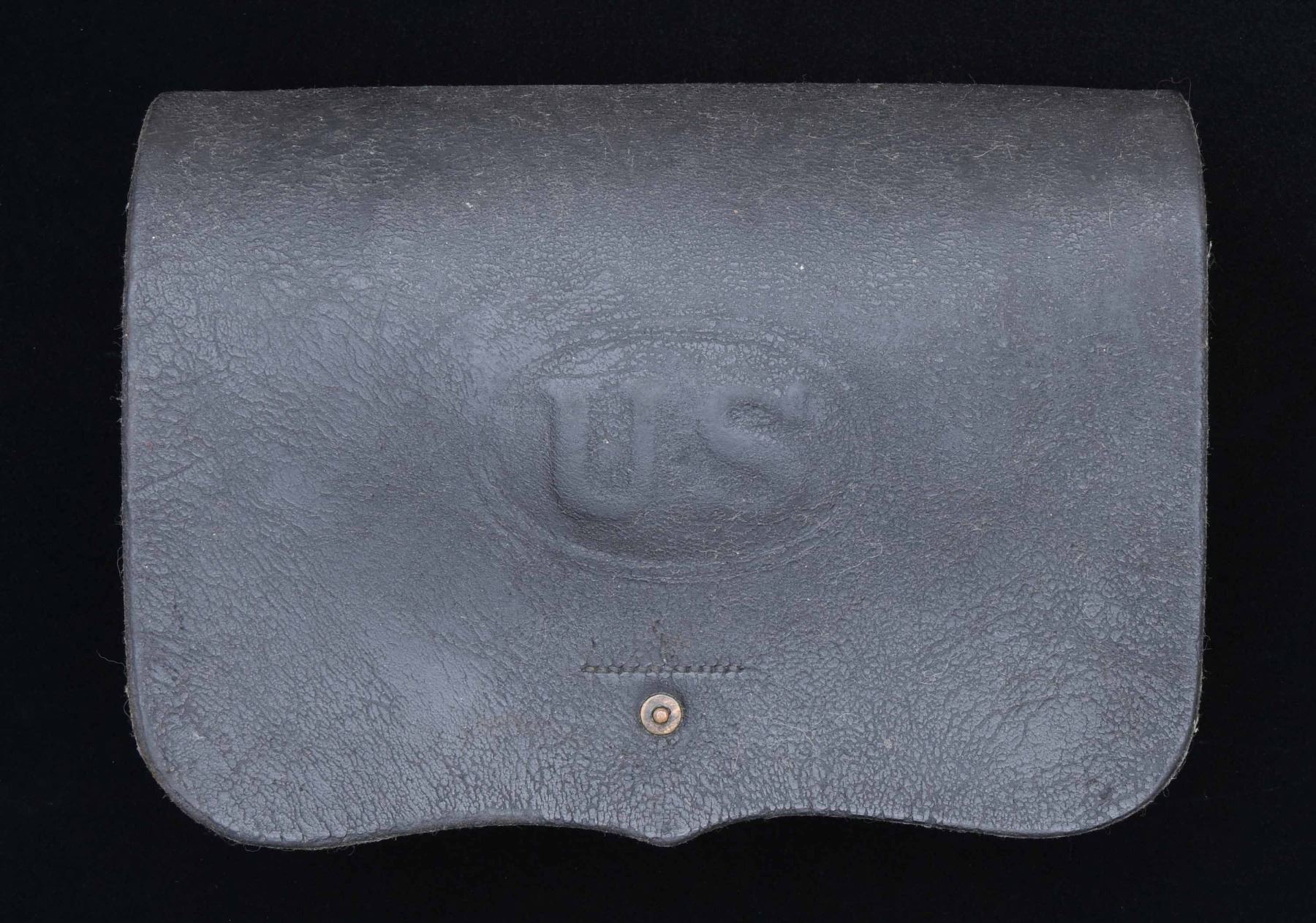 This is a scarcer example of an M1864 69 cal. cartridge box. The outer flap is impressed with a "US" in oval. The inner flap is marked "F.A. SNIFFEN U.S ORD. DEPT SUB INSPECTOR & R. NECE PHILADA." The interior has one original tin. CONDITION: box is quite solid, with both belt loops, buckles, and closing tab intact. Leather is a bit stiff with heavy crazing on the inside. (02-22939/BF). $300-400.