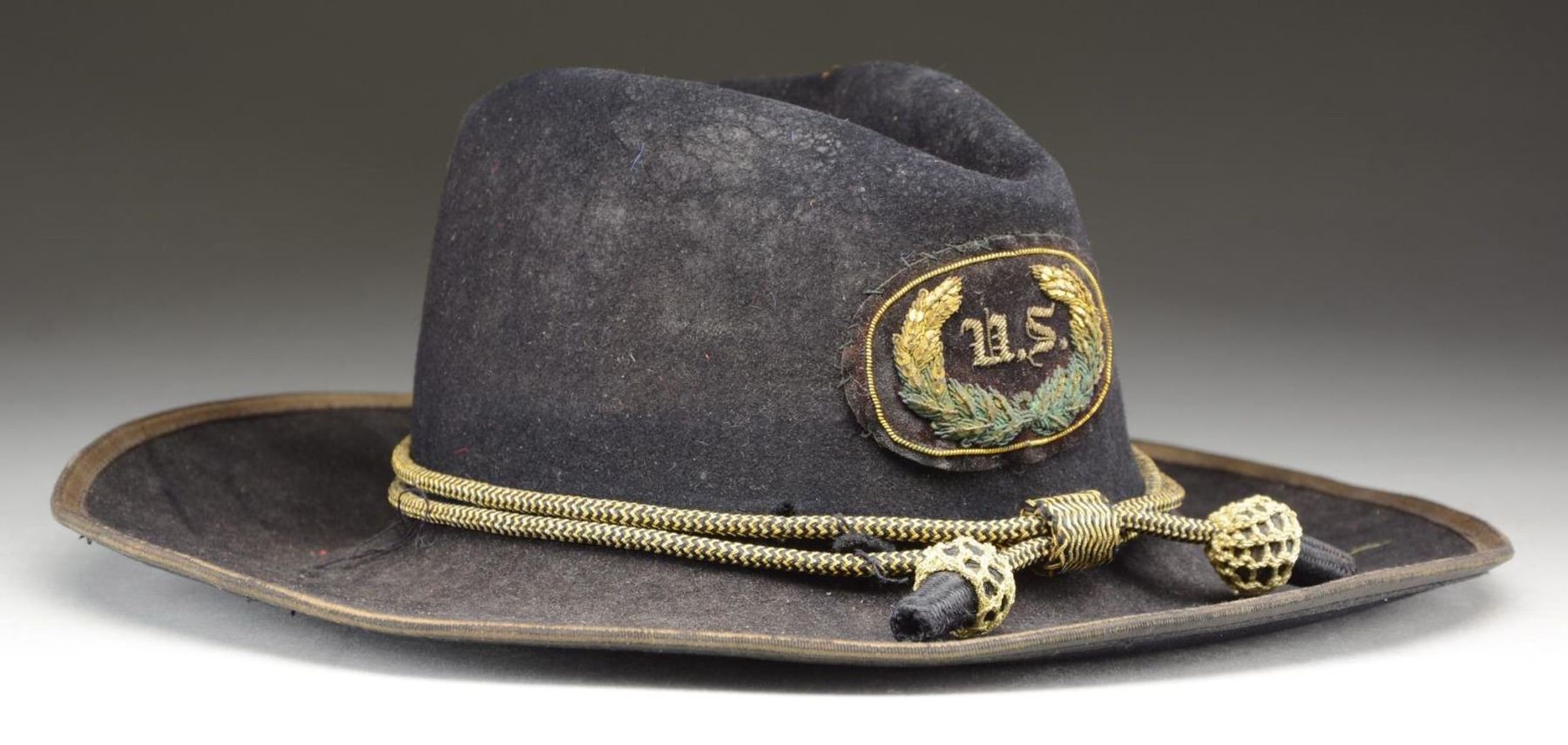 This hat likely dates from the middle of the 20th century. A Civil War-style reproduction hat cord has been added, as well as a reproduction bullion "US" in the wreath officer’s hat device. The black felt hat has a grosgrain edge binding and a brown leather sweatband. CONDITION: hat does show honest wear, likely from Civil War reenactment. There is some verdigris on the hat insignia and some sweat stains on the hat band. (02-22442/BF). $75-125.