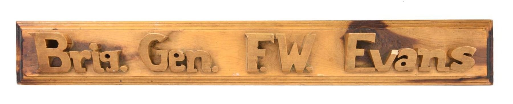 F.W. EVANS. A carved wooden name plate from the desk of General Evans, likely from when he was in charge of the Combat Cargo Taskforce. The plate reads "Brig. Gen. F. W. Evans". Evans was born in Lawrence, MA in 1898, and after attending Hobart College, he enlisted as a flying cadet in October of 1917. After completing Balloon School at Fort Omaha, NB, he was commissioned as 2nd Lt. in the Aviation Section of the Signal Officer’s Reserve Corps. CONDITION: desk plate shows light overall wear. (02-22368/BF). $50-75.