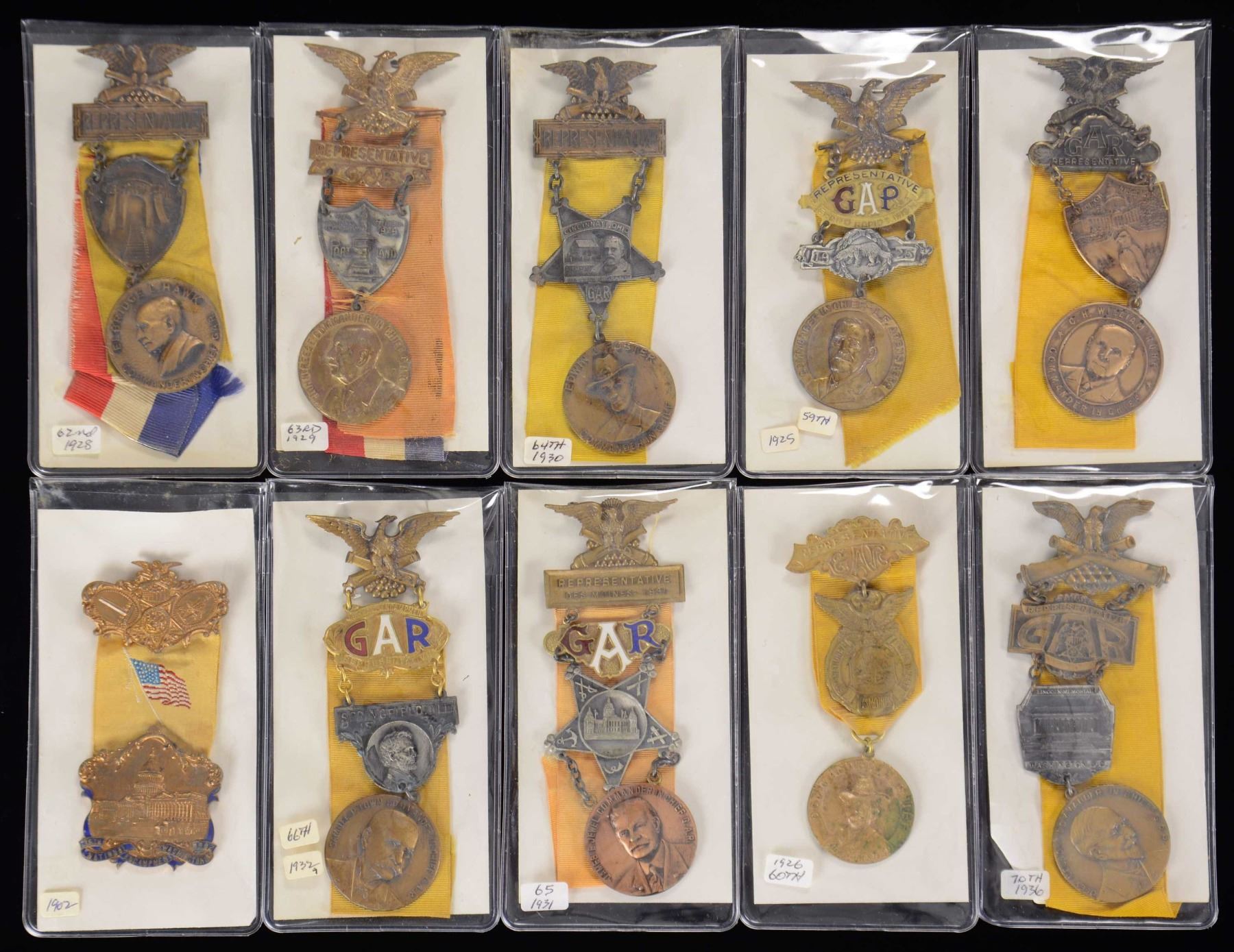 A fine group of 10 GAR National Encampment Badges with ribbons. Badges include Madison, Wisconsin 1937. / Washington, DC 1936. / Grand Rapids, Michigan 1935. / Cincinnati, Ohio 1930. / Portland, Maine 1929. / Des Moines, Iowa 1926. / Denver, Colorado 1928. / Springfield, Illinois 1932. / Des Moines, Iowa 1931. / Washington, DC 1902. CONDITION: most medals show very light wear; a few have very minor enamel damage. Some ribbons are slightly thread-bare. (02-22886-1/BF). $600-800.