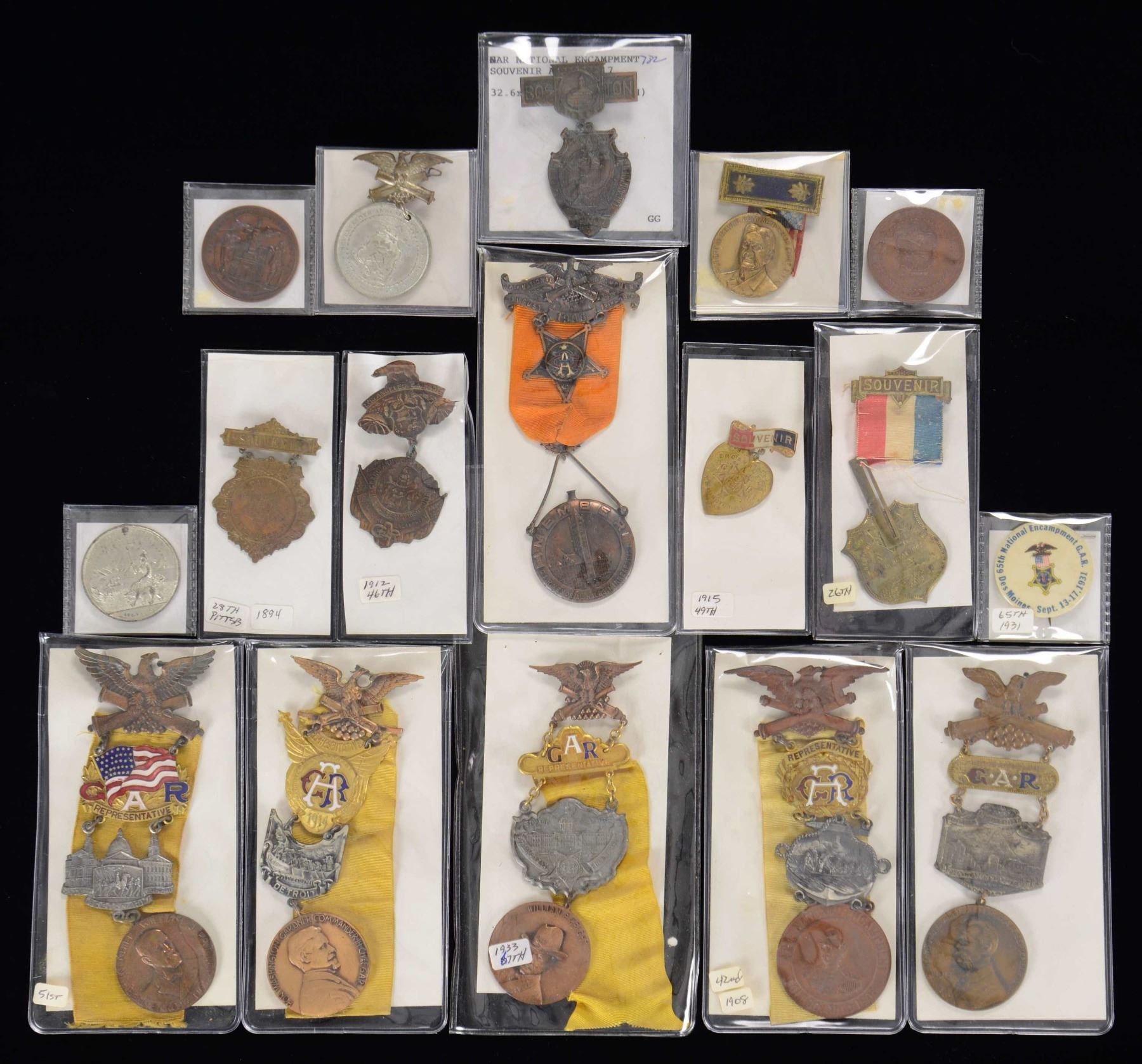 GAR MEDALS & PINS. A fine group includes 6 National Encampment Badges that include Minneapolis, Minnesota 1906. / Chattanooga, Tennessee 1913. No ribbon. / Saint Paul, Minnesota 1933. / Toledo, Ohio 1908. / Detroit, Michigan 1914. / Boston, Massachusetts 1917. This lot also includes 2 GAR desk medals. / 1 Pinback from 1931. / 1 Medal disc (no ribbon) from San Francisco in 1886. / 6 Other small GAR souvenir pinback badges. CONDITION: all items are complete and show light wear, except as listed above, and one of the small souvenir badges has a torn ribbon. (02-22886-2/BF). $450-650.