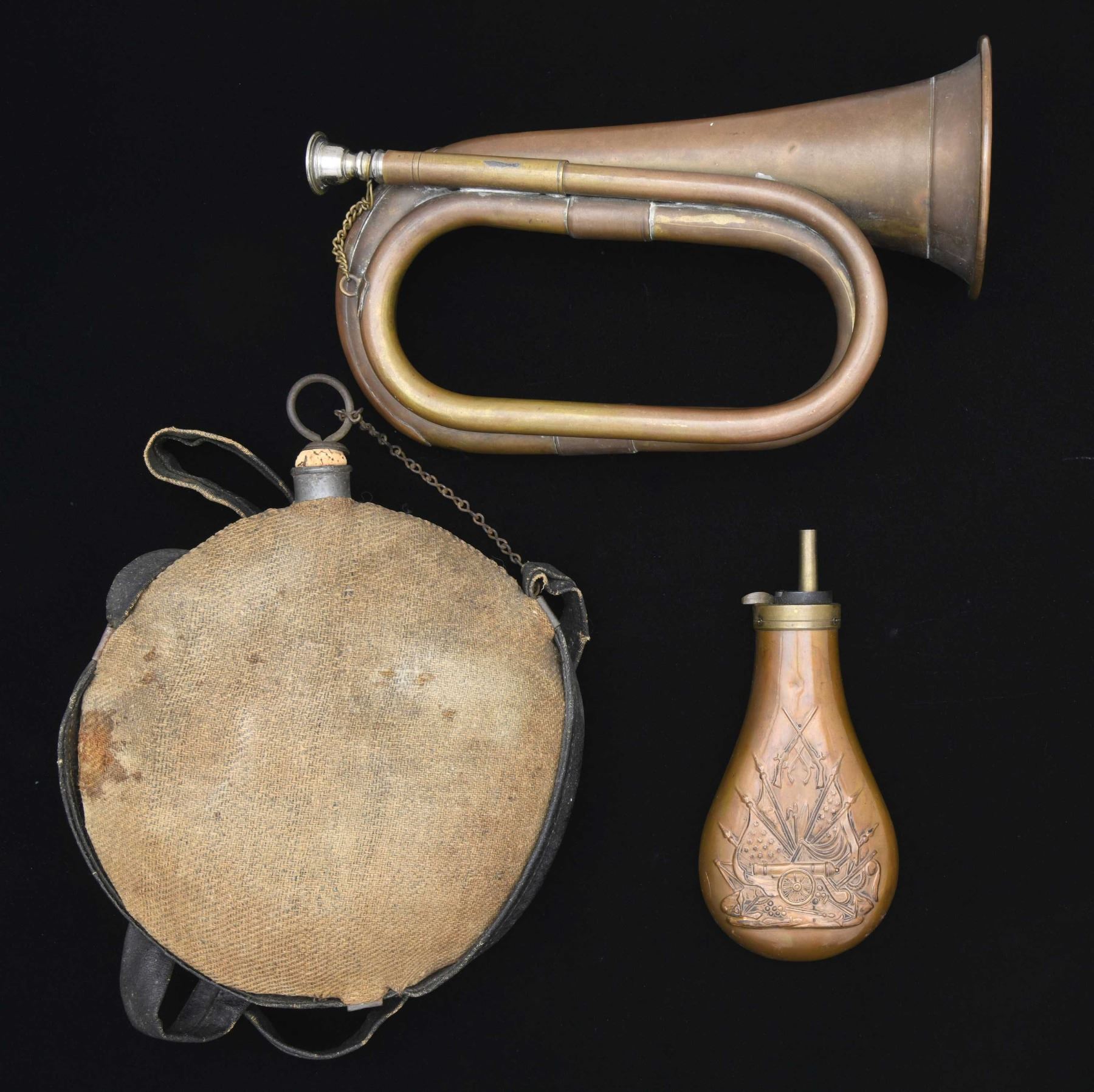 & POWDER FLASK. This lot includes 1 very fine Civil War union cloth-covered canteen with a pewter spout and tinned iron body. There are three strap guides on the edge of the canteen that support a very interesting tarred linen strap. There is a beige-brown wool cover and complete stopper and chain. / 1 Indian War period brass bugle with a plated mouthpiece attached with a chain. / 1 Reproduction patriotic powder flask showing a spray of flags with a cannon in the foreground. CONDITION: canteen shows minor wear but does have a few dents under the cover. Bugle and powder flask show light wear. (02-23282/BF). $300-500.