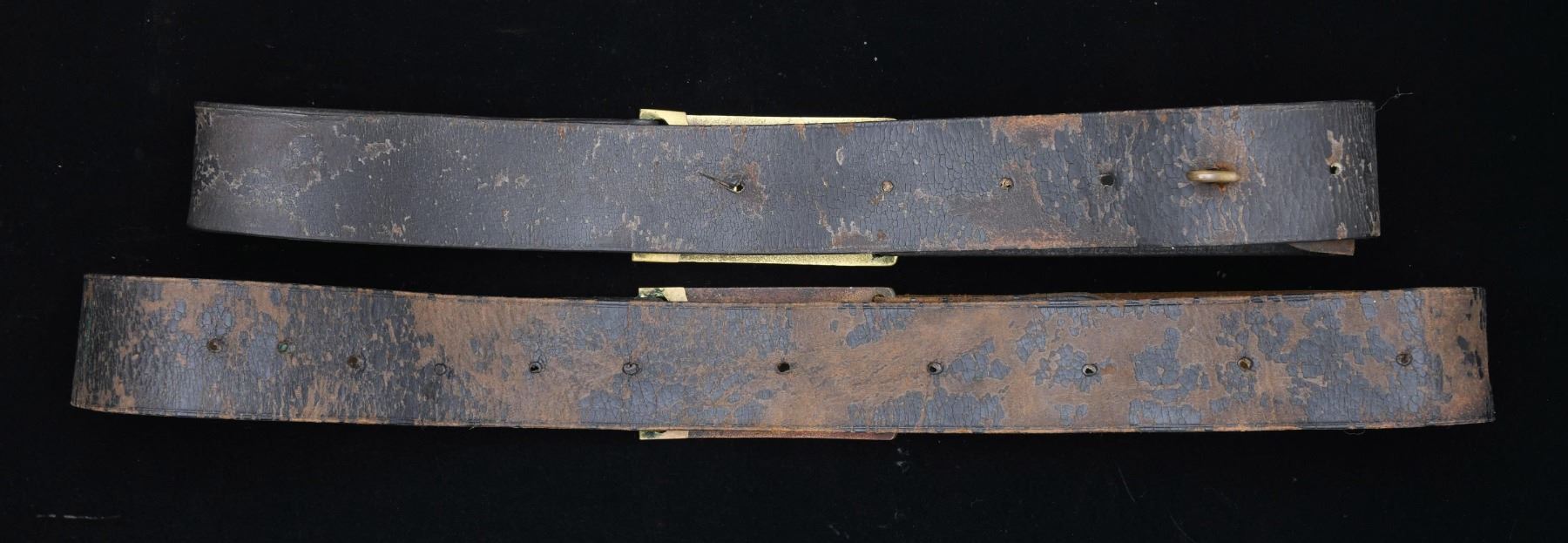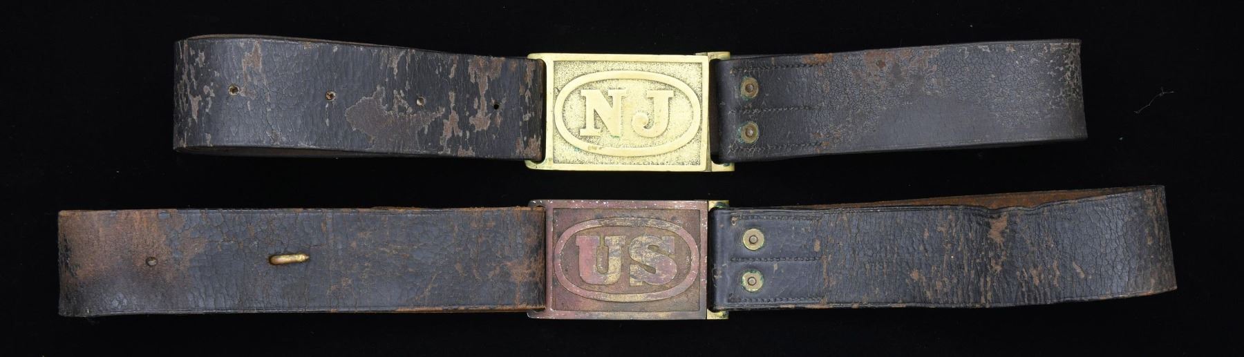 This lot consists of 1 M1874 belt and buckle featuring a brass, rectangular buckle showing "US" in an oval. / 1 M1874 belt and buckle featuring a brass, rectangular buckle showing an "NJ" in an oval. CONDITION: buckles show light to moderate wear. Belts show moderate to heavy wear with notable flaking. (02-23115/BF). $250-350.