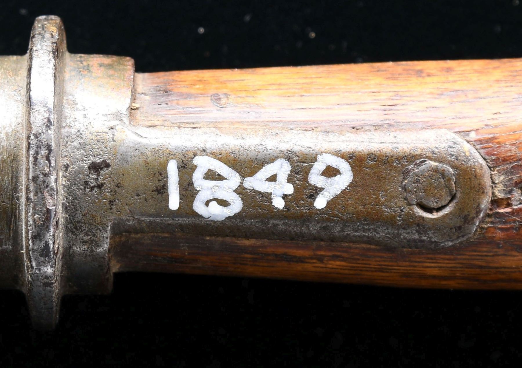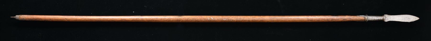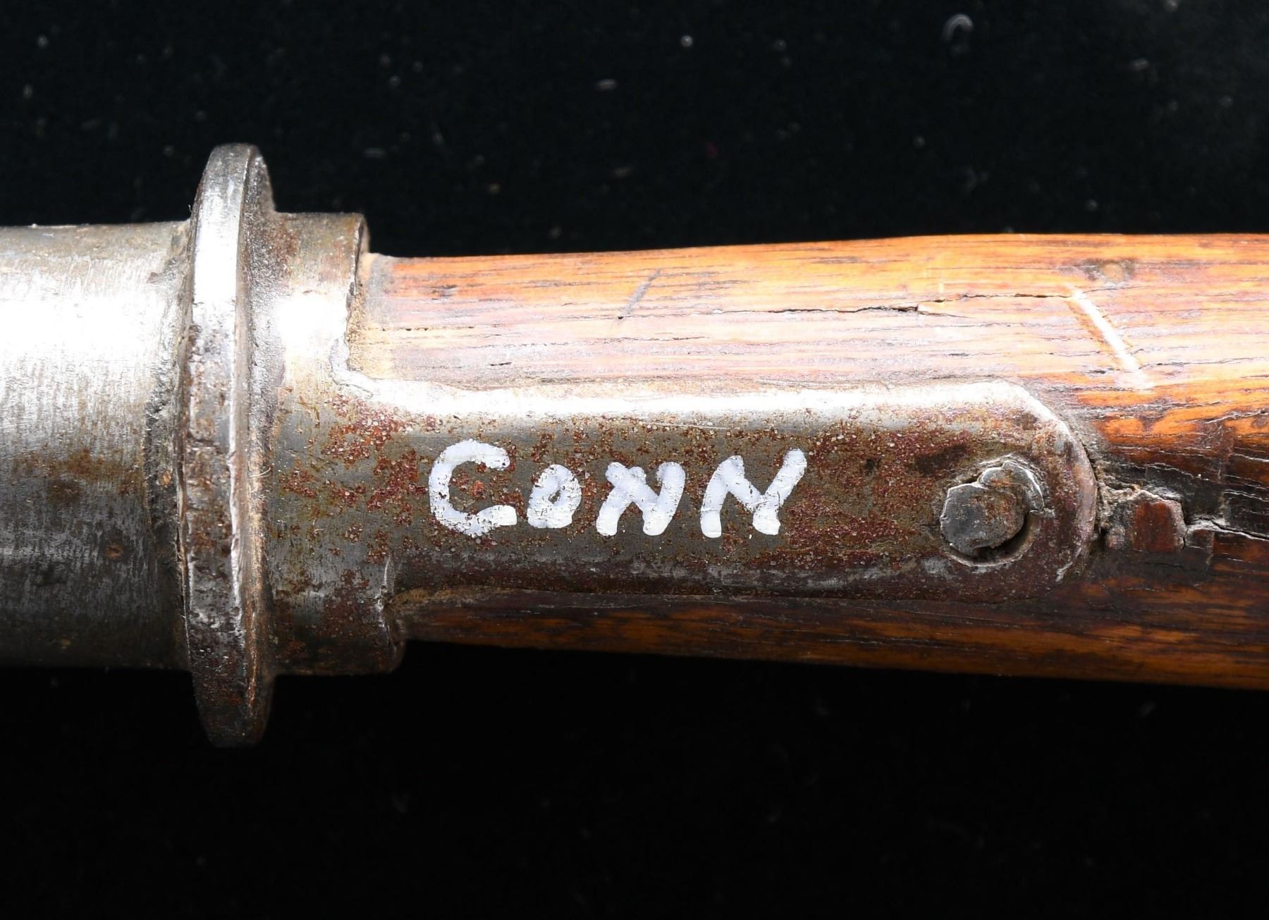 This spontoon measures 74" overall with an 11 1/2" head and a 6 3/8" blade. The head has a blade above a socket with a lower annular ring. Below the ring are short ears measuring 1 3/4". The full-length haft appears to be oak, and there is a ferrule and spike at the base. This spontoon comes with an oral history of being from Connecticut. The ears of the spontoon are marked "CONN" and "1849" in a manner indicative of a historical society. This spontoon, in our opinion, likely dates from the late 18th to the early 19th century. CONDITION: iron has a pleasing gray, lightly oxidized patina. Wood has an original, mellow patina. It does appear that originally the ears on the side were longer and possibly shortened at an arsenal. (02-23288/BF). $400-600.