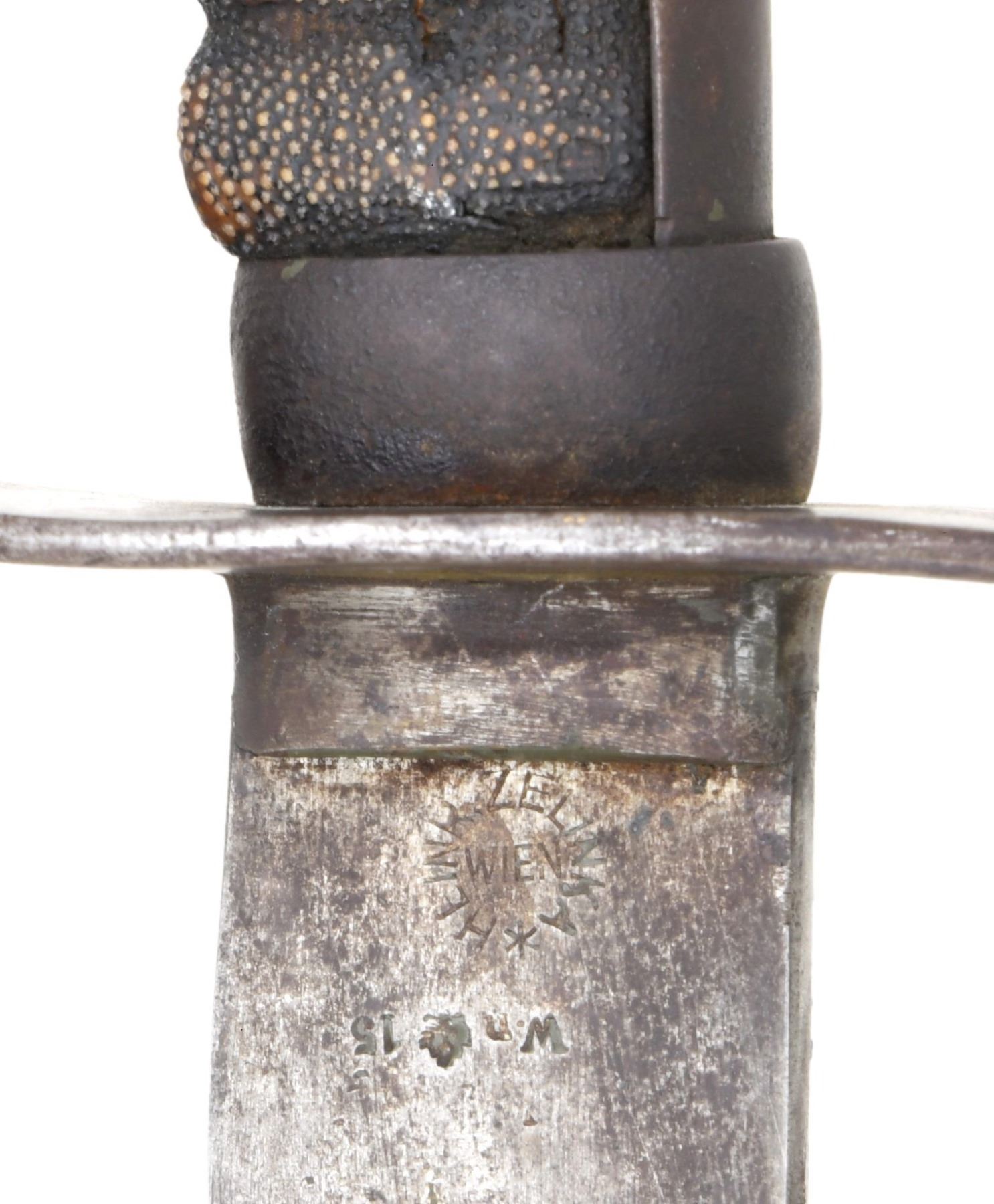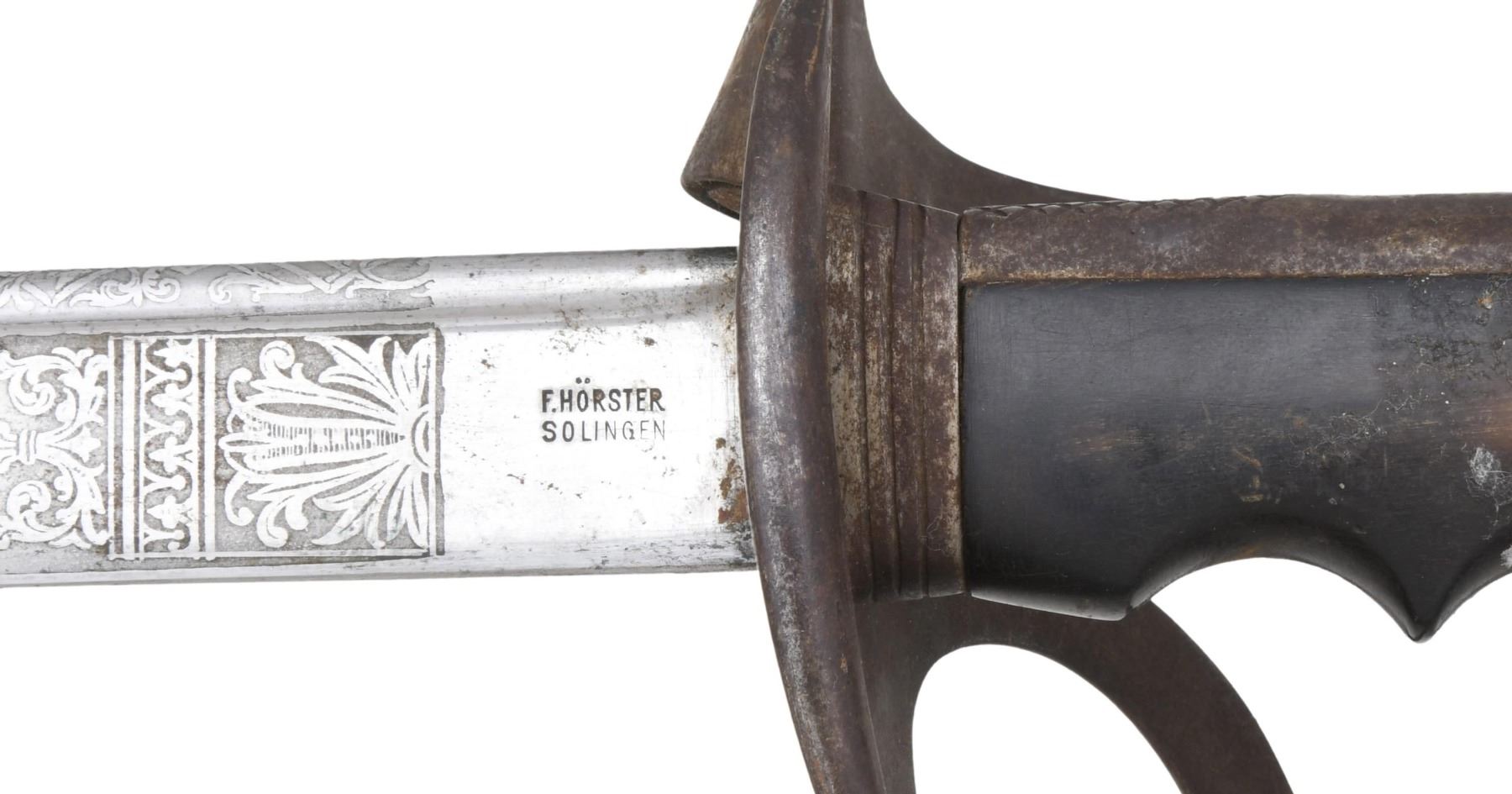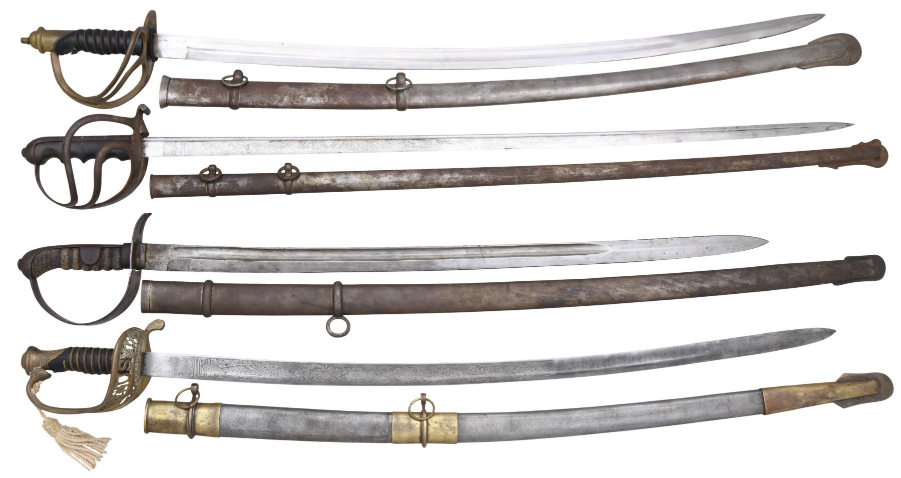 US CIVIL WAR SABERS. 1) An Italian M1888 saber measuring 42 1/2" overall with a 35 1/2" etched blade. The quillback blade is etched over the first 15" with various military, patriotic, and foliate motifs. The blade is stamped near the hilt "F. HORSTER SOLINGEN". Iron hilt with a 2-branch guard and finger-molded, black composite grip. Iron scabbard. CONDITION: blade has a medium gray patina. Hilt and scabbard have a dark patina but show no damage. 2) A good Imperial Austro-Hungarian cavalry saber measuring 41" overall with a 30 1/2" blade. Blade has a single, medium fuller and is marked at the ricasso "HEINR, ZELINKA * WEIN" with Austrian proof marks. Plain iron hilt with a slot between the blade and the quillon. Plain backstrap with ears and a sharkskin grip. Iron scabbard. CONDITION: blade has a medium gray patina. The hilt and scabbard both have a dark gray/brown patina. Grip is complete and shows no wire. 3) A reproduction US M1860-style cavalry saber. Overall length: 42 1/2". Blade length: 34 1/2". Brass hilt with a 2-branch guard and a securing nut at the pommel. Wire-wrapped black leather grip. Iron scabbard. CONDITION: light wear overall. Grip leather has begun to separate. 4) A reproduction US M1850-style staff and field officer’s sword with an overall length of 41" and blade length of 33". The blade shows etched decoration, including patriotic, military, and foliate motifs. Gilded brass hilt with pierced foliate guard that includes a large "US". Wire-wrapped leather grip. Brass-mounted iron scabbard. CONDITION: light wear overall. (02-23217-2/BF). $500-650.