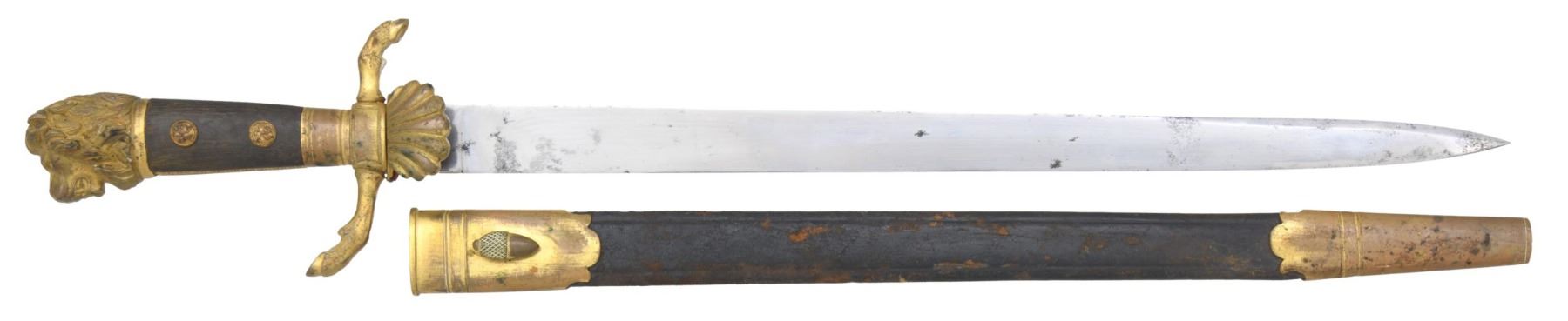 Overall length: 23”. Blade length: 17 3/8”. Plain blade with a knight’s head mark on the ricasso. S-shaped guard with hooved quillons and a downturned, scalloped guard. Two-piece horn grip with two gilded brass rivets. Superbly articulated, gilded brass lion’s head pommel. Gilded brass-mounted leather scabbard with acorn frog stud. CONDITION: blade shows some original factory polish. Hilt retains 70% of its original gilded finish. Scabbard mounts show about 50% of their original finish. Leather is dry but remains strong. (02-22962-1/BF). $300-450.