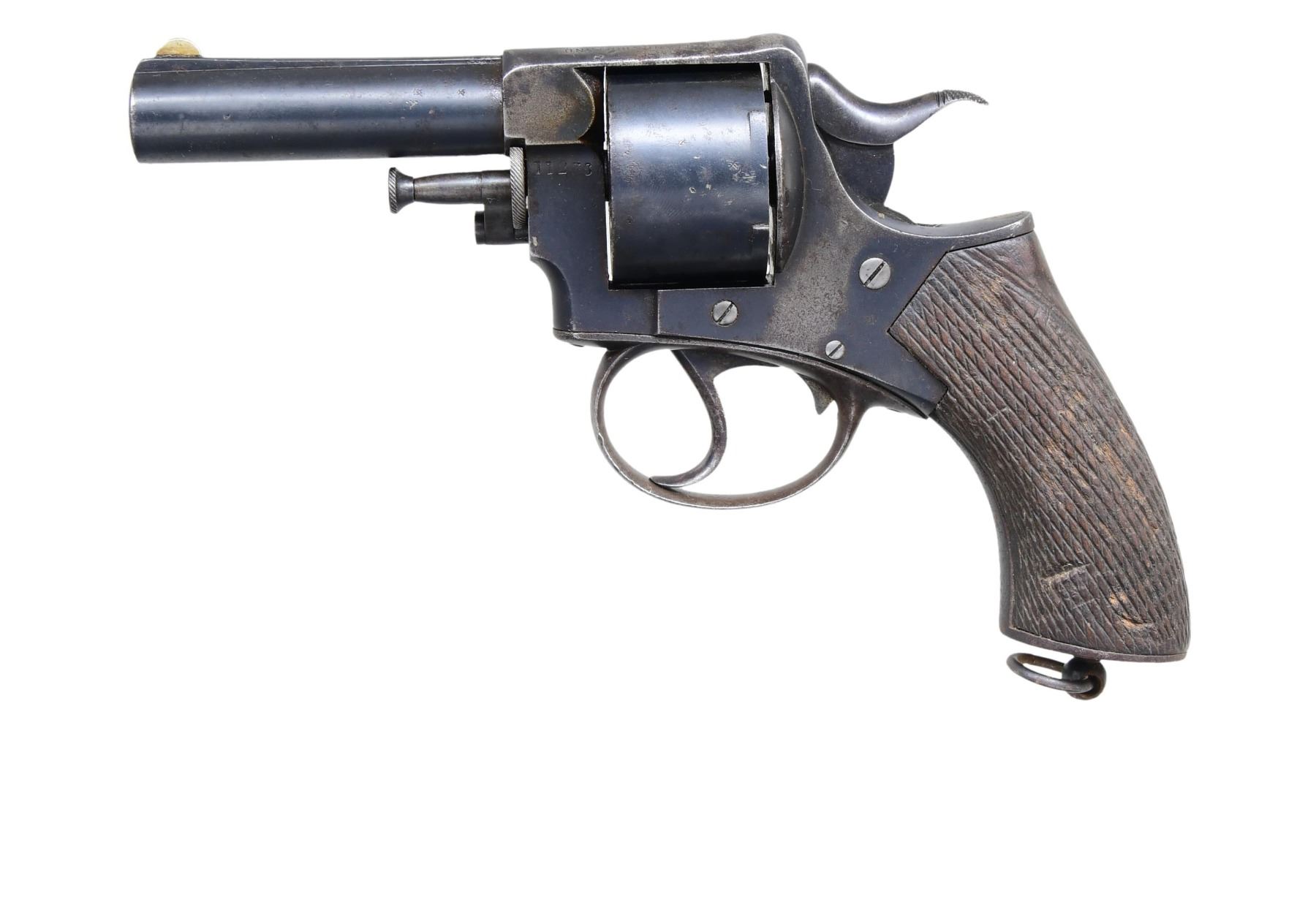 DA REVOLVER. Cal. 455 Eley. S# 11236. Features include a blued finish, 3.625-inch barrel, fixed sights, standard trigger, and hammer. Butt has lanyard ring. The cylinder holds 6 rounds and is not fluted. The grip is checkered wood. CONDITION: Overall fair condition with approximately 60% of the reblued finish remaining on the barrel and frame. The grips show wear & gouges. The bore is good with some wear but retains clear rifling. (01-25845/MD) ANTIQUE. $300-500.