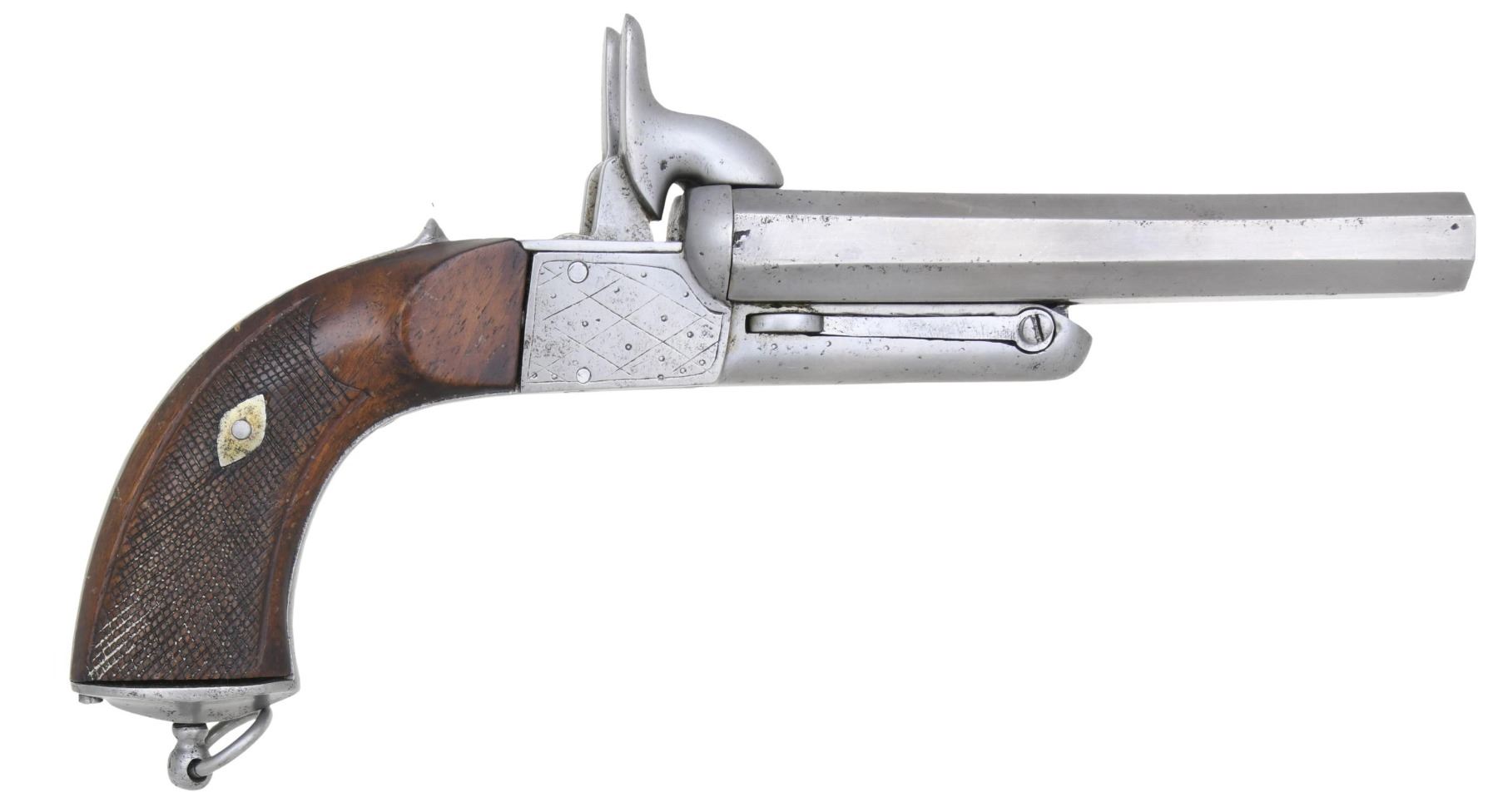 Cal. 60 Pinfire. NSN. Bbl. 5 3/8". Double bbl. pinfire break-action pistol produced by an unknown mfg. Pistol is virtually unmarked, save for some light decorative engraving on the frame. Metal components have been cleaned and are in-the-white. Frame is mounted with 2-piece checkered wood grips. Lanyard loop is present on butt. CONDITION: metal components are bright, exhibiting areas with varying degrees of pitting overall. Bores exhibit areas of dark pitting while retaining good rifling throughout. Grips show some smoothing, as well as some scattered marks and nicks from handling and storage, but otherwise remain sturdy and serviceable. (01-25999/MLW). ANTIQUE. $250-400.