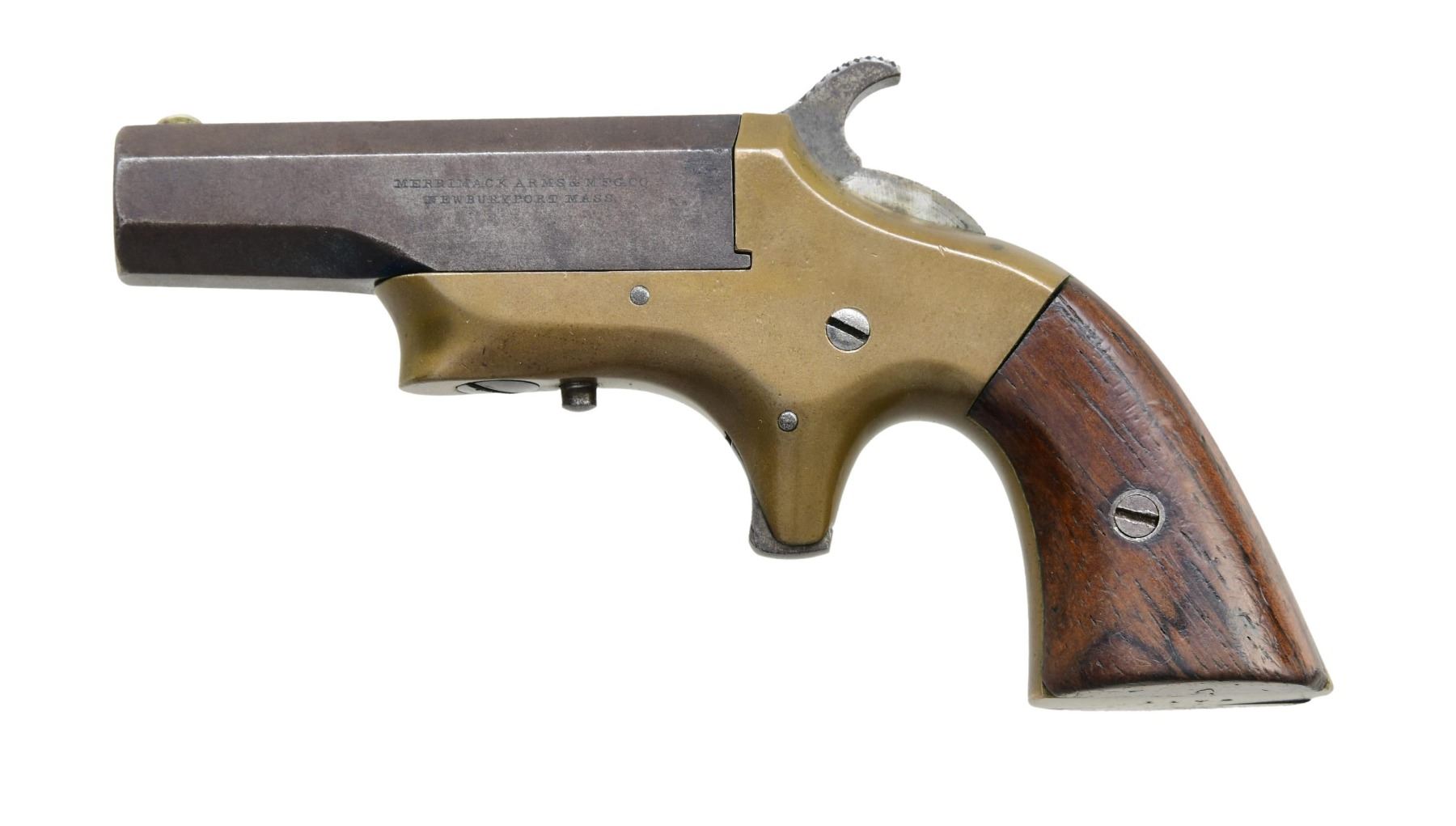 DERRINGER PISTOL. Cal. 41 RF. S# 1172. Bbl. 2 1/2". Southerner single-shot derringer pistol mfg. in Newburyport, MA by Merrimack Arms & Mfg. Co. Left flat of the faceted bbl. is marked with Merrimack Arms' mfg. information, with "SOUTHERNER" marked across the top flat. Brass frame is fitted with 2-piece smooth wood grips. German silver blade front sight. All numbers are matching and include the frame, bbl., extractor, as well as the grips (on the interior of the panels). CONDITION: brass frame exhibits a pleasing mellow brown patina, with some small scattered spots of age-related discoloration overall. Steel components retain scant traces of their original factory blue finish, with the balance exhibiting a gray patina and with light to mild surface pitting present overall. Bore is bright, exhibiting scattered areas of dark pitting while retaining well-defined rifling throughout. Grips show some scattered handling marks but otherwise remain sturdy and serviceable. Left grip panel exhibits some staining towards the butt, but is otherwise fine. PROVENANCE: from the collection of a Tennessee gentleman. (01-25687/MLW). ANTIQUE. $700-900.