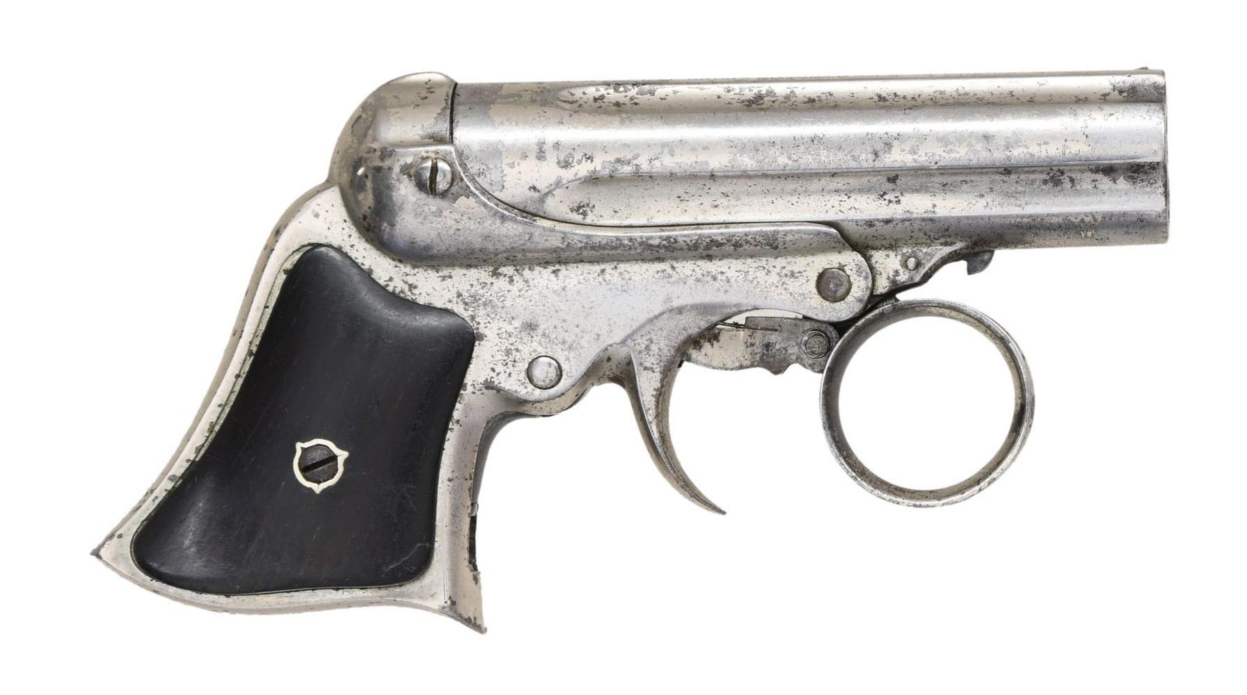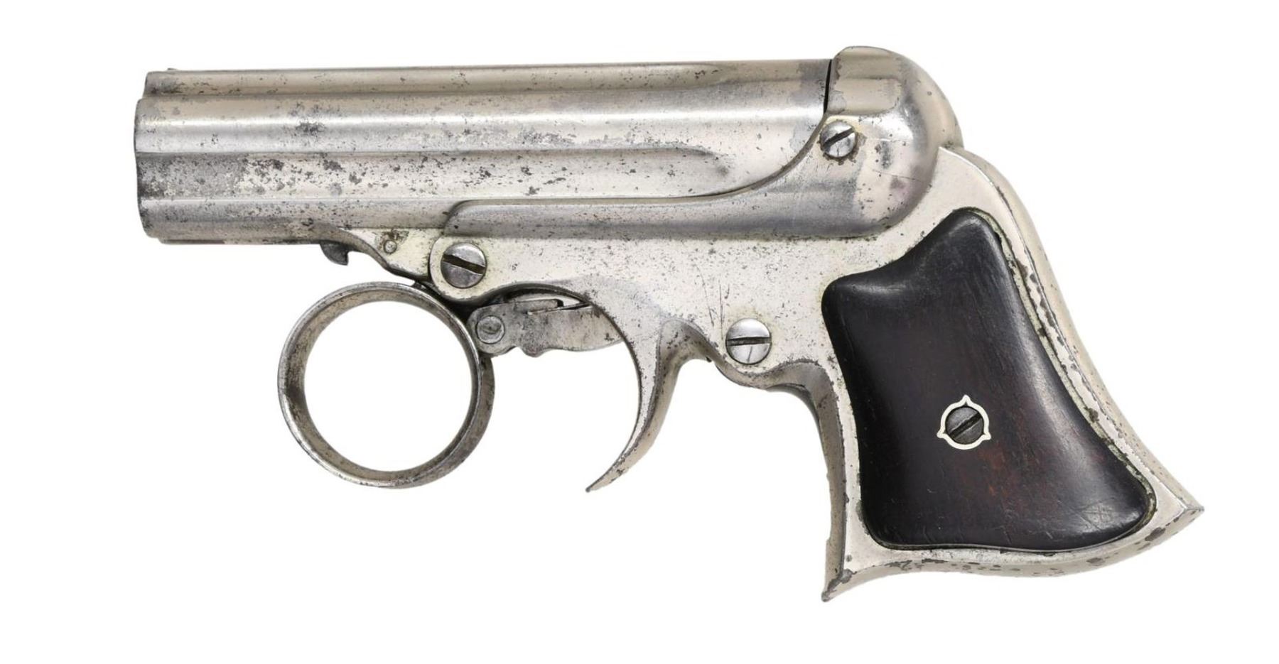 Cal. 22 Short. S# 2303. Bbl. 3" five-shot, fluted cluster. Bead sight. Action features a ring-type trigger & revolving firing pin. Bbl. group tilts forward for loading. Full nickel finish. Two-piece rosewood grips. CONDITION: 60% nickel finish, showing spotted corrosion and light pitting. Grips show light wear & marks. Sound action. Dark, pitted bore. PROVENANCE: From the lifelong collection of Jerry Senter. (01-24883/DS). ANTIQUE. $400-600.
