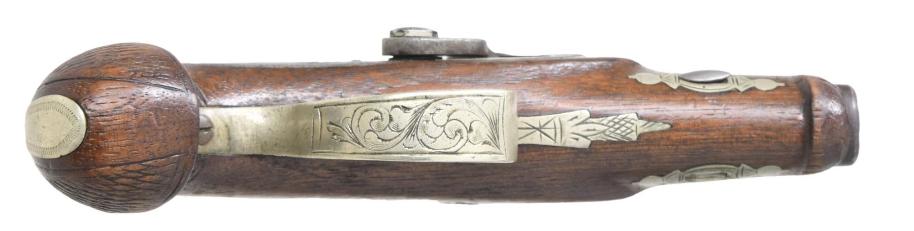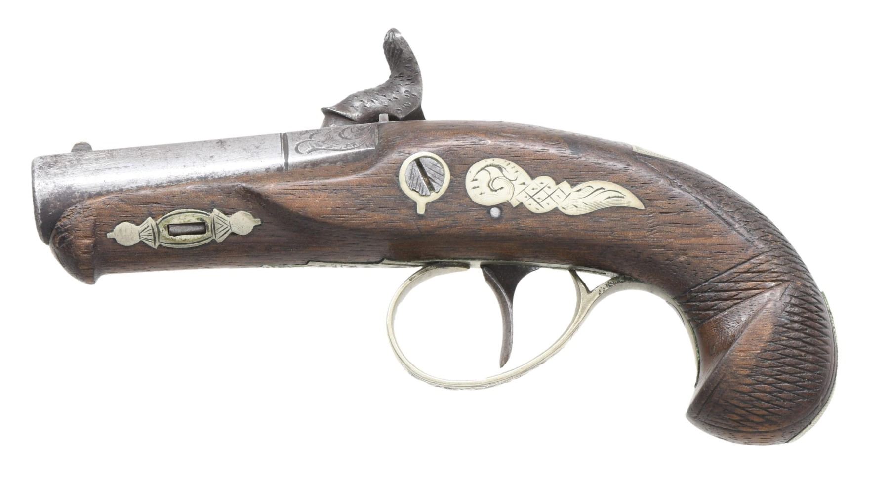 Cal. 41. NSN. "Per Flayderman's Guide to Antique American Firearms", Dering imitations are encountered with misspelled markings, such as "DERINGE" that is marked on the 2.5" barrel of this pistol. It's a imitation of a Henry Derringer pistol with ornate engraving on back action lock, barrel, and German silver inlays on checkered stock. CONDITION: barrel and lock has a gray patina appearance with light pitting. Hammer screw is a replacement. Good, worn stock with marks and small cracks throughout. Dark bore. (01-25470/MD). ANTIQUE. $400-600.