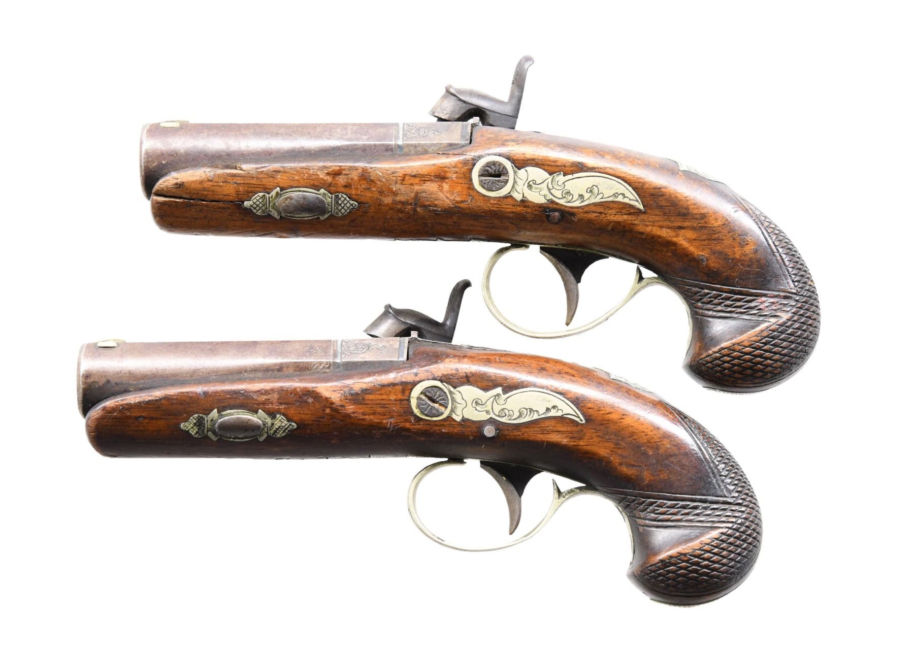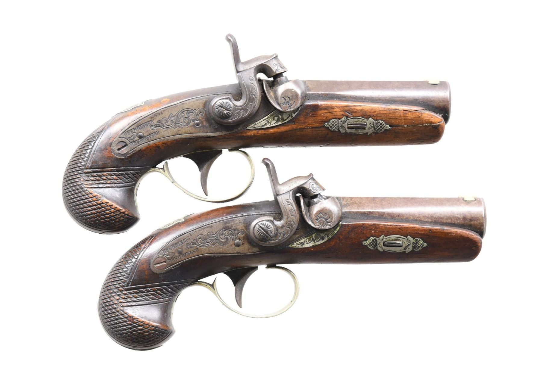 Cal. 44. NSN. Bbls. 3". Matched pair of percussion derringer pistols. Lockplates are marked "DERRINGER" twice, with "DERRINGER" also stamped over the top flat of the breeches. Lockplates, cocks, bolsters, breeches, and tangs exhibit decorative scroll pattern engraving. Checkered wood stocks with engraved German silver hardware are stamped "76" just ahead of the trigger guard's pineapple finial. Dovetailed German silver blade front sight, with iron V-notch rear sights. CONDITION: iron components retain mottled brown and gray patinas, with some scattered spots of dark surface oxidation and age-related discoloration present overall. German silver hardware shows age-related discoloration but otherwise presents nicely. One pistol does not hold at full cock. Stocks show some wear to their varnish and scattered superficial marks and dings from handling and storage. One pistol exhibits a crack on either side that stems from the forend tip. PROVENANCE: from the collection of a Tennessee gentleman. (01-25704/BH). ANTIQUE. $800-1,200.